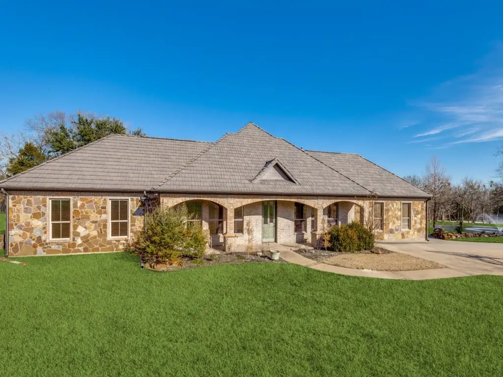 A Private Oasis in Twelve Oaks Estates: Your Yellowstone-Inspired Ranchette! This one of a kind Luxury Custom and Guest House - Peaceful and Private living in Twelve Oaks, situated on 3.45 acres with a private pond & fountain. Spectacular drive- up, as the main home, is perched over a beautiful private pond with fountain, a park-like setting surrounded by trees. From the full circle driveway, a hitch for your horses and stone steps lead up to the full covered porch and commanding double doors. Multi-Generational w Full Guest House in Twelve Oaks Estates on 3.45 acres. The Best of Both Worlds- living in south Celina and in Prosper ISD. Designed for Entertaining with a 1st Floor MEDIA includes screen, projector & stadium seating. The Living has 2 story high tall windows, stacked stone fireplace, flanked with stone shelves and a full bar. Appointed with custom millwork, moldings & polished concrete floors. Primary suite has a fireplace, exercise room. The spa-like Bath has vessel sinks, granite counters, huge shower, & sauna. The 2nd Bedroom down has a full bathroom. Upstairs leads to an amazing landing & balcony with two split Bedrooms each w ensuite baths,+ a fun Flex-living space. Resort living-lagoon Pool, Spa, Firepit, Octagonal covered Gazebo with a stone mantled fireplace and hearth Multiple patios, space for Horses to roam, kids to play soccer & fish at your private pond. MECHANICS: DaVinci 50 yr Roof Class IV Rating, Radiant in the attic for energy efficiency - main house. New Spa Heater installed - 2025, the private Pond- recently upgraded deep well for outdoor irrigation- a huge savings on water. Lot -3.45 acres - dimensions-374 ft x 383 ft, City of Celina Water and trash service for the home.*Where else can you find a near square interior lot with 3.45 acres, with both a Luxury Home, Separate Guest House, Resort Pool, Spa Gazebo, plus allow Horses? It's all about the Land Celina & Prosper ISD - Walnut Grove High.