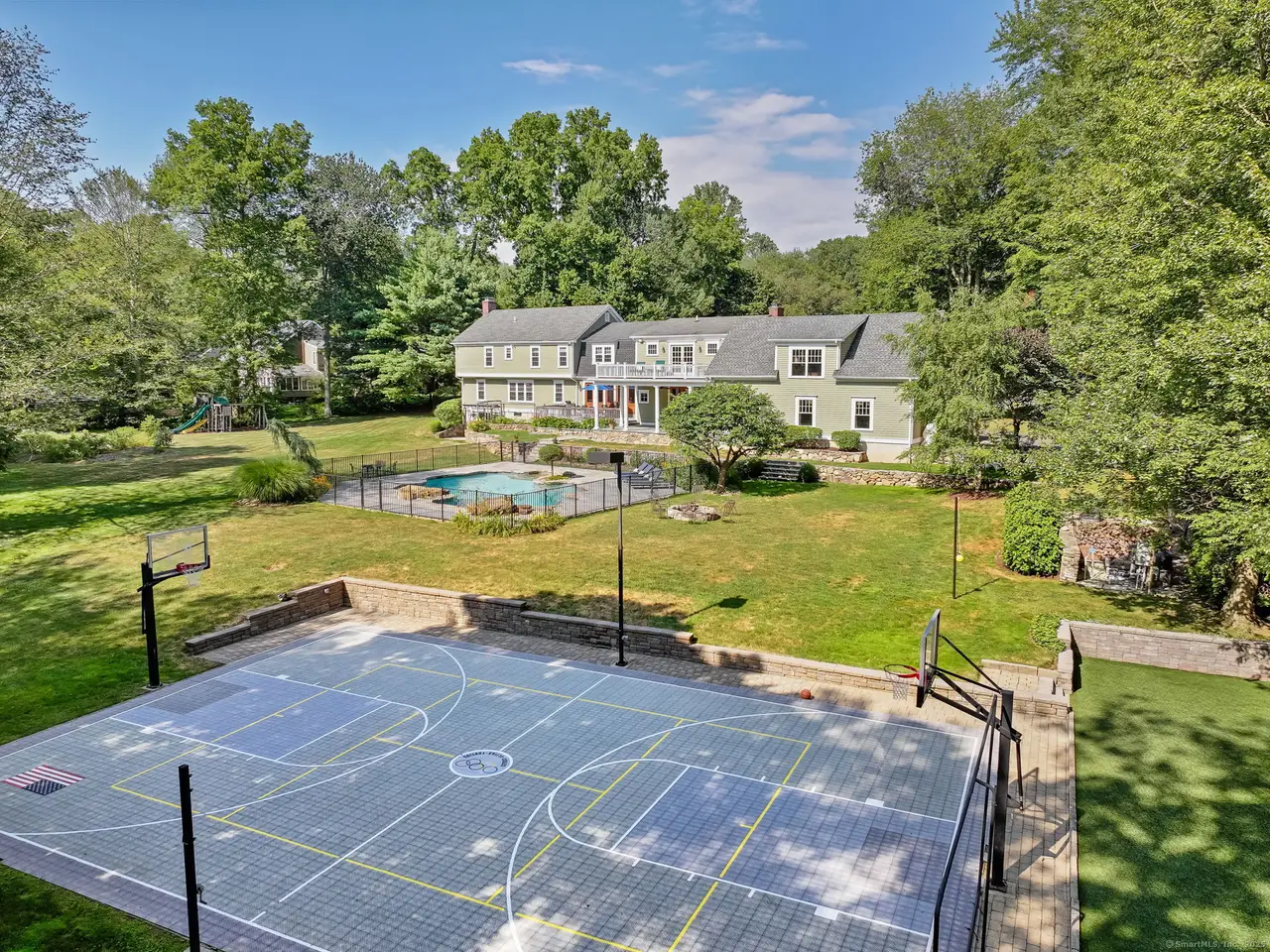 Welcome to 545 Shrub Oak Lane, an expanded Colonial on 2 private acres in Greenfield Hill. This home sits on a beautifully flat front yard that enhances its curb appeal. Fully renovated in 2012, the family room and oversized kitchen is the heart of the home. The custom designed kitchen has an 10 foot mahogany island with granite countertops, walk-in panty, and mahogany wood framed glass doors that create a seamlessly indoor-outdoor experience. The first level offers a formal living and dining room, an office and an expanded mudroom. Upstairs, the primary suite includes french doors to a private deck, a steam shower, a jacuzzi tub, walk-in closet, and a separate sitting room. Four additional bedrooms, two baths, and laundry room complete the upper level. The lower level offers a rec room, extra laundry, an office and ample storage. The oversized three-car garage with unfinished bonus space above is ideal for a in-law suite or future expansion. Outside is an entertainer's paradise, a custom designed lagoon-style pool with diving rocks, multiple bluestone patios, an elevated covered patio, two mahogany decks and an incredible recreational setup, including a full-size lighted basketball court, a turf area for bocce ball/batting cage, fire pit and more!