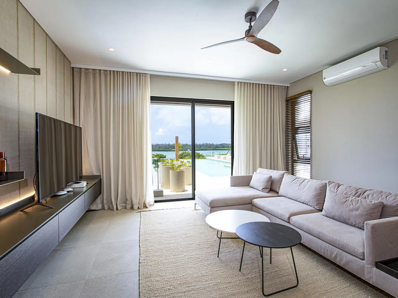 Perched gracefully on a generous 2,079 m² down-slope plot in the coveted Rive Est neighborhood of Anahita, this newly built 445 m² villa is a statement of refined island living. Nestled among the northern parcels and just moments from the lush tropical gardens of Rive Est Park, with its private pontoon offering effortless passage to the turquoise lagoon, the property embodies the very essence of exclusivity and sophistication. Every element of its architecture embraces the land’s natural contours, allowing each space to frame mesmerising vistas of the shimmering lagoon and the legendary Île aux Cerfs. On the upper level, sunlight dances across a bright, open living and dining area, where an elegant kitchen flows onto a wide terrace. Here, an infinity pool appears to melt into the horizon, while a barbecue and bar set the stage for effortless soirées. A stylish TV lounge with integrated office space and a generously proportioned en-suite bedroom complete this refined space. Descending to the garden level, three serene en-suite bedrooms open directly onto manicured tropical grounds, where the scent of frangipani drifts in the air. Discreet storage solutions ensure both practicality and elegance remain in perfect harmony. Infused with the charm of chic tropical décor and finished to the highest standards, this villa is more than a home—it is a gateway to Anahita’s celebrated coastal lifestyle, where each day is bathed in light, framed by sea, and defined by pure tranquility.