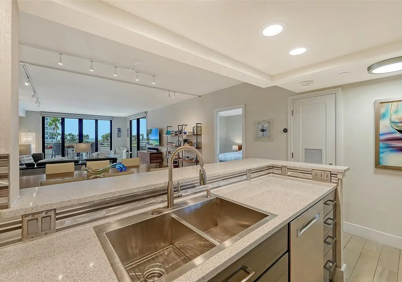 Welcome to luxury Gulf-front living at The Players Club. This sophisticated three-bedroom, three-bathroom end-unit condominium offers unobstructed Gulf views from two spacious covered balconies. Its thoughtfully designed floor plan maximizes vistas and natural light across an expansive interior. The residence has undergone a comprehensive renovation, featuring a modern kitchen outfitted with custom cabinetry, quartz countertops, a center island adorned with stainless steel and espresso wood base cabinets, as well as a contemporary tile backsplash and high-end appliances. Additional upgrades include new porcelain plank flooring, freshly painted walls, updated baseboards, designer window treatments, and enhanced lighting throughout. All bathrooms have been beautifully updated with new cabinetry, countertops, tile, and premium fixtures. The great room layout with two master suites, each providing water views and private access to the extended terrace. Impact-resistant windows and sliding doors have been installed to comply with the latest building codes. For convenience, the unit includes both an assigned under-building parking space and an enclosed garage, accompanied by an external storage room. The Players Club demonstrates a commitment to excellence with recent engineering and reserve studies, ensuring ongoing community stability and maintenance. Elevator systems have been modernized and certified. The association maintains fully funded reserves for long-term reliability. Spanning 11 pristine Gulf-front acres on Longboat Key, this private community offers unparalleled amenities. Life at The Players Club is defined by luxury and leisure. Residents enjoy a newly renovated clubhouse equipped with a state-of-the-art fitness center, library and meeting room, catering kitchen, various gathering spaces, four Har-Tru tennis courts with pickleball capabilities, a 70-foot heated saltwater pool and spa, putting green, fire pits, outdoor grills, lushly landscaped grounds, deeded beach access, and the assurance of 24/7 gated security and on-site management. Players Club is ideally situated near the new St. Regis Resort, with optional membership available at The Longboat Key Club & Resort, granting privileged access to golf, dining, tennis, and the only deep-water marina on the island. Beyond the community, residents benefit from proximity to local conveniences, including Publix, CVS. and boutiques within two minutes, and the upscale shops and restaurants of renowned St. Armands Circle just five minutes away. The famed cultural amenities, many fine dining options, and shopping in downtown Sarasota is just 15 minutes from The Players Club.