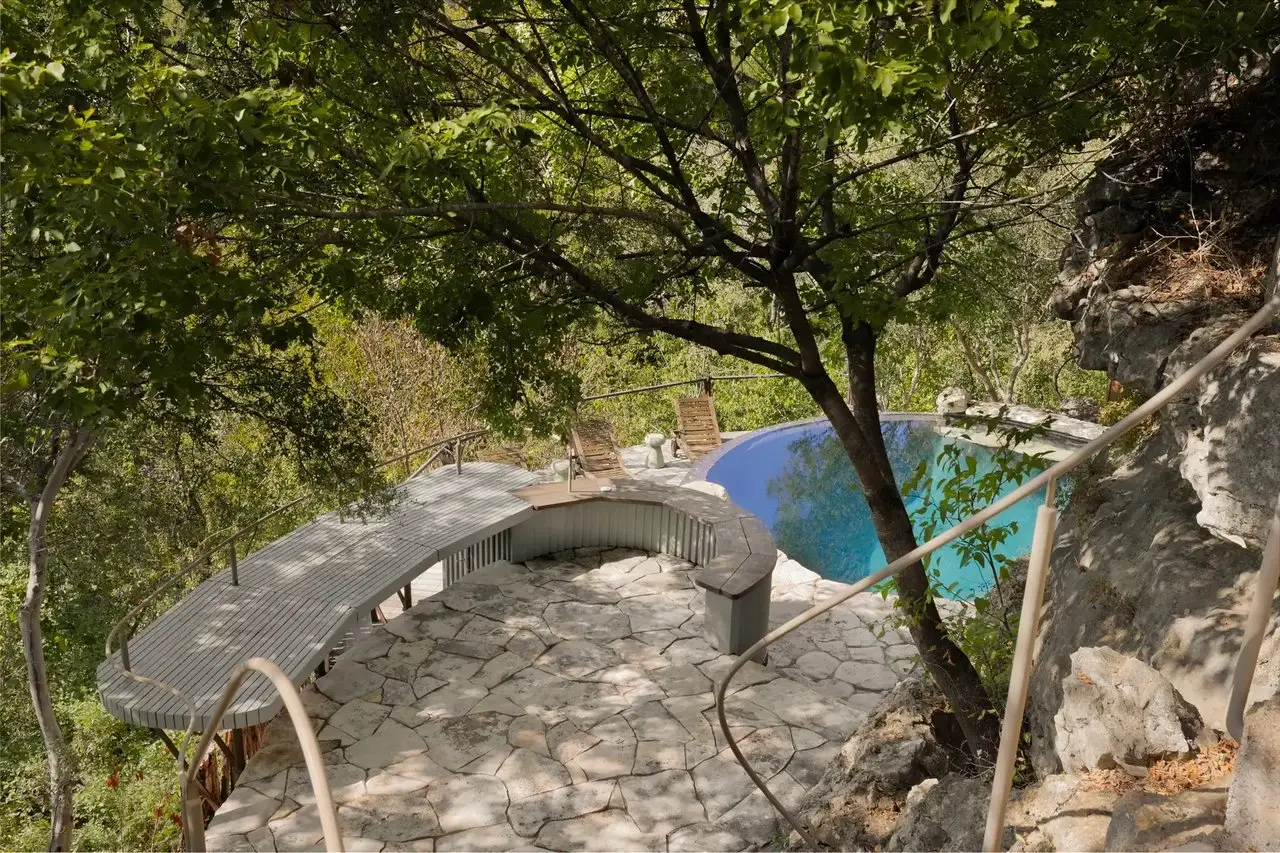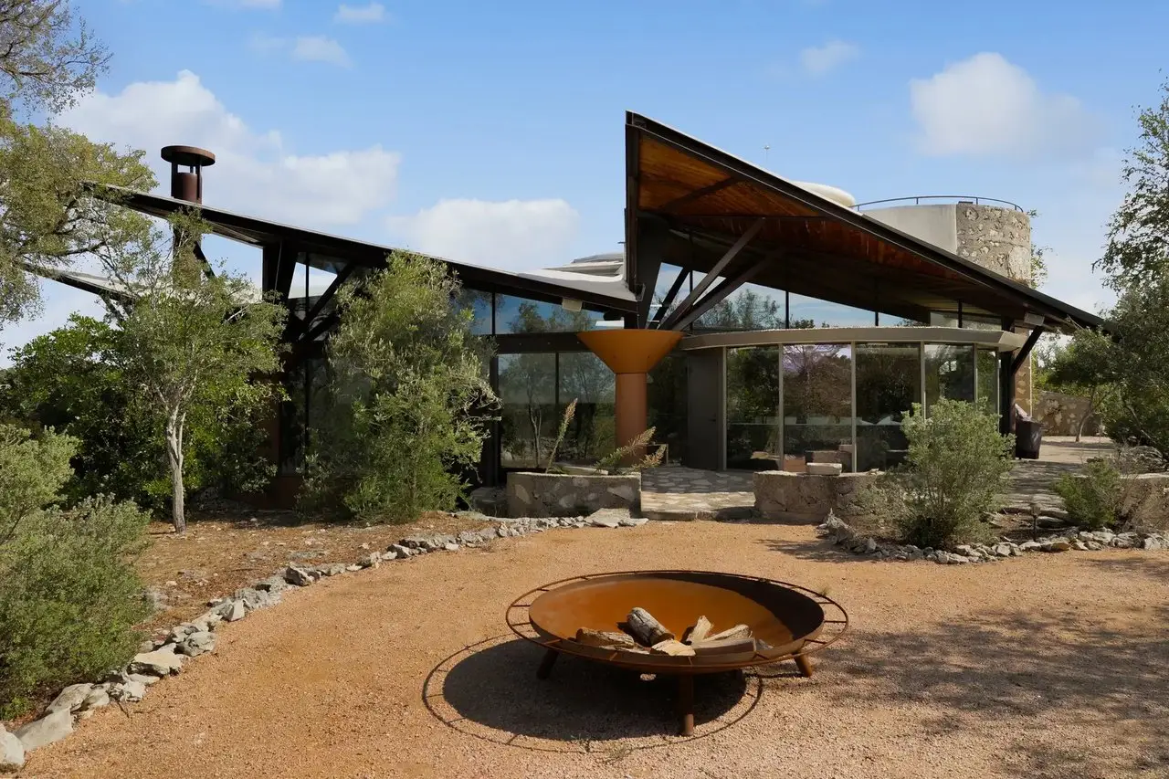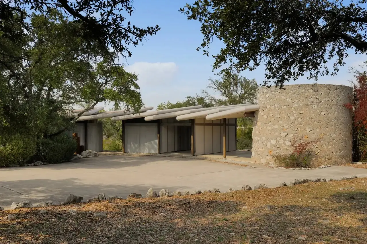 Architecturally Significant Compound in Spicewood | Once-in-a-Lifetime Retreat in Spicewood Once in a lifetime chance to own this culturally and architecturally significant home in the Hill Country, designed by John Covert Watson, an intern of Frank Lloyd Wright’s. Set on 30 stunning acres in Spicewood, The Retreat at Lick Creek Lodge is a one-of-a-kind compound offering the architecture lover the opportunity to be surrounded both by exquisite design and natural beauty. Defined by its hyperbolic parabola roof which resembles a splayed deck of cards, this home is striking inside and out. The roof creates a semi-circular motif that is repeated throughout the house, from the entry rotunda to the arching wall of glass that spans the living room and looks out to the tangle of nature enveloping the home. Interiors Celebrating Local Materials | Memorable Entertaining and Private Hideaways The interior is a celebration of the Texas Hill Country, making use of locally harvested cedar and nearby-quarried desert masonry contrasted with concrete, steel and glass. Cork floors plus rich oak and maple cabinetry add warmth and richness. An extraordinary entertaining space, the living room arches around a limestone fireplace and looks out over the rolling hills; it has hosted galas and concerts when not serving as a private retreat. The floorplan offers many unique hideaways, from a secret-door-accessed office to a serene meditation room. Roam 30 Acres with a Grotto Pool | Miles of Views with Resort Amenities The 30-acre property is set on a cliff over the Pedernales river and overlooks steep ravines and miles of green hills. Step down the hillside to the grotto pool, half-hidden in a rocky crevasse, where you can swim as if you were on a desert island. The ultra-private compound includes a large guest house and office at the front of the property; you will wend your way along gravel paths and native landscaping to reach the main house. Just 40 minutes from Austin, this property offers multiple uses, from a close-in family retreat to executive escape or small resort rental. Regardless, this property will continue to fascinate, inspire and restore its owners for years to come.