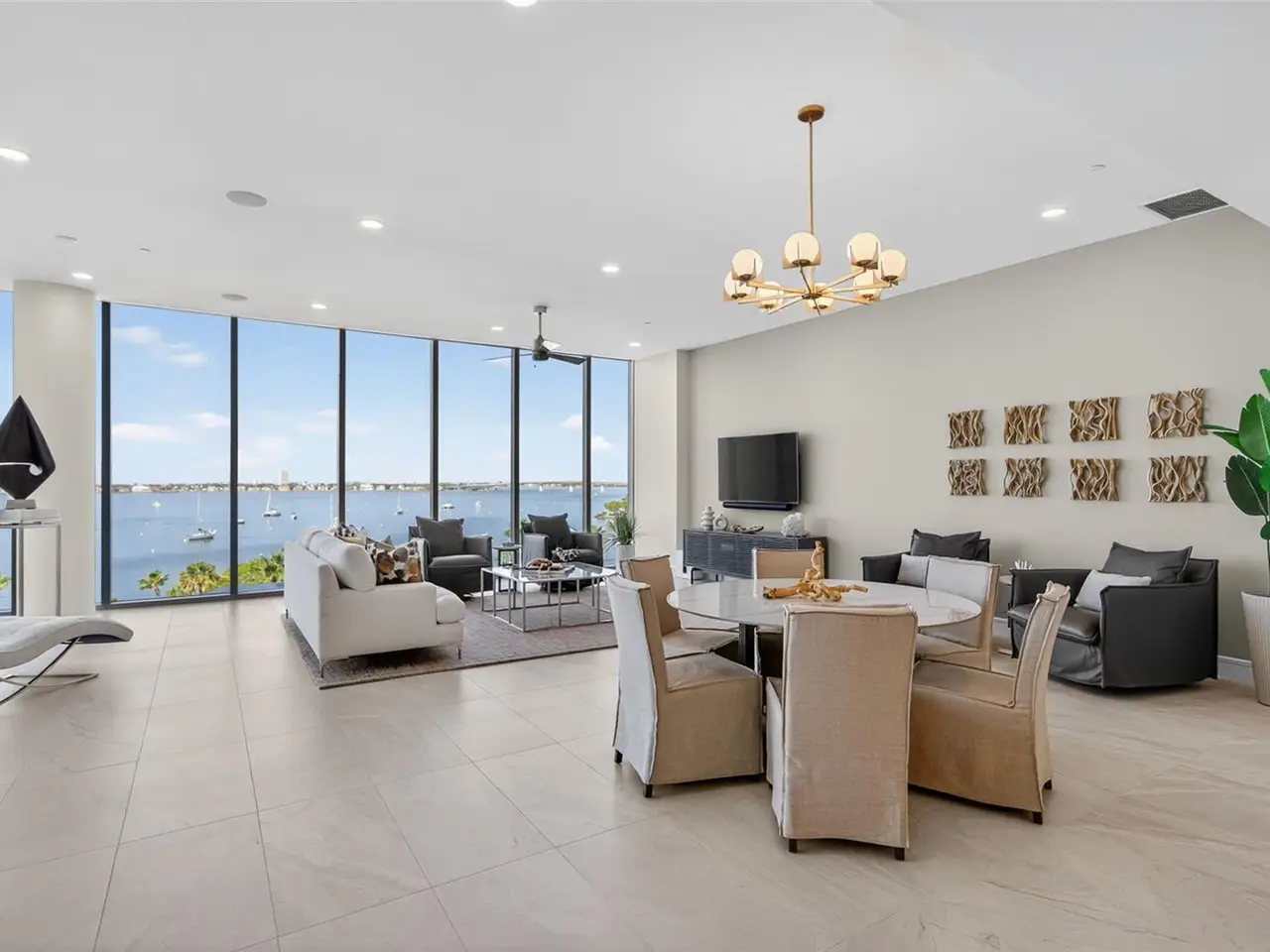 If you’re looking for a downtown condominium with unparalleled views of the Bay and City lights, framed by the drama of a panoramic southwest corner, look no further than this exceptional EPOCH residence in Sarasota’s most desirable walkable neighborhood. Arrive via your private elevator foyer and be greeted by walls of glass showcasing sweeping vistas from Marina Jack to Big Pass and the Gulf beyond. Spanning 3,600 air-conditioned square feet, this coastal contemporary home blends sophisticated style, smart technology, and exceptional comfort. Soaring ceilings and an open floor plan enhance the grand scale of the great room, dining area, and expansive terraces, creating seamless spaces for both intimate living and large-scale entertaining. The gourmet kitchen is a true centerpiece, with a large island, bespoke Cucine Ricci Italian cabinetry, quartz countertops, and ultra-premium Gaggenau appliances including a six-burner gas range, double ovens, side-by-side refrigerator/freezer, and wine refrigerator. Access to the terrace with a summer kitchen makes indoor-outdoor living effortless. The owner’s retreat is an unrivaled sanctuary with direct bayfront terrace access, generous custom walk-in closets, and a spa-inspired bath featuring a curbless walk-in shower, sculptural soaking tub, double vanities, and two private water closets. The guest wing includes two en-suite bedrooms and a private den/TV lounge, providing comfort and privacy for family and visitors. Every finish speaks to refined living, from large-format porcelain flooring to Lutron automated shades, smart lighting controls, multi-zone air conditioning, and an oversized laundry room. A private storage space and two secure deeded parking spaces further elevate convenience. At EPOCH, residents enjoy world-class amenities: a 70-foot recreation and lap pool with spa, fire tables, pool bar and grill; a dramatic rooftop terrace; a Residents’ Club; state-of-the-art fitness center; massage suite; steam showers; and a private guest suite for visitors. Meticulously conceived to honor the Sarasota School of Architecture, EPOCH offers just 23 exclusive residences where contemporary elegance and unmatched quality converge. Nestled on the shoreline of Sarasota Bay and steps from downtown’s cosmopolitan core, this is the pinnacle of Gulf Coast living.