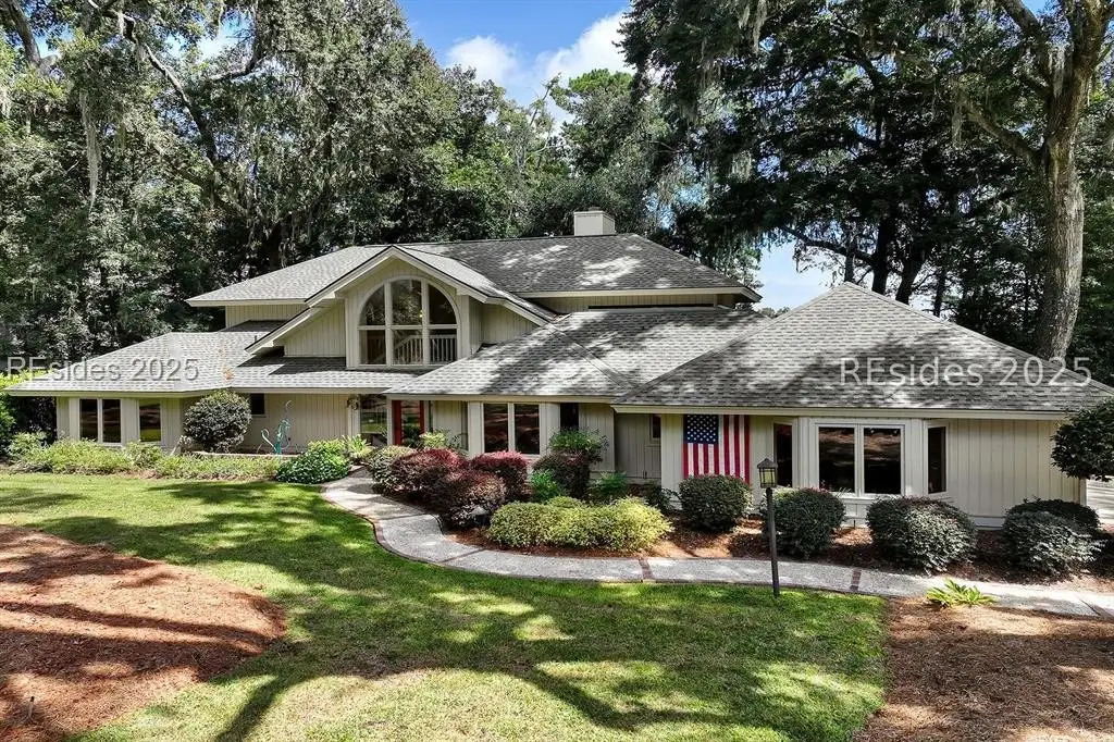 Rare opportunity to experience daily breathtaking panoramic views across much desired Blue Heron Sanctuary in amenity rich, private Moss Creek! Interior features in this impeccably maintained residence include soaring, vaulted/tray ceilings, floor to ceiling walls of windows to view, teak wood flooring, custom cabinetry/ built-ins/millwork, fireplace, granite & solid surface counters & designer fixtures/hardware/lighting. Very livable floor plan boasts impressive Great Rm, Island Kitchen open to Casual Dining & Carolina Rm, Dining Rm, Laundry, Powder Rm, excellent BR separation, Den/Study adjacent well-appointed primary BR suite w/updated Bath, 2 ample guest BR suites & open staircase to 2nd floor Gallery with stunning views. Exterior offers oversize, high elevation, cul de sac corner lot with nature preserve in front, golf view to side (#7 North Course), maximum privacy, rear patio (with built-in seating) spanning almost entire rear of home, side load 2 car garage, majestic live oaks, new roof, mature lawn/plantings & large back yard gently sloping to waters edge and arguably the finest lake view on this highly sought, birders paradise, nature preserve. All with excellent curb appeal, super quiet locale, and prime eastern exposure in rear offering stunning sunrises across lake to rookery, boardwalk/tidal marsh, and shaded late afternoons/evenings for relaxing & entertaining friends. It will be love at first sight...
