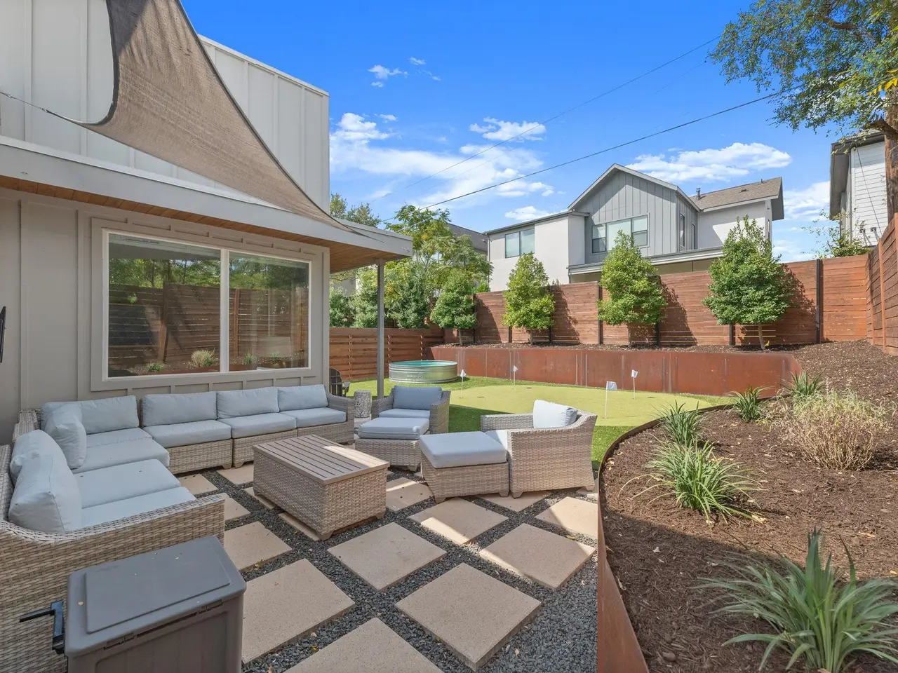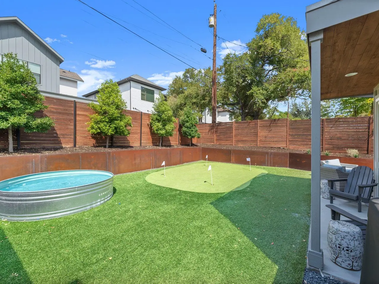 Experience modern Austin living at its finest in this gorgeous 3 bedroom, 3 bathroom residence, where elegant style meets effortless livability. Thoughtfully crafted with soaring ceilings and beautiful design, the open-concept living space feels bright, airy, and refined. Immaculate finishes and stylish fixtures give the home a fresh, contemporary aesthetic that feels both polished and inviting. The heart of the home centers around a stunning kitchen with sleek cabinetry, premium appliances, and an expansive island ideal for casual dining or entertaining. Each bedroom offers generous proportions and spa-like bathrooms with exquisite tilework. The primary suite provides a serene retreat, complete with a walk-in closet and a luxurious en suite bath. Escape to the private backyard oasis designed for relaxation and fun. Enjoy a covered porch ideal for morning coffee, a refreshing stock tank pool for warm afternoons, a personal putting green, and a cozy sitting area. Perfectly located near The Grove Signature Park, the trails along the Shoal Creek Greenbelt, and Austin's top shopping and dining options, this home delivers the best of modern design and central convenience. Tax and assessed values are estimates for illustration purposes only. All figures should be independently verified.