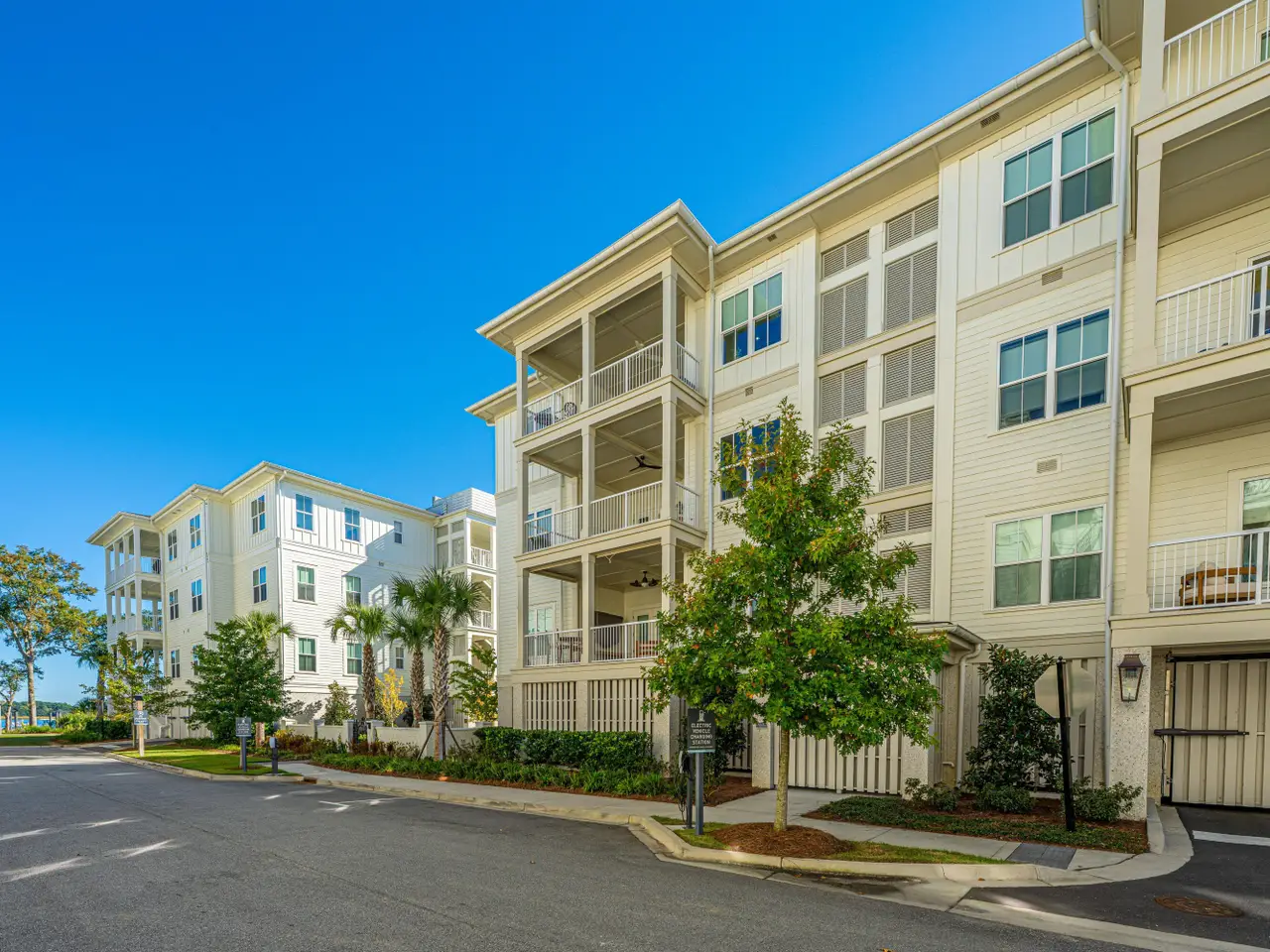 Luxury living at The Waterfront on Daniel Island! This 2024 top floor 2 bedroom 2 bathroom condominium is perfection! Enjoy fantastic views of the Wando River while basking in comfortable breezes from the large terrace. One of only six units throughout the community with no adjoining walls, experience unmatched quiet and privacy with an abundance of natural light from windows on all sides. Upgrades galore! Wide plank hardwood flooring throughout, high end lighting fixtures and ceiling fans, custom closets and kitchen pantry designed by Inspired Closets, built-in kitchen appliances offering a seamless cabinetry esthetic, professionally installed high end wallpaper, additional ceiling lighting in dining room, custom window treatments in every room, large 2 x 4 shower tile and specialty mirrors in both bathrooms, upgraded Farrow and Ball wall paint with all walls and trim receiving 2 additional coats of paint after purchase. Beautiful kitchen tile backsplash and custom countertop in pantry with added electrical outlet. Impeccably maintained unit with garage storage and 2 parking spaces conveniently located next to the elevator. Beautiful courtyard with multiple seating areas and state of the art grille. Well equipped fitness center and tranquil pool with gathering pavilion.