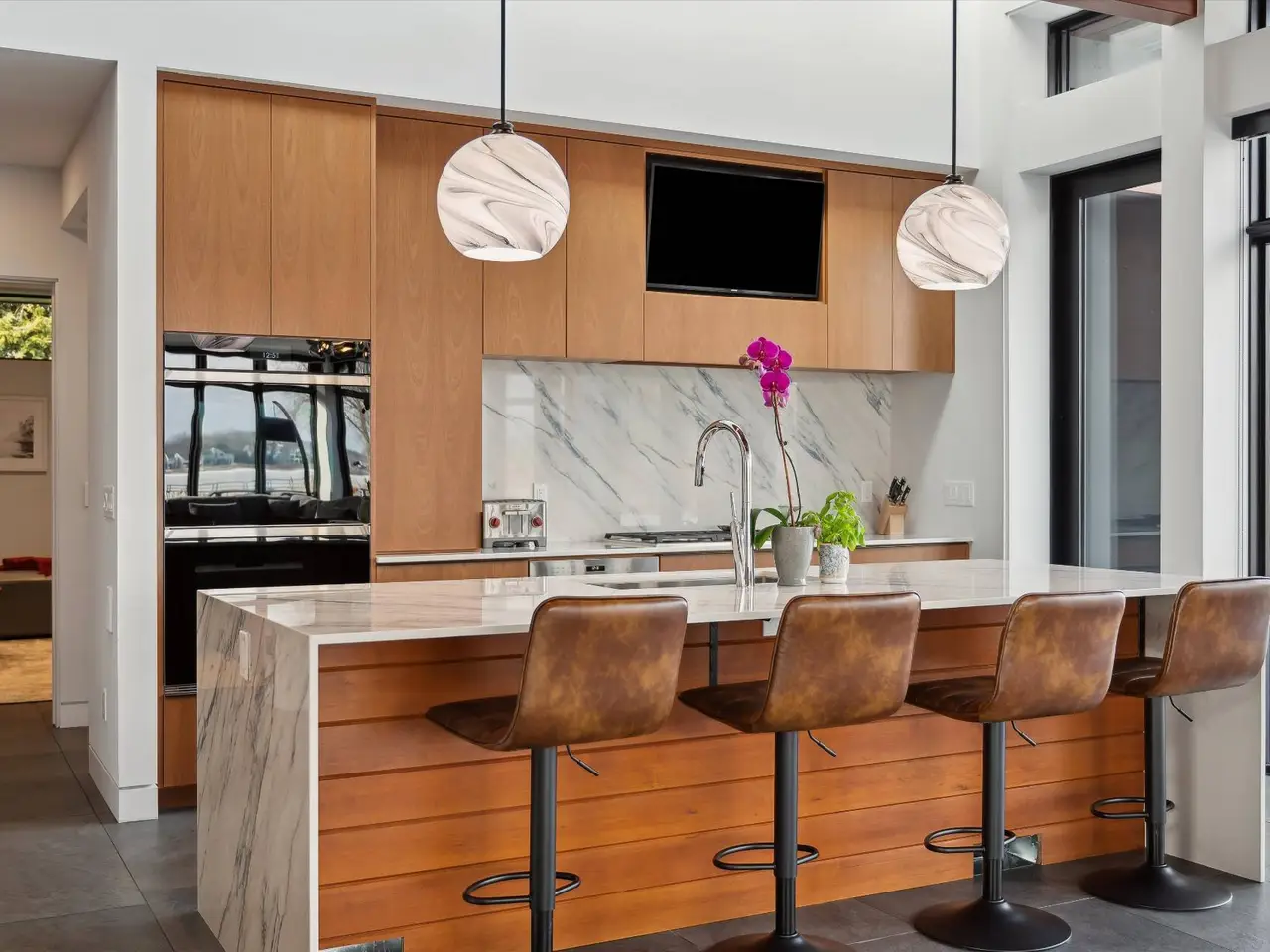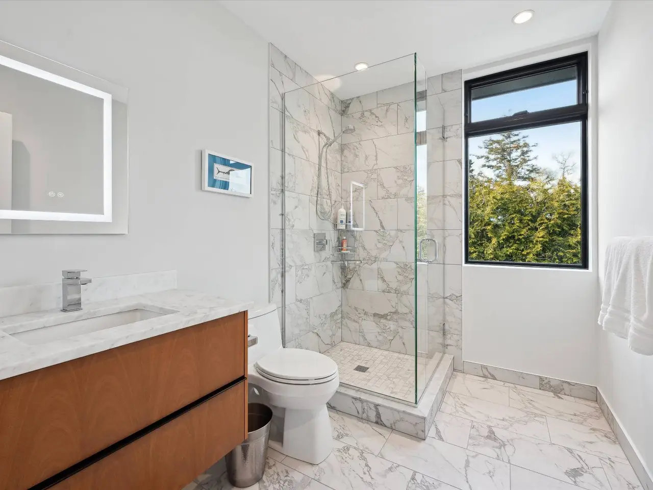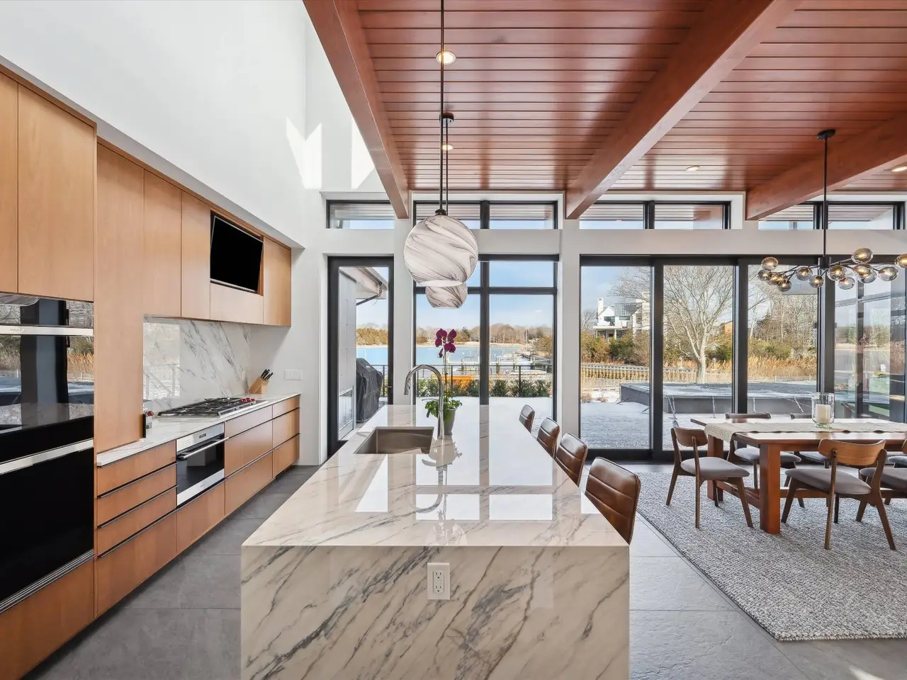 This exquisite five-bedroom, five-and-a-half-bath residence, a creation by the esteemed Turkel Design, is meticulously crafted to leverage its prime location, offering breathtaking water views of Sag Harbor Cove from nearly every vantage point. A grand two-story foyer welcomes you into the open-concept living area, which seamlessly connects to the gourmet eat-in kitchen. This culinary space is appointed with marble waterfall countertops, bespoke cabinetry, a convenient butler's pantry, and top-of-the-line appliances, including dual Wolf wall ovens, a Sub-Zero refrigerator, and a Bosch dishwasher. Floor-to-ceiling glass throughout the living areas captures expansive water vistas and provides direct access to the outdoor sanctuary. Your first floor also includes a Jr. primary with walk-in closet, heated bathroom floors his home is replete with modern conveniences, including a 4-zone dual-hybrid heat pump propane furnace system, power window shades in the living and primary bedroom, a Ring camera system, pre-wiring for additional exterior video cameras, central vac, and a multizone irrigation system. Further enhancing its self-sufficiency are a 16kw solar panel system and a Generac 24kw generator. Practicality is key, with direct access from the garage to a generous laundry/mud room, and a powder bath. The attached two-car garage adds to the home's functionality. Upstairs, the primary bedroom suite offers an oversized walk-in closet, and a sleek freestanding tub set against a wall of glass, providing unparalleled views of Sag Harbor Cove. The second floor also hosts three additional en-suite bedrooms and a convenient second-floor laundry. The luxurious exterior features a free-form saltwater pool and spa, controlled by a Pentair system, all set within extensive teak decking. A charming wood-burning fireplace on the deck overlooks Sag Harbor Cove, complemented by indigenous landscaping, a new bulkhead, and dock. With direct water access, residents can easily explore the surrounding coves, bays, and waterfront restaurants on Shelter Island and the North Fork. This modern masterpiece presents an unparalleled opportunity to experience luxurious waterfront living in Sag Harbor. Listing ID:923252