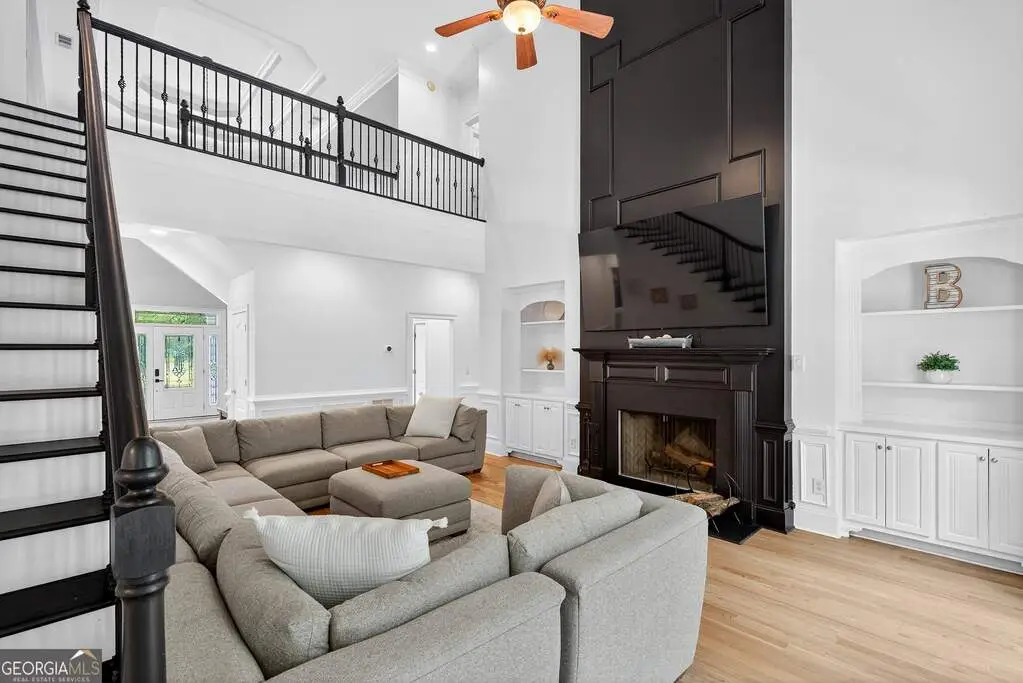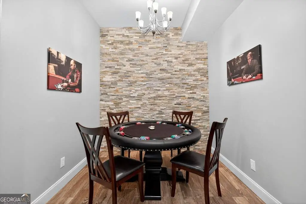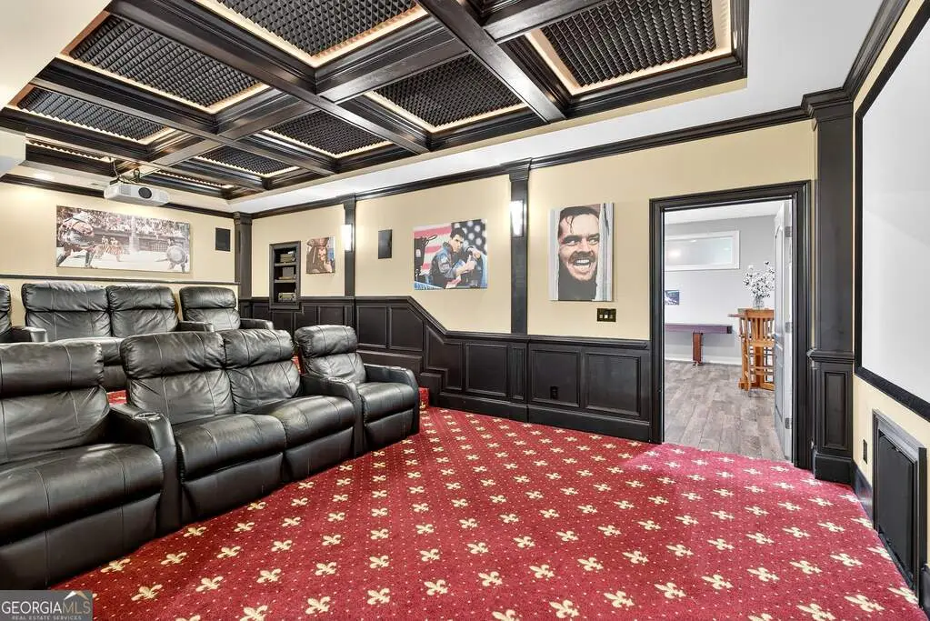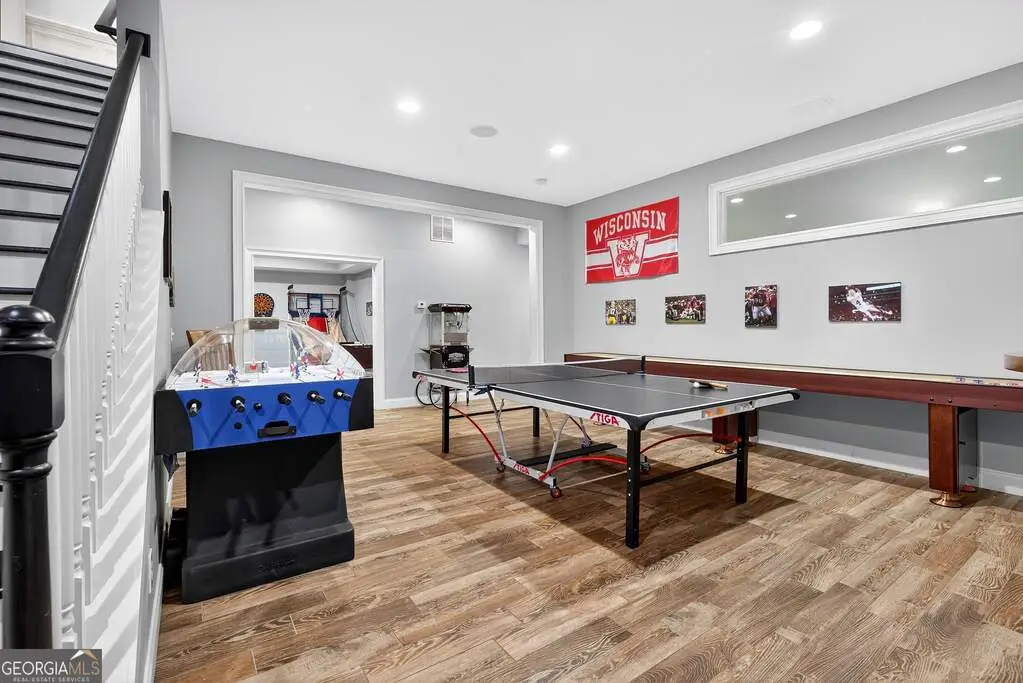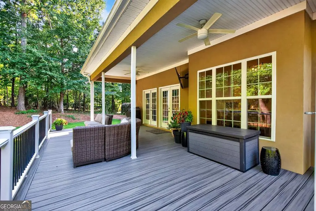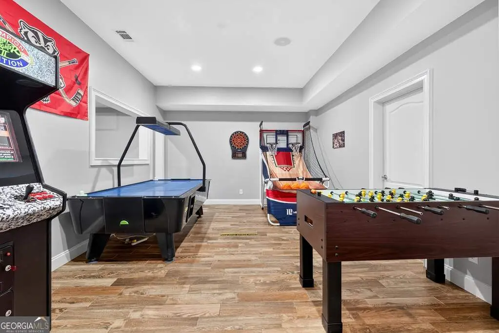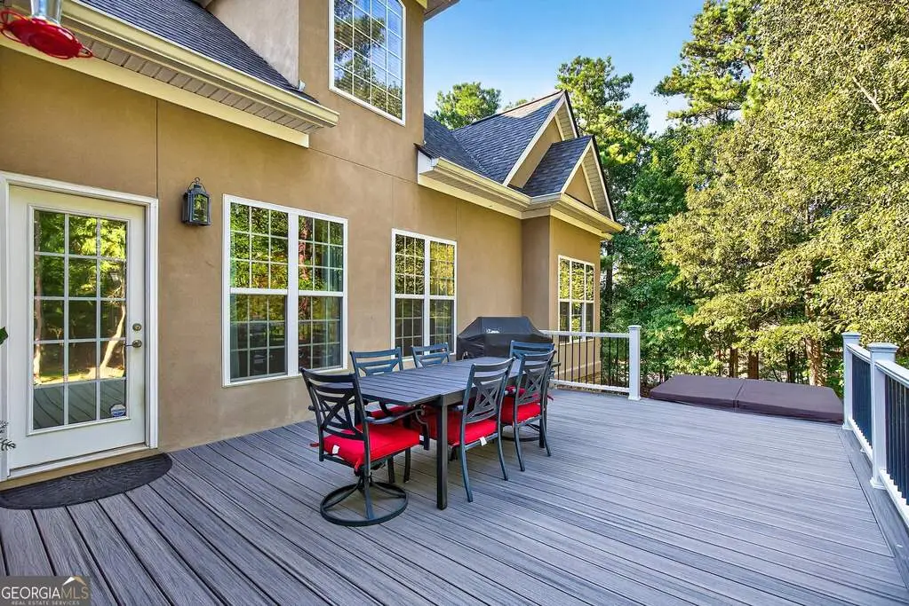 Welcome to 53 Vinings Trace in the highly sought-after Arbor Springs neighborhood. Perfectly located just 20 minutes from Atlanta, 15 minutes from Hartsfield-Jackson International Airport, and only minutes from I-85, this stunning six-bedroom, four full and two half bath home offers the perfect blend of luxury and convenience. The main level opens with a welcoming foyer and leads into a large dining room, ideal for entertaining. The chef's kitchen features quartz countertops, refinished cabinets, a breakfast bar, casual dining area, and a cozy keeping room with a fireplace and built-in bookshelves. The spacious living room boasts a soaring two-story feature wall with a fireplace and custom built-ins, creating a true focal point. The owner's suite on the main level is a private retreat with a recently renovated spa-inspired bathroom featuring a stone resin freestanding tub, oversized tiled shower, and marble counters on the dual vanity and marble flooring. Hardwood floors throughout, an office, large laundry room, and a half bath complete the main level. Upstairs, you'll find one bedroom with a private ensuite with a custom tile shower and three additional bedrooms and a full bath, providing plenty of space for family and guests, all with new carpet. The fully finished terrace level is designed for both entertainment and function. It includes a large recreation room and home gym with rubber flooring. The movie theater boasts eight recliners, bar seating, the latest 4K projector, 120" acoustically transparent screen and 7.2 surround sound system with top of the line Klipsch speakers. Next to it is a true man cave with its own bar with under-the-counter ice maker, two under-the-counter fridges and freezer, poker room, and half bath. There is also an additional bedroom and bathroom, plus storage and a workshop area. Outdoor living is just as impressive with a spacious updated Trex deck and sunk-in hot tub, a firepit, all on a large private lot.