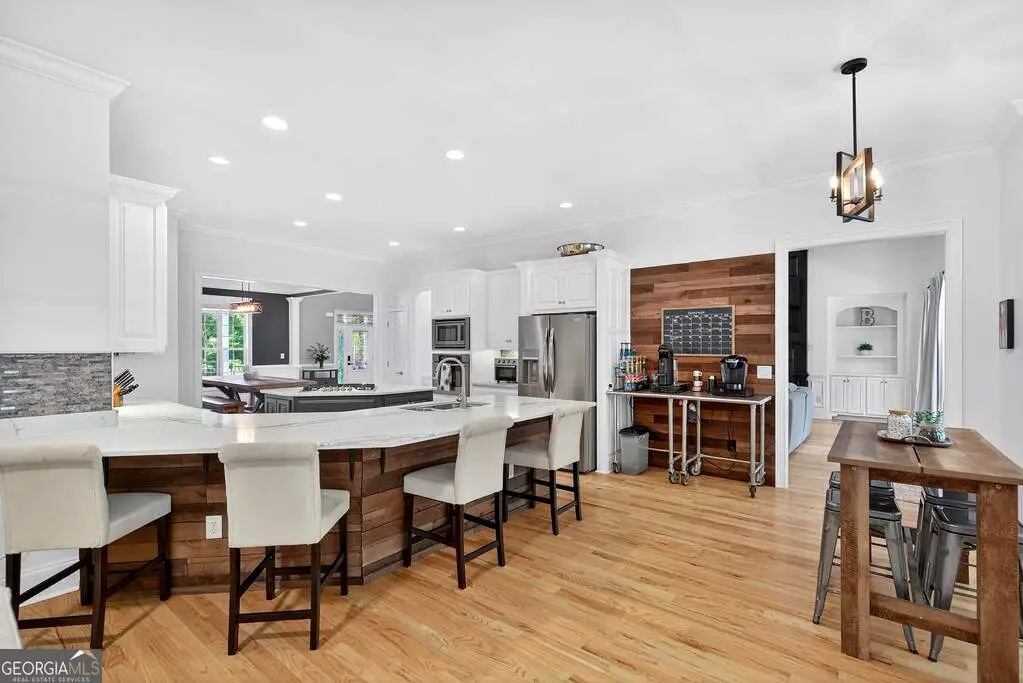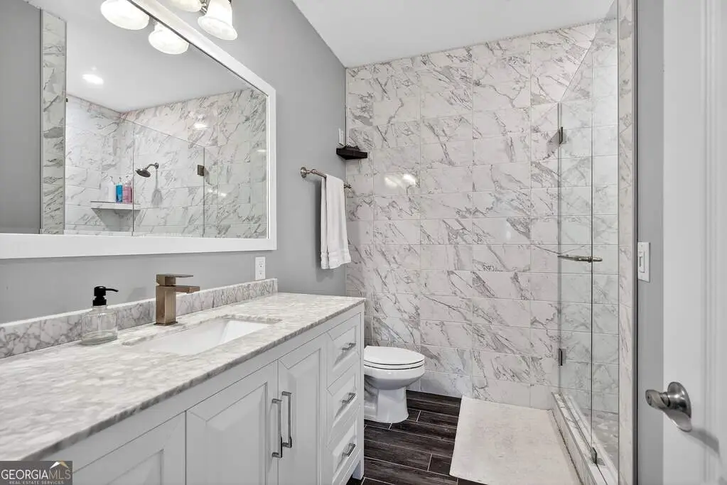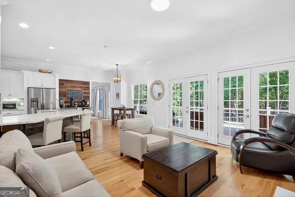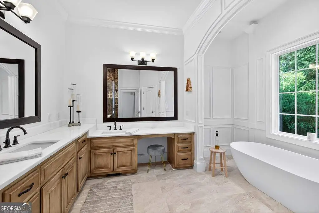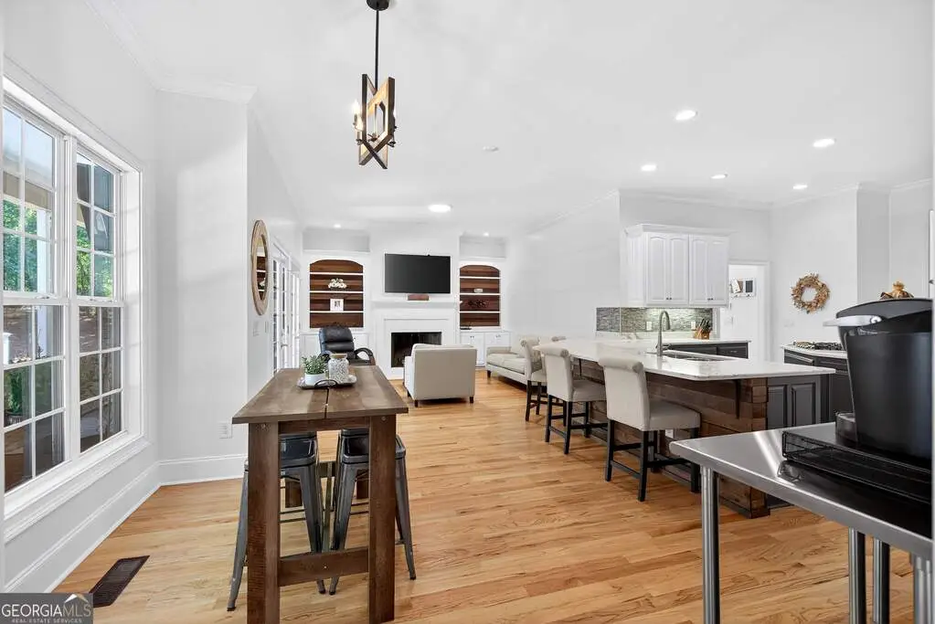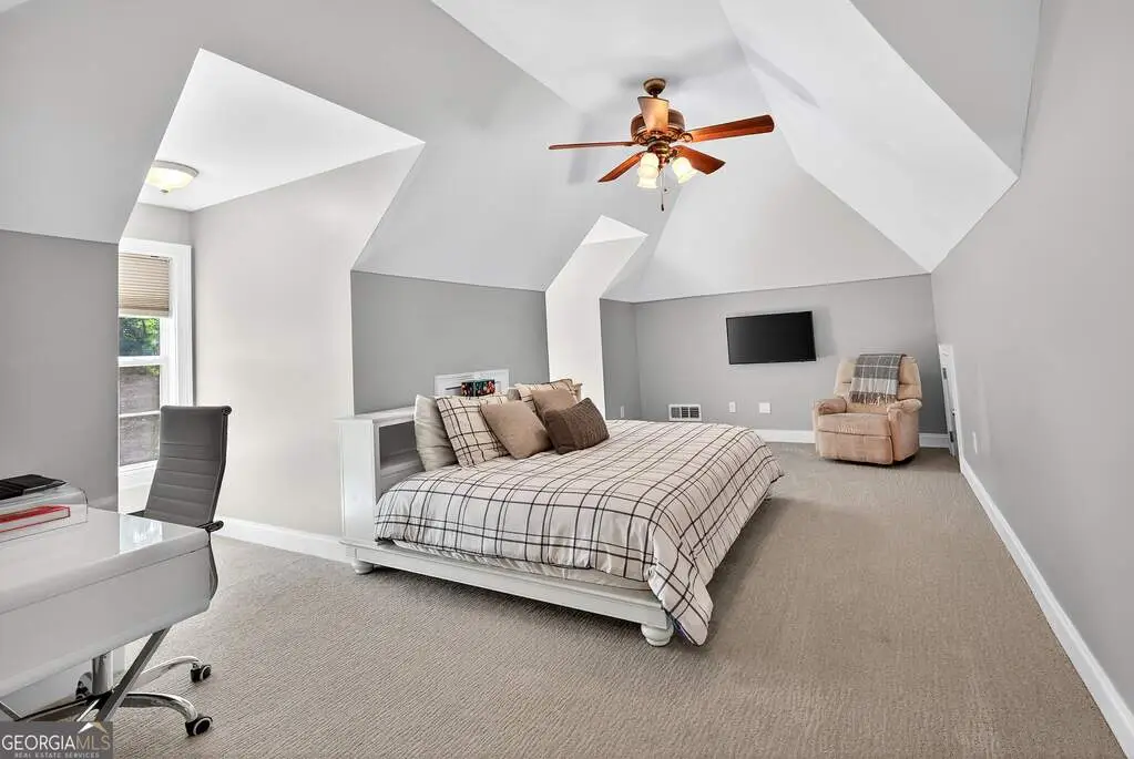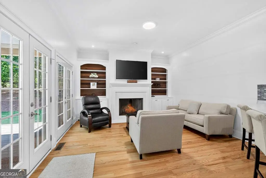 Welcome to 53 Vinings Trace in the highly sought-after Arbor Springs neighborhood. Perfectly located just 20 minutes from Atlanta, 15 minutes from Hartsfield-Jackson International Airport, and only minutes from I-85, this stunning six-bedroom, four full and two half bath home offers the perfect blend of luxury and convenience. The main level opens with a welcoming foyer and leads into a large dining room, ideal for entertaining. The chef's kitchen features quartz countertops, refinished cabinets, a breakfast bar, casual dining area, and a cozy keeping room with a fireplace and built-in bookshelves. The spacious living room boasts a soaring two-story feature wall with a fireplace and custom built-ins, creating a true focal point. The owner's suite on the main level is a private retreat with a recently renovated spa-inspired bathroom featuring a stone resin freestanding tub, oversized tiled shower, and marble counters on the dual vanity and marble flooring. Hardwood floors throughout, an office, large laundry room, and a half bath complete the main level. Upstairs, you'll find one bedroom with a private ensuite with a custom tile shower and three additional bedrooms and a full bath, providing plenty of space for family and guests, all with new carpet. The fully finished terrace level is designed for both entertainment and function. It includes a large recreation room and home gym with rubber flooring. The movie theater boasts eight recliners, bar seating, the latest 4K projector, 120" acoustically transparent screen and 7.2 surround sound system with top of the line Klipsch speakers. Next to it is a true man cave with its own bar with under-the-counter ice maker, two under-the-counter fridges and freezer, poker room, and half bath. There is also an additional bedroom and bathroom, plus storage and a workshop area. Outdoor living is just as impressive with a spacious updated Trex deck and sunk-in hot tub, a firepit, all on a large private lot.