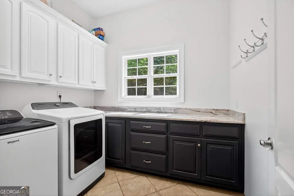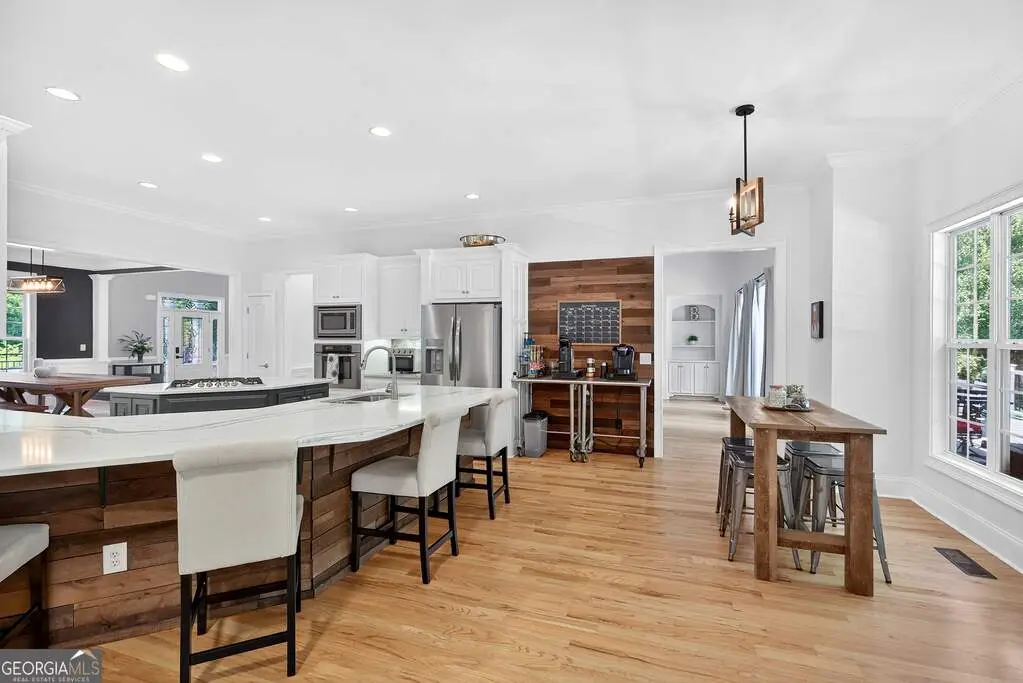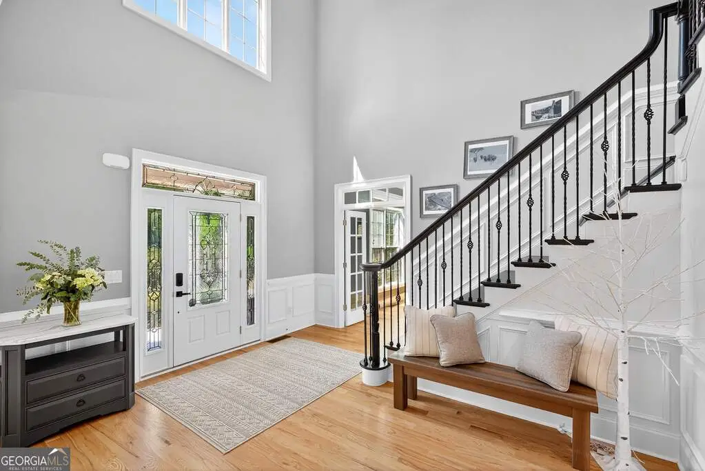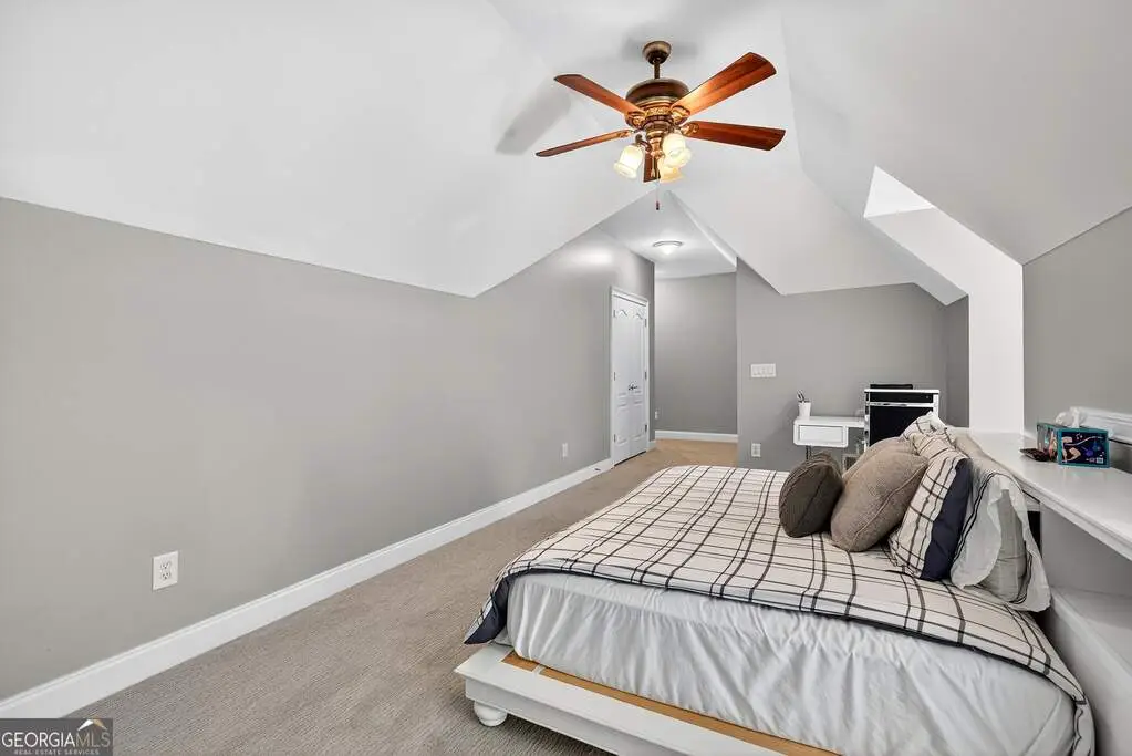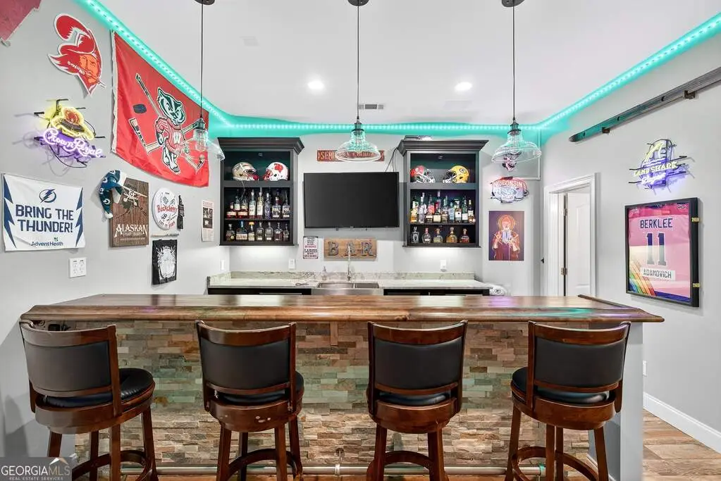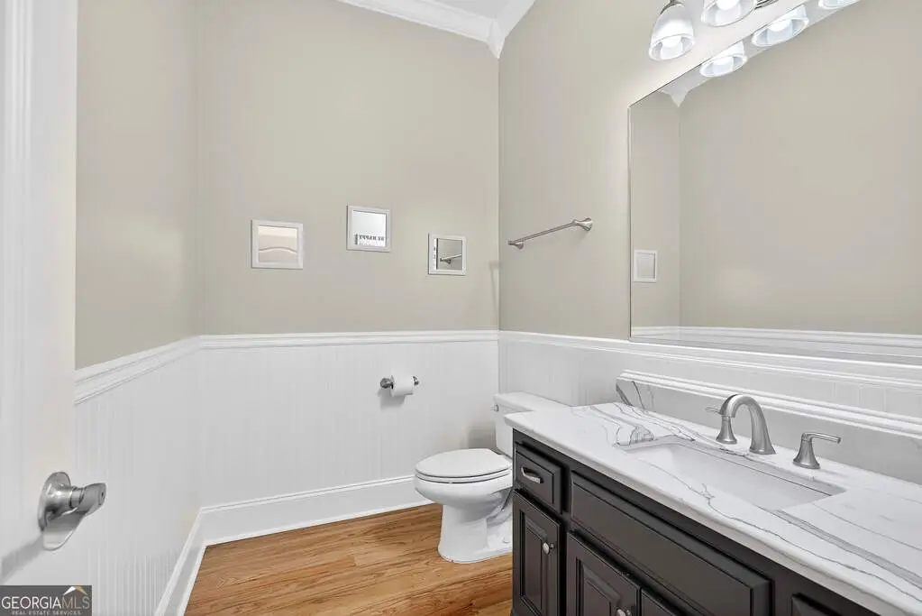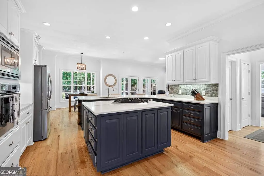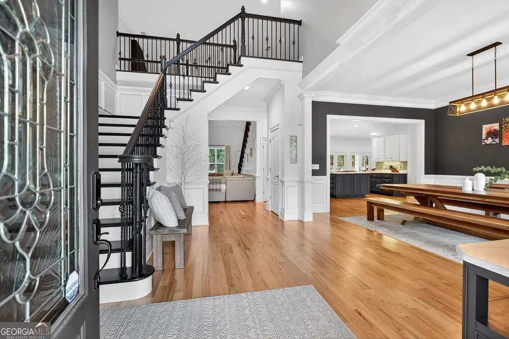 Welcome to 53 Vinings Trace in the highly sought-after Arbor Springs neighborhood. Perfectly located just 20 minutes from Atlanta, 15 minutes from Hartsfield-Jackson International Airport, and only minutes from I-85, this stunning six-bedroom, four full and two half bath home offers the perfect blend of luxury and convenience. The main level opens with a welcoming foyer and leads into a large dining room, ideal for entertaining. The chef's kitchen features quartz countertops, refinished cabinets, a breakfast bar, casual dining area, and a cozy keeping room with a fireplace and built-in bookshelves. The spacious living room boasts a soaring two-story feature wall with a fireplace and custom built-ins, creating a true focal point. The owner's suite on the main level is a private retreat with a recently renovated spa-inspired bathroom featuring a stone resin freestanding tub, oversized tiled shower, and marble counters on the dual vanity and marble flooring. Hardwood floors throughout, an office, large laundry room, and a half bath complete the main level. Upstairs, you'll find one bedroom with a private ensuite with a custom tile shower and three additional bedrooms and a full bath, providing plenty of space for family and guests, all with new carpet. The fully finished terrace level is designed for both entertainment and function. It includes a large recreation room and home gym with rubber flooring. The movie theater boasts eight recliners, bar seating, the latest 4K projector, 120" acoustically transparent screen and 7.2 surround sound system with top of the line Klipsch speakers. Next to it is a true man cave with its own bar with under-the-counter ice maker, two under-the-counter fridges and freezer, poker room, and half bath. There is also an additional bedroom and bathroom, plus storage and a workshop area. Outdoor living is just as impressive with a spacious updated Trex deck and sunk-in hot tub, a firepit, all on a large private lot.