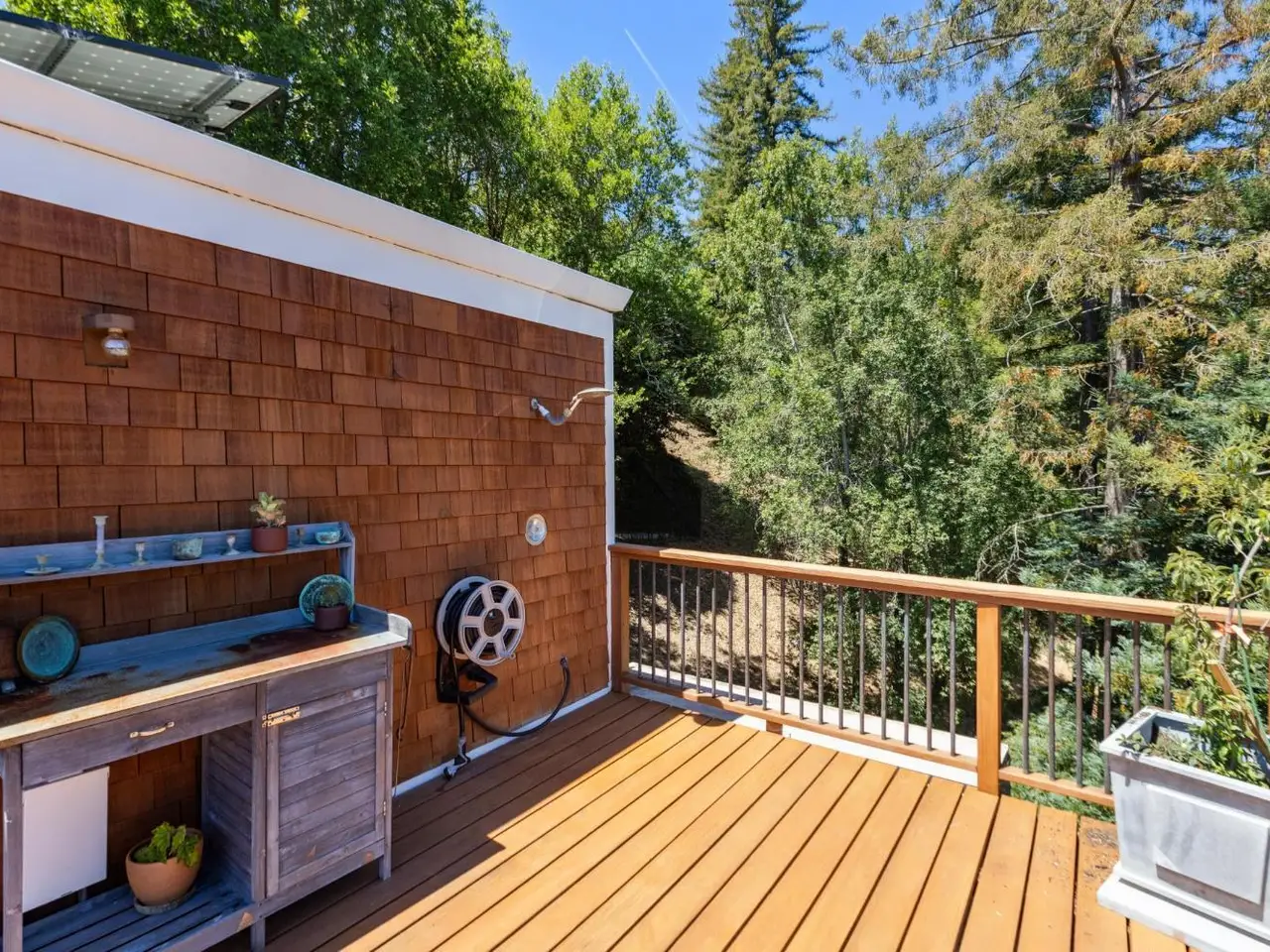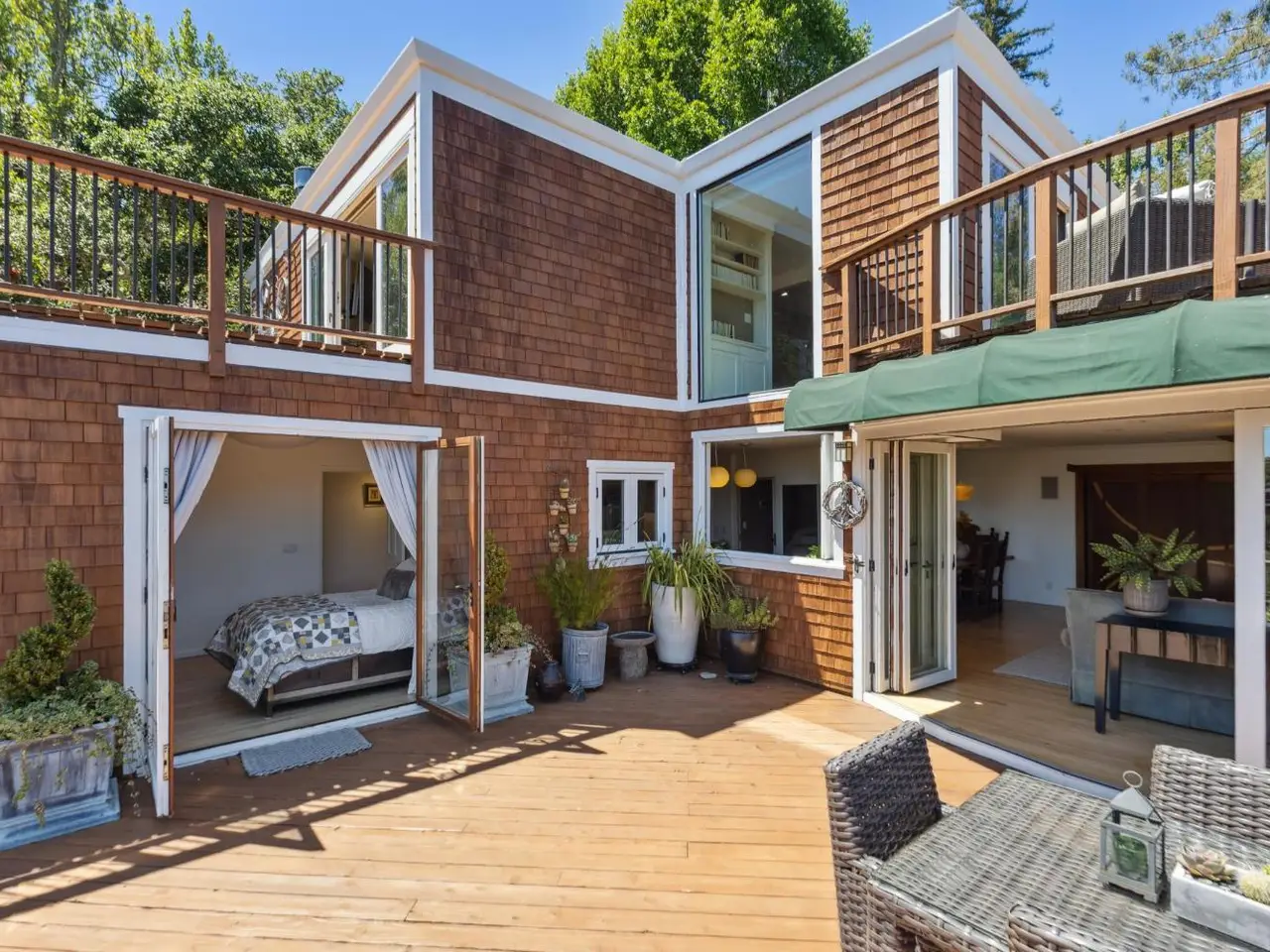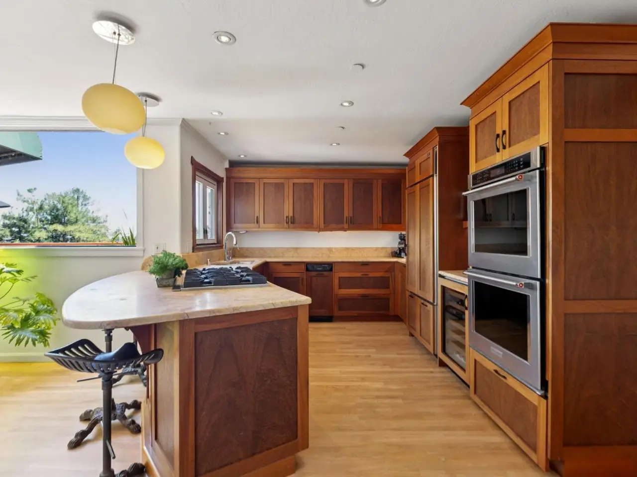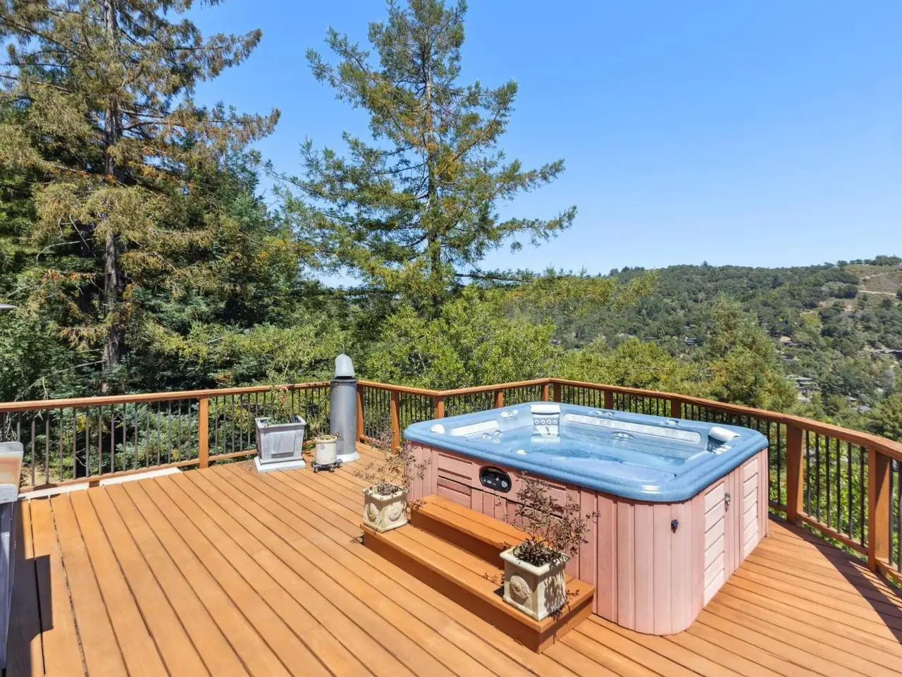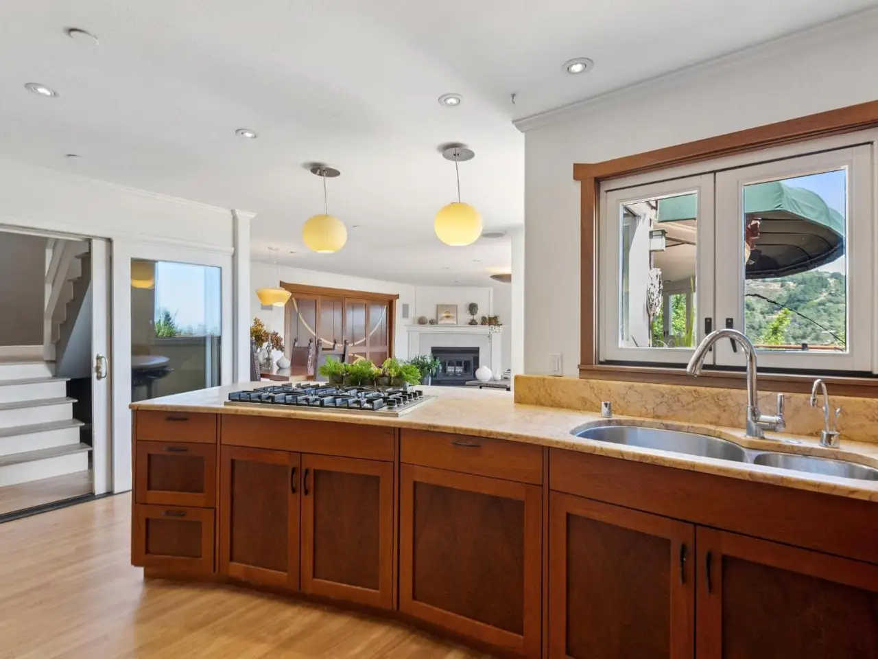 This stunning custom four-bedroom, five-bath home on prestigious Middle Ridge delivers the quintessential Marin lifestyle with sweeping views spanning the surrounding hills to Angel Island, the Bay, and downtown San Francisco. Entertain effortlessly on multiple decks, including the main deck accessible through custom moveable glass doors from the expansive great room featuring living, dining, and gourmet kitchen areas. The chef's kitchen showcases elegant Italian marble countertops, top-tier appliances, and exquisite custom mahogany Berkeley Mills cabinetry. Two sunny main-level bedrooms each offer en-suite baths, while the private upper-level primary suite captures incredible vistas from dual private decks, one featuring a spa tub and outdoor shower. This indulgent retreat includes a luxurious bath, wood-burning marble fireplace, oversized walk-in closet, and dedicated office and exercise areas. A versatile guest suite with separate entrance provides flexible living options. Premium features include hardwood floors throughout and owned solar panels. Situated on a tranquil, sun-drenched avenue mere minutes from downtown Mill Valley's award-winning schools and world-renowned hiking and biking trails.