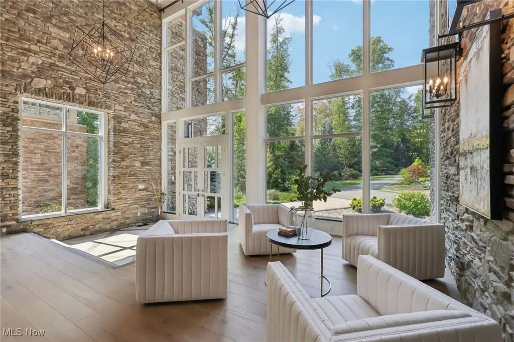 This extraordinary contemporary estate blends modern design with Rocky Mountain elegance to create a private sanctuary of unparalleled sophistication. Reimagined with uncompromising detail, the exterior flows seamlessly from the serene lily pond and waterfall entry to the resort-worthy patio, pool, firepit, and pergola. Walls of glass frame sweeping views of the manicured three-acre grounds, dissolving boundaries between indoors and out. Inside, soaring ceilings, wide-plank white oak floors, and designer lighting define modern refinement. The chef's kitchen is a true centerpiece with natural stone countertops, professional-grade appliances, wine cooler, beverage fridge, generous pantry, and walk-in prep kitchen. The main-level owner's wing offers a dramatic fireplace suite, lofted lounge with panoramic vistas, wellness area, and a spa-inspired bath with dual vanities, soaking tub, and oversized shower. Two large closets with custom cabinetry complete the space. A connected office/den overlooks a tranquil fountain and opens to a private deck. The lower level redefines entertaining with a 18-foot wine cellar, illuminated onyx bar clad in Calcutta Brazil marble and walnut, billiards, ping-pong, poker room, and fitness center with direct access to a spa bathroom complete with sauna and shower. The additional pool bath is conveniently located at the lower level entrance and features two showers and a dedicated water closet. Upstairs, four bedrooms and three baths provide space and privacy. An expansive first floor laundry with dual washers and dryers and a dedicated mudroom elevate both elegance and everyday ease. Set on three wooded acres backing to Ladue Reservoir, this estate delivers unrivaled privacy, resort-style amenities, and effortless luxury.