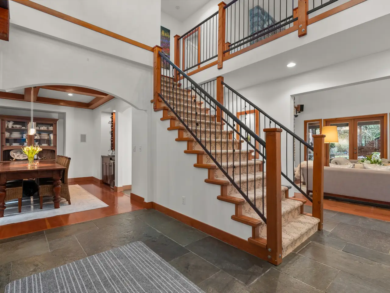 Welcome to this gorgeous, custom-built West Coast-inspired residence situated on one of Ocean Park's most desirable locations. Over 5,700 square feet of tasteful and timeless design throughout. The great room with double French doors creates a seamless indoor/outdoor entertainment space with views of the private and manicured backyard. Double sided stone fireplace leads to the eat-in kitchen with a casual eating area and a formal dining room. Home office and an additional media room on the main. The upper level is complete with an airy primary suite and three additional bedrooms with a one-of-a-kind study room. The lower level is finished with a bar, media room, games room, guest bedroom, gym and a storage room. Set on a 23,391 square foot property with lush landscaping and a duck pond at the rear of the property.