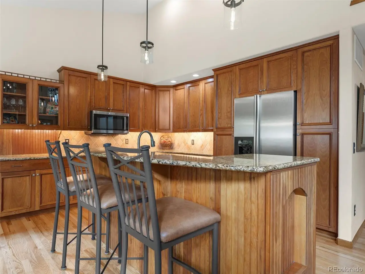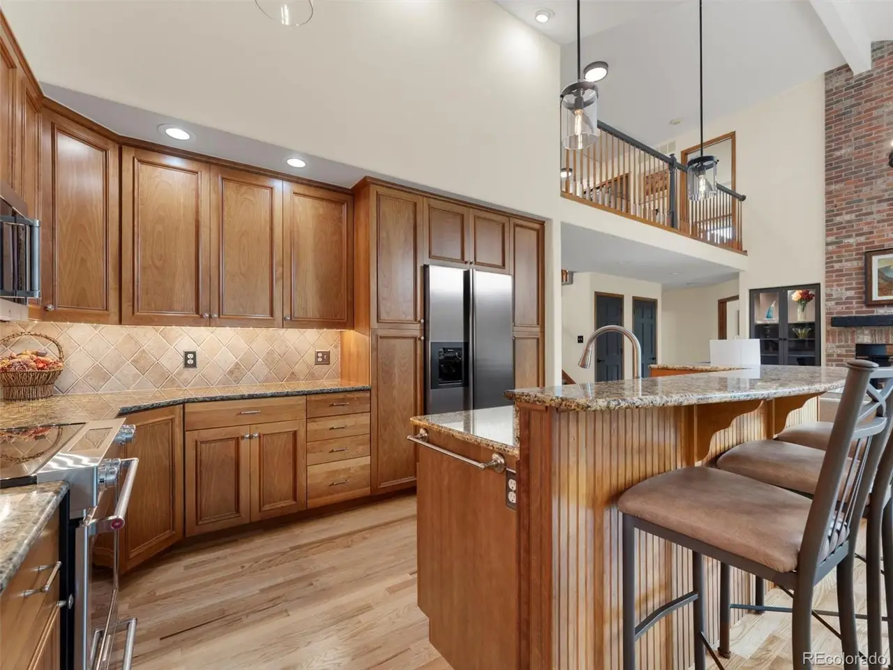 Welcome to this beautifully maintained home in the highly desirable Ridgeview neighborhood of Lone Tree, offering outstanding curb appeal with a side-load garage, mature trees, and professional landscaping. Inside, a voluminous open floor plan highlights a two-story foyer, vaulted living room, formal dining room, and hardwood floors that flow into the kitchen and family room. The two-story family room showcases dramatic picture windows that bring the outdoors in, built-in glass cabinetry and bookcase, and an impressive brick gas fireplace. The updated kitchen features custom cabinetry with glass doors, stainless steel appliances, granite counters, and a spacious eating area framed by oversized picture windows. The main-floor primary suite is exceptionally large with a vaulted ceiling, two walk-in closets, and a remodeled bath (2022) with heated tile floors, while the main level also includes a generous laundry room with ample cabinetry, closet space, and utility sink. Upstairs are three spacious bedrooms and an updated full bath. The bright garden-level basement offers abundant natural light with a rec room, fireplace, wet bar, fifth bedroom, newly updated bath, and a versatile bonus room perfect for exercise, play, or hobbies. Updated windows throughout, stamped concrete patio with electric awning, and a beautifully landscaped, private backyard complete this home. Thoughtful recent updates include new carpet, refinished wood floors, fresh interior and exterior paint, and a brand-new driveway. All within walking distance to Eagle Ridge Elementary, Cook Creek Pool, Lone Tree Golf & Tennis Center, Bluffs Regional Park, and miles of walking paths.