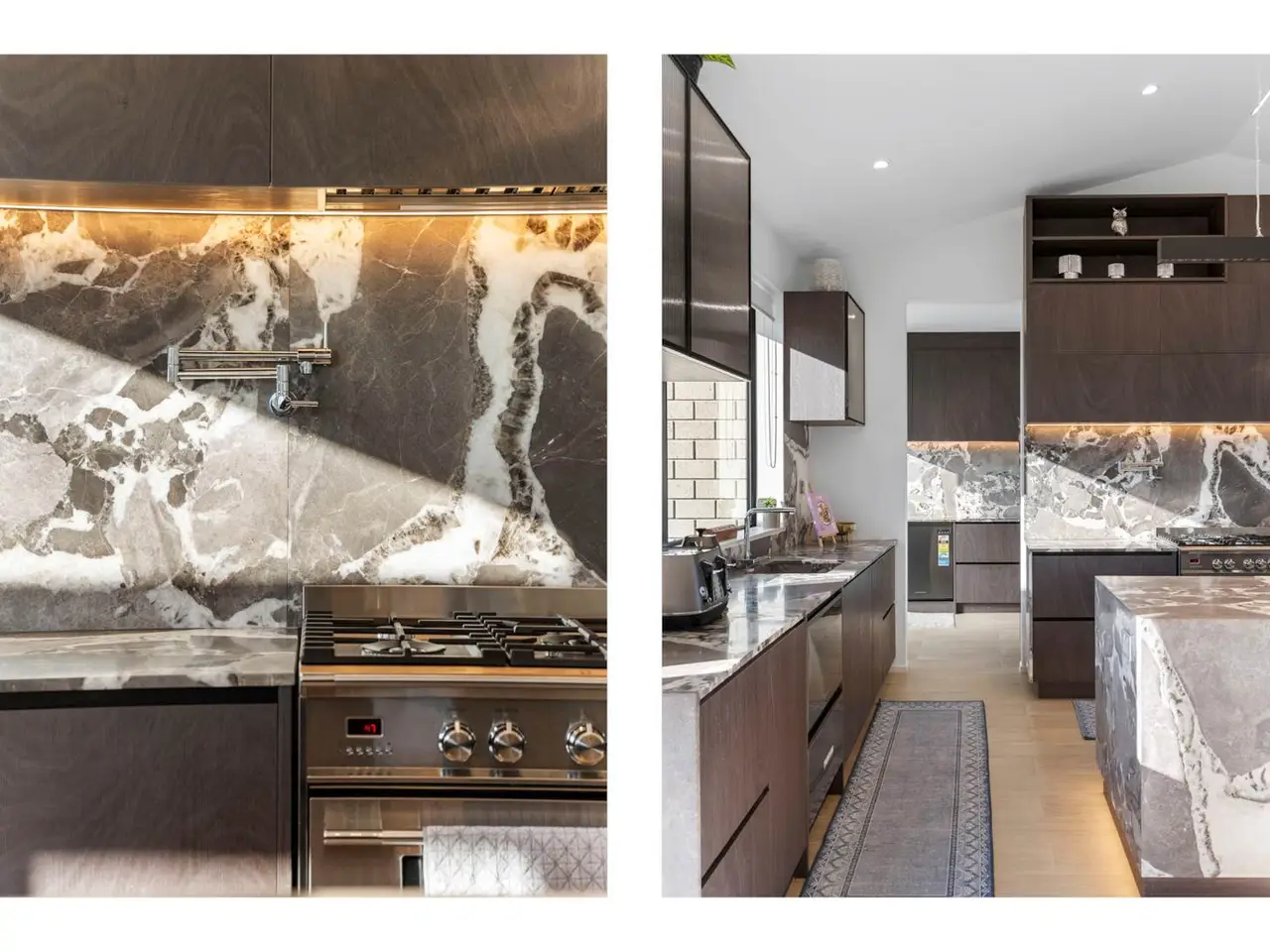 Open plan kitchen with engineered stone bench