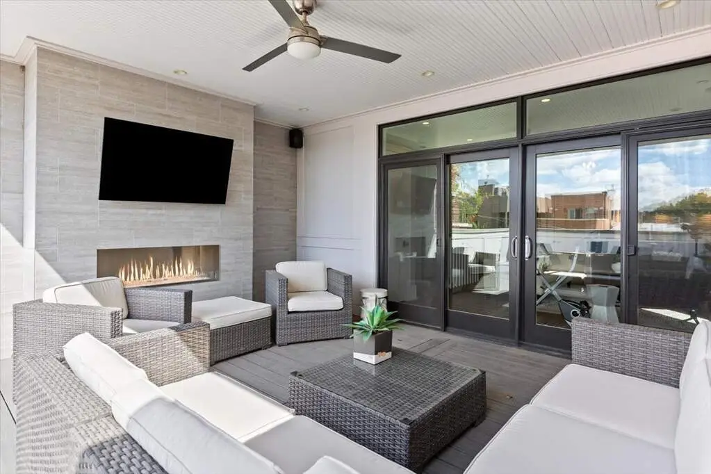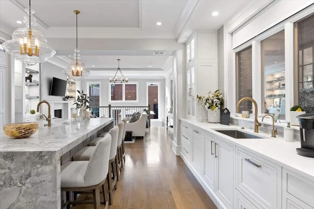 A masterclass in refined living, this stately brick and limestone residence blends enduring architecture with modern sophistication. Constructed with an uncompromising commitment to quality, every element of this home reflects elevated craftsmanship, thoughtfully curated materials, and timeless design sensibilities. An open and flowing floor plan is framed by soaring ceilings, meticulous architectural moldings, and wide rift-sawn white oak floors with custom inlay that stretch throughout the main living spaces. At the heart of the home lies a true chef's kitchen-designed as both a functional workspace and a gathering place. It features an elite Wolf and Subzero appliance suite, an artfully designed quartzite waterfall island with bar seating, and a butlers pantry with Mile in-home barista and ice machine. The second level is anchored by a serene primary suite overlooking the professionally designed outdoor living spaces. This private retreat offers two oversized closets with custom organizers and a spa-inspired marble bath boasting a sculptural soaking tub, glass-enclosed steam shower, double vanity, dedicated beauty station, and a separate water closet. Every detail designed to evoke calm and indulgence. Ascending to the top floor, a fully appointed penthouse level awaits, perfect for hosting or unwinding. It includes a sleek wet bar with beverage fridge and dishwasher, a guest suite with full bath, and a covered outdoor oasis with a built-in gas fireplace, outdoor tv, and open air space, perfect for entertaining. The lower level is equally impressive, offering an expansive recreation room with custom built-ins, a full-service bar, and a temperature-controlled wine cellar worthy of a collector. Every square foot is finished with purpose and polish. Outdoors, the home continues to impress. The rear bluestone terrace is a four-season destination, featuring radiant heat, a built-in grilling station, under counter refrigeration, and a wood-burning fireplace framed by elegant masonry. The two car, full masonry garage features radiant heat and a rooftop deck. The professionally landscaped front garden offers excellent curb appeal and the radiant heated front steps welcome you home.