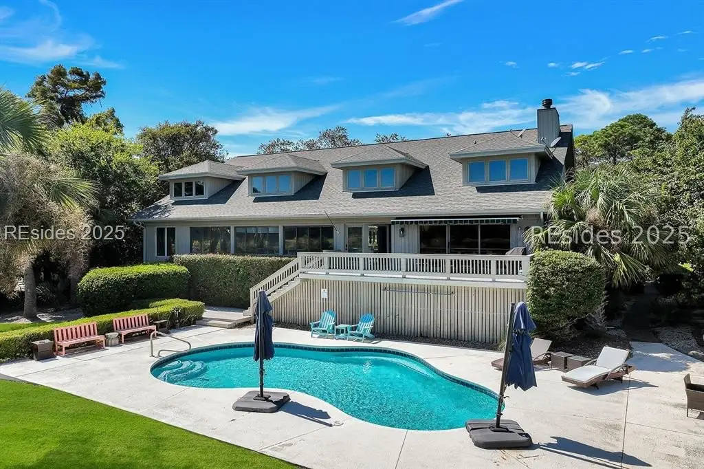 This 4500 sqft stunning 5-bedroom, 5-bath residence offers breathtaking lagoon and multiple holes of the Robert Trent Jones Golf Course (#12 green, #13 hole, #9 tee, and the 10th/11th fairways) with distant OCEAN views. This home has an inviting open kitchen/family room, expansive 1st level owner suite, spacious enclosed porch with dining area, and 4 oversized guest ensuites providing privacy and comfort for family and friends. Outdoor living is unmatched with a trex deck swimming pool, and private dock with access to the 11-mile lagoon making it ideal for fishing, kayaking, or electric boating right out your backyard. Additional features include 3 car garage and 2017 roof. The highly sought-after oceanfront community of Palmetto Dunes is known for its resort lifestyle where residents enjoy access to two beach clubs, three miles of pristine beaches, three championship golf courses, world-class tennis and pickleball facilities, Shelter Cove Harbour & Marina, exceptional dining, shopping, bike paths, and the scenic 11 mile lagoon system.