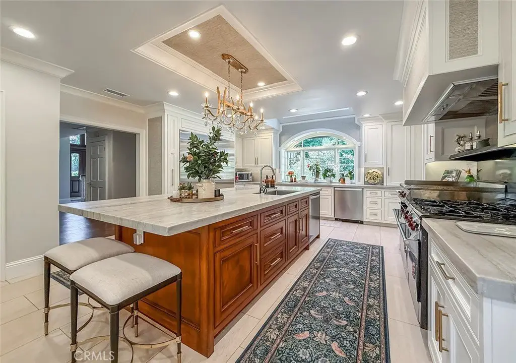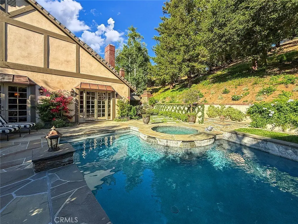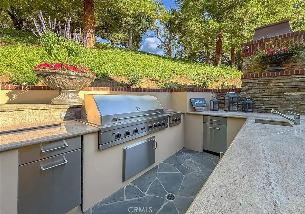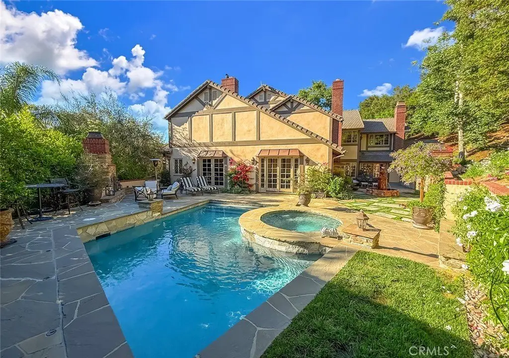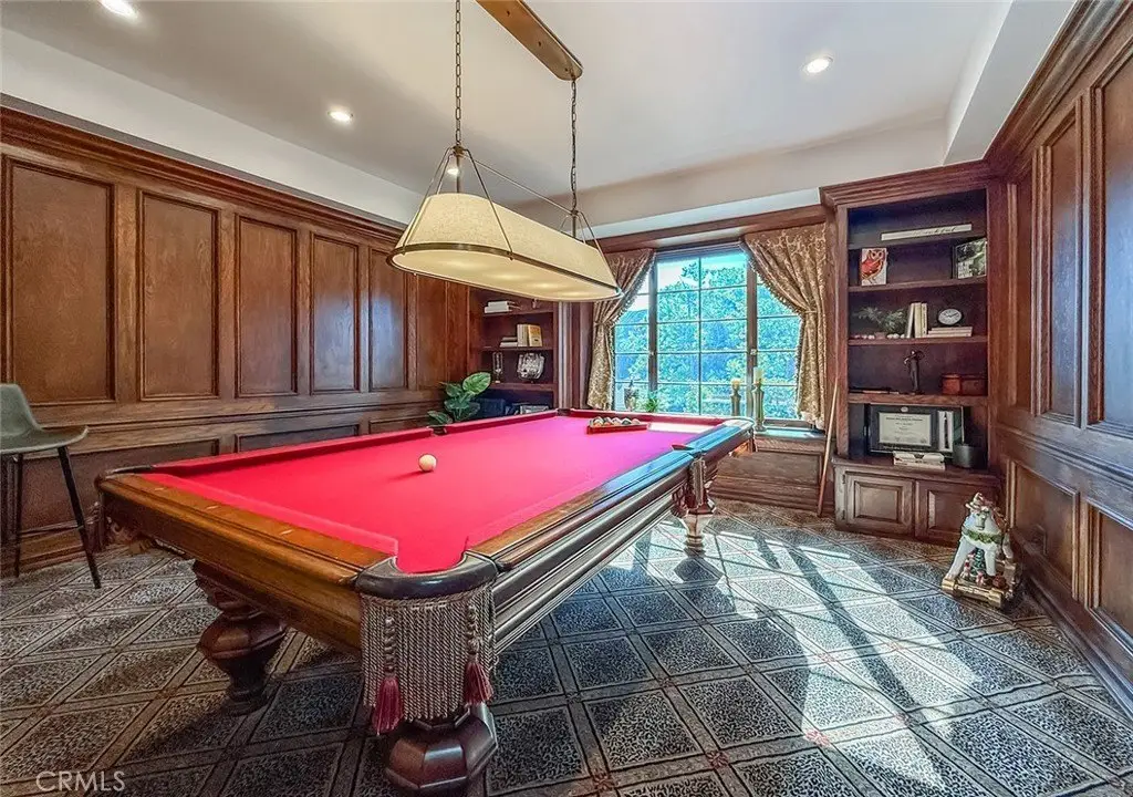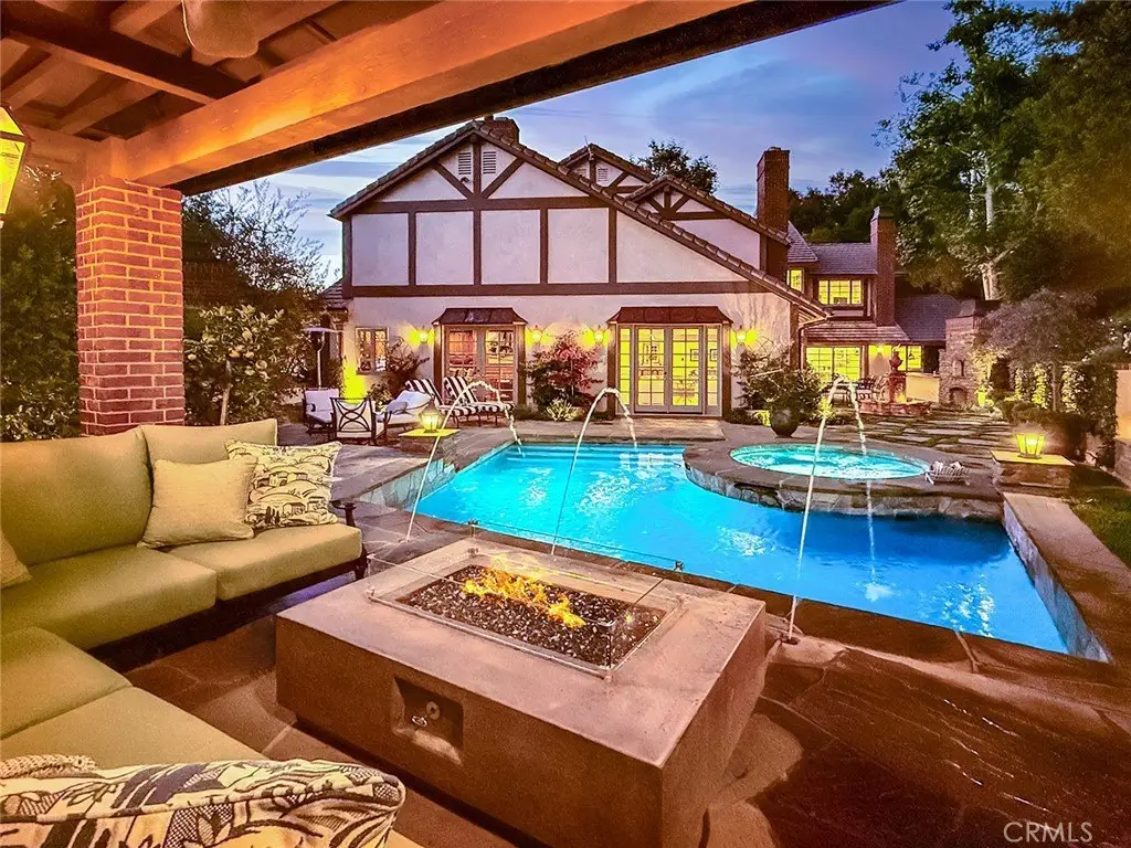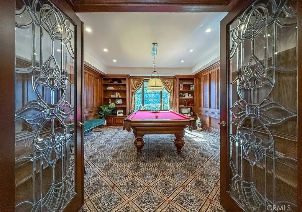 Tucked away on a pristine one-acre parcel in the prestigious enclave of North Ranch, this privately gated French Country estate is a truly singular offering—an architectural gem that embodies timeless elegance and masterful craftsmanship. Spanning approx. 6,800 square feet, this exceptional residence offers 6 bedrooms and 5.50 bathrooms, designed to accommodate both intimate living and grand-scale entertaining. From the moment you enter the stately foyer—with its soaring vaulted ceilings, intricate parquet flooring, and bespoke wood paneling—you are immersed in a home that exudes refinement at every turn. The formal entertaining spaces include a richly appointed billiard room and a gracious dining room adorned with a mirrored coffered ceiling. The formal living room is centered around a custom-carved Italian marble fireplace. Adjacent, the family room and private library flow seamlessly into an exclusive custom bar, crafted in fine wood and topped with Italian marble, featuring a lighted display and a generously scaled wine cellar ideal for the discerning collector. The fully renovated chef’s kitchen is both sophisticated and functional, offering honed quartzite countertops, Portuguese limestone floors, and a suite of top-tier appliances including a Wolf range, Sub-Zero refrigerator, Thermador baker’s oven, and Miele dishwasher for effortless entertaining. Step outdoors to discover a true al fresco sanctuary—complete with a Viking grill, wood-fired pizza oven, flagstone patio, and tranquil fountain. The recently resurfaced PebbleTech pool and spa are complemented by an outdoor fireplace, rainproof gazebo and built-in fire pit—a perfect setting for year-round enjoyment. A private office and a guest suite with en-suite bath are discreetly positioned behind the kitchen, offering convenience and privacy. Upstairs, the second-level family room features built-in media cabinetry, a striking stone fireplace, and an additional guest suite. The upper level hosts 4 more bedrooms, including the magnificent primary suite. This luxurious retreat boasts vaulted ceilings, a limestone fireplace, Clive Christian custom cabinetry, and an ensuite bath clad in exquisite St. Laurent marble, complete with its own fireplace and a 450-square-foot walk-in closet designed for the most discerning wardrobe. Throughout the estate, meticulous craftsmanship is on full display—from hand-carved moldings and coffered ceilings to leaded glass windows, wainscoting, and custom woodwork.