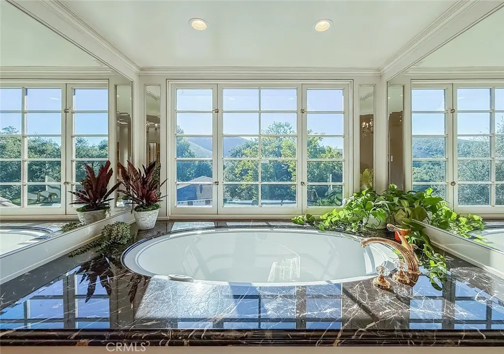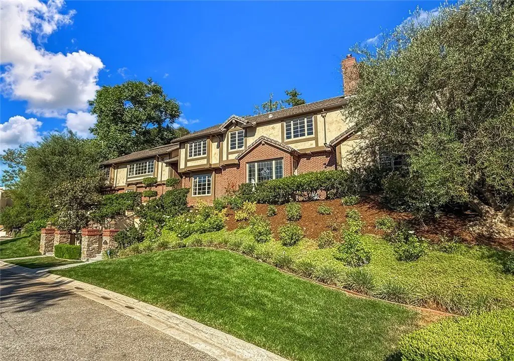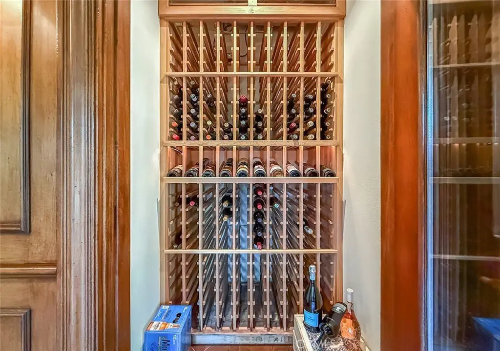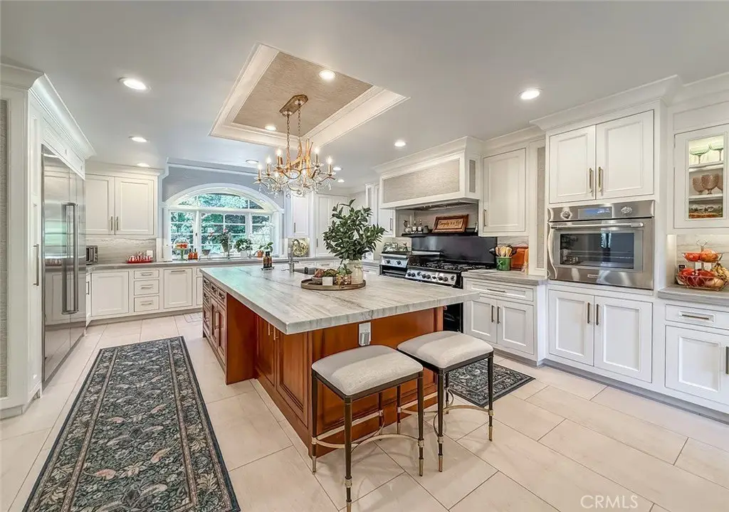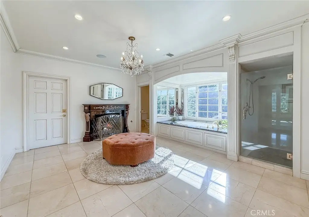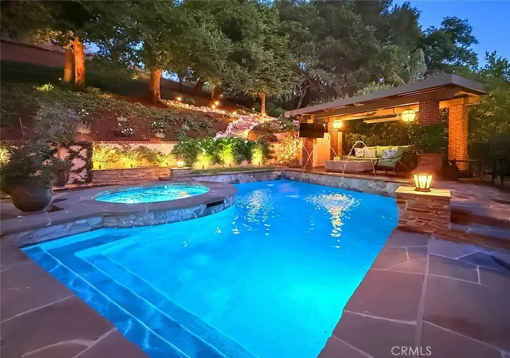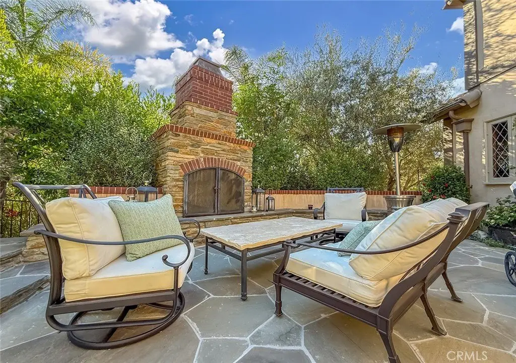 Tucked away on a pristine one-acre parcel in the prestigious enclave of North Ranch, this privately gated French Country estate is a truly singular offering—an architectural gem that embodies timeless elegance and masterful craftsmanship. Spanning approx. 6,800 square feet, this exceptional residence offers 6 bedrooms and 5.50 bathrooms, designed to accommodate both intimate living and grand-scale entertaining. From the moment you enter the stately foyer—with its soaring vaulted ceilings, intricate parquet flooring, and bespoke wood paneling—you are immersed in a home that exudes refinement at every turn. The formal entertaining spaces include a richly appointed billiard room and a gracious dining room adorned with a mirrored coffered ceiling. The formal living room is centered around a custom-carved Italian marble fireplace. Adjacent, the family room and private library flow seamlessly into an exclusive custom bar, crafted in fine wood and topped with Italian marble, featuring a lighted display and a generously scaled wine cellar ideal for the discerning collector. The fully renovated chef’s kitchen is both sophisticated and functional, offering honed quartzite countertops, Portuguese limestone floors, and a suite of top-tier appliances including a Wolf range, Sub-Zero refrigerator, Thermador baker’s oven, and Miele dishwasher for effortless entertaining. Step outdoors to discover a true al fresco sanctuary—complete with a Viking grill, wood-fired pizza oven, flagstone patio, and tranquil fountain. The recently resurfaced PebbleTech pool and spa are complemented by an outdoor fireplace, rainproof gazebo and built-in fire pit—a perfect setting for year-round enjoyment. A private office and a guest suite with en-suite bath are discreetly positioned behind the kitchen, offering convenience and privacy. Upstairs, the second-level family room features built-in media cabinetry, a striking stone fireplace, and an additional guest suite. The upper level hosts 4 more bedrooms, including the magnificent primary suite. This luxurious retreat boasts vaulted ceilings, a limestone fireplace, Clive Christian custom cabinetry, and an ensuite bath clad in exquisite St. Laurent marble, complete with its own fireplace and a 450-square-foot walk-in closet designed for the most discerning wardrobe. Throughout the estate, meticulous craftsmanship is on full display—from hand-carved moldings and coffered ceilings to leaded glass windows, wainscoting, and custom woodwork.