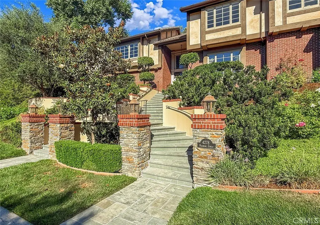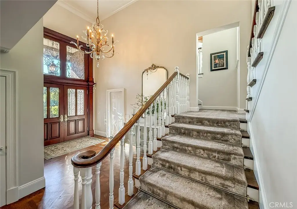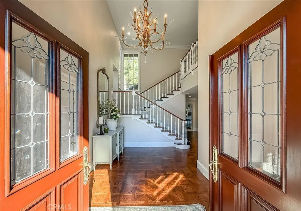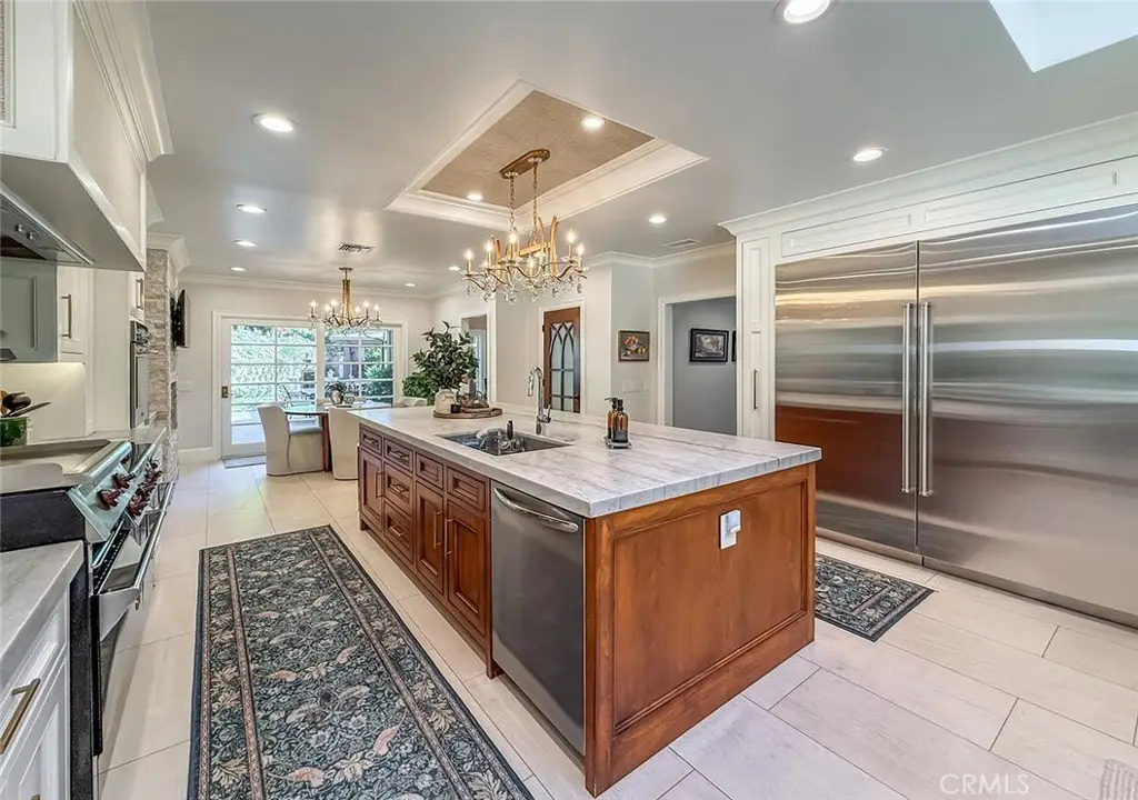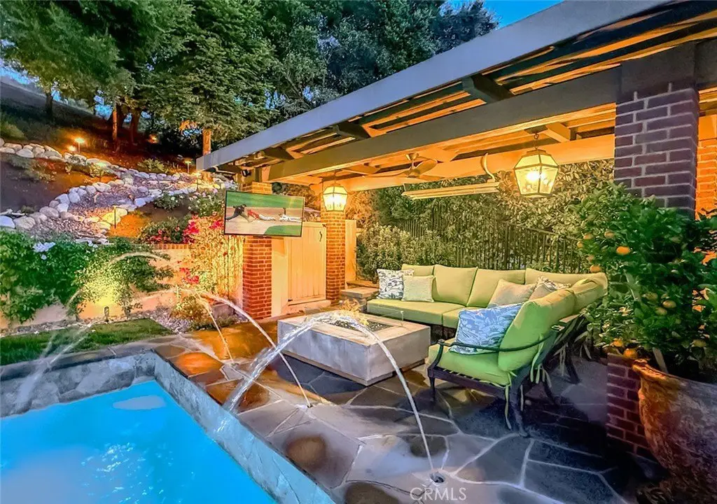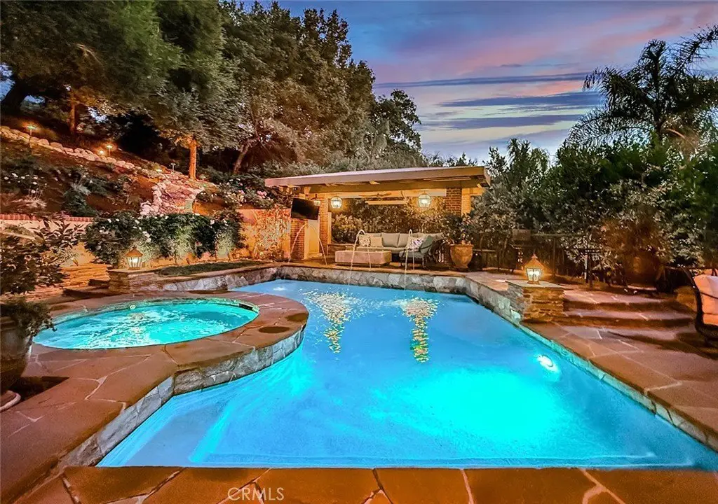 Tucked away on a pristine one-acre parcel in the prestigious enclave of North Ranch, this privately gated French Country estate is a truly singular offering—an architectural gem that embodies timeless elegance and masterful craftsmanship. Spanning approx. 6,800 square feet, this exceptional residence offers 6 bedrooms and 5.50 bathrooms, designed to accommodate both intimate living and grand-scale entertaining. From the moment you enter the stately foyer—with its soaring vaulted ceilings, intricate parquet flooring, and bespoke wood paneling—you are immersed in a home that exudes refinement at every turn. The formal entertaining spaces include a richly appointed billiard room and a gracious dining room adorned with a mirrored coffered ceiling. The formal living room is centered around a custom-carved Italian marble fireplace. Adjacent, the family room and private library flow seamlessly into an exclusive custom bar, crafted in fine wood and topped with Italian marble, featuring a lighted display and a generously scaled wine cellar ideal for the discerning collector. The fully renovated chef’s kitchen is both sophisticated and functional, offering honed quartzite countertops, Portuguese limestone floors, and a suite of top-tier appliances including a Wolf range, Sub-Zero refrigerator, Thermador baker’s oven, and Miele dishwasher for effortless entertaining. Step outdoors to discover a true al fresco sanctuary—complete with a Viking grill, wood-fired pizza oven, flagstone patio, and tranquil fountain. The recently resurfaced PebbleTech pool and spa are complemented by an outdoor fireplace, rainproof gazebo and built-in fire pit—a perfect setting for year-round enjoyment. A private office and a guest suite with en-suite bath are discreetly positioned behind the kitchen, offering convenience and privacy. Upstairs, the second-level family room features built-in media cabinetry, a striking stone fireplace, and an additional guest suite. The upper level hosts 4 more bedrooms, including the magnificent primary suite. This luxurious retreat boasts vaulted ceilings, a limestone fireplace, Clive Christian custom cabinetry, and an ensuite bath clad in exquisite St. Laurent marble, complete with its own fireplace and a 450-square-foot walk-in closet designed for the most discerning wardrobe. Throughout the estate, meticulous craftsmanship is on full display—from hand-carved moldings and coffered ceilings to leaded glass windows, wainscoting, and custom woodwork.