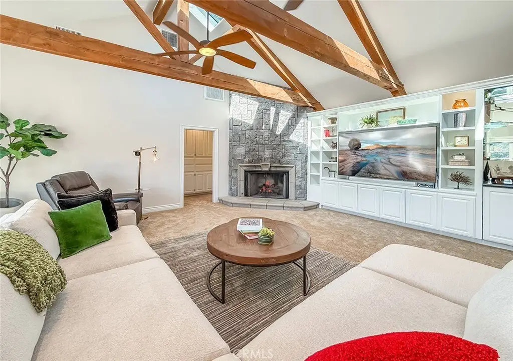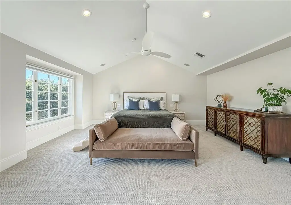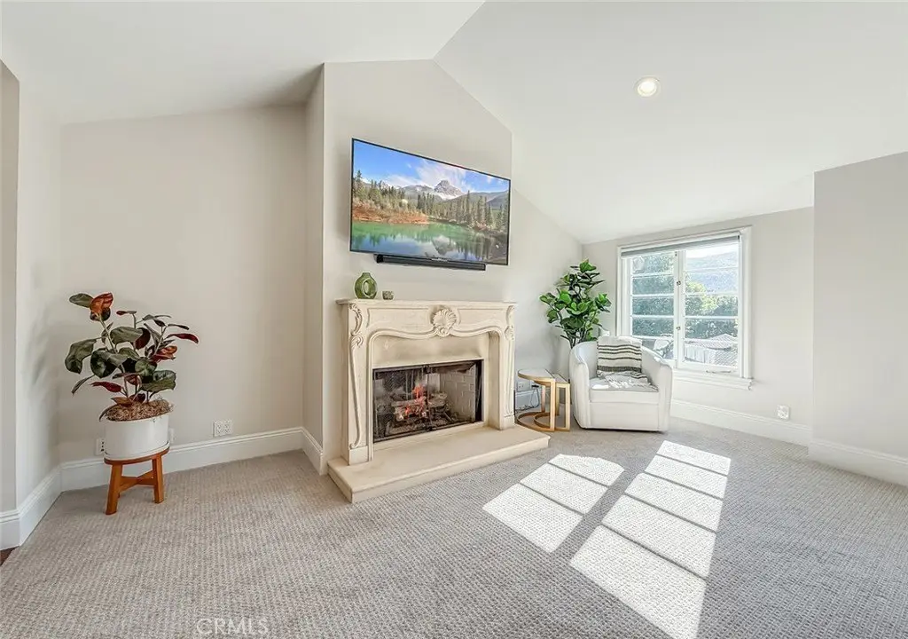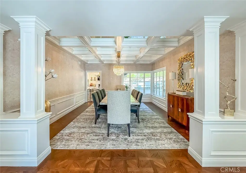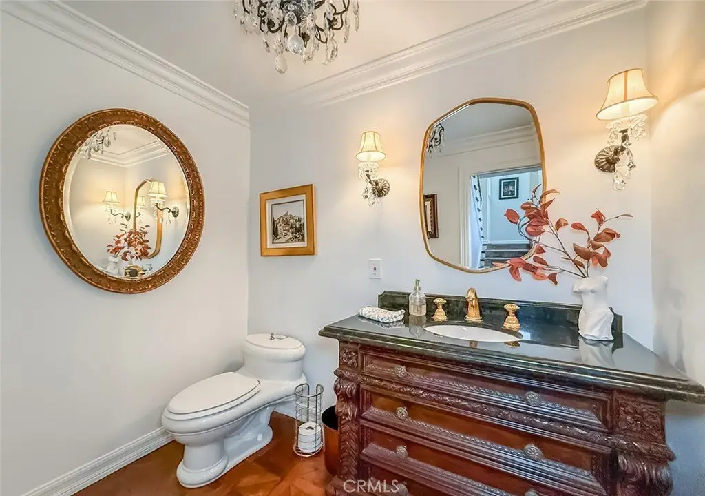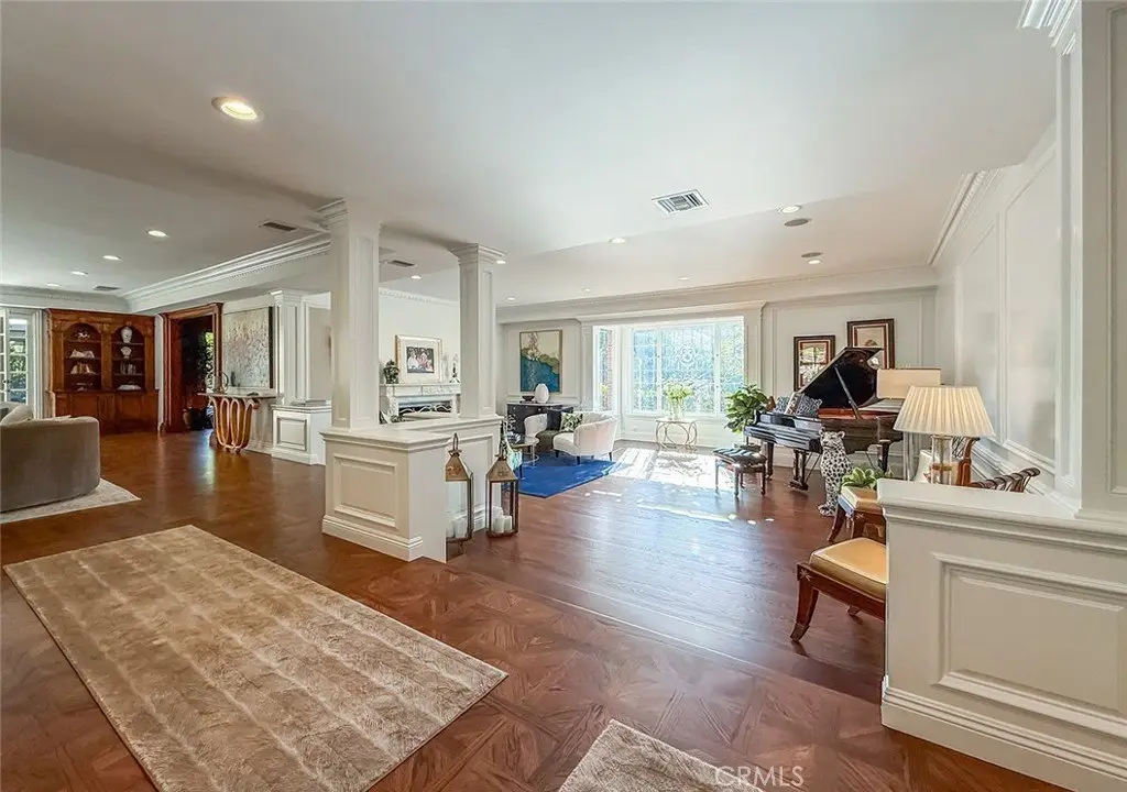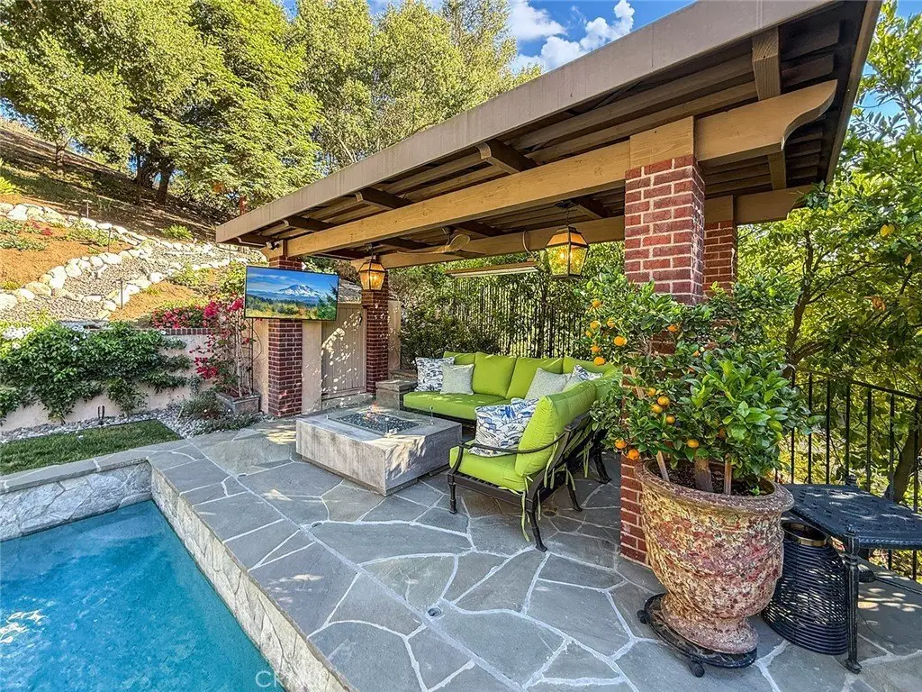 Tucked away on a pristine one-acre parcel in the prestigious enclave of North Ranch, this privately gated French Country estate is a truly singular offering—an architectural gem that embodies timeless elegance and masterful craftsmanship. Spanning approx. 6,800 square feet, this exceptional residence offers 6 bedrooms and 5.50 bathrooms, designed to accommodate both intimate living and grand-scale entertaining. From the moment you enter the stately foyer—with its soaring vaulted ceilings, intricate parquet flooring, and bespoke wood paneling—you are immersed in a home that exudes refinement at every turn. The formal entertaining spaces include a richly appointed billiard room and a gracious dining room adorned with a mirrored coffered ceiling. The formal living room is centered around a custom-carved Italian marble fireplace. Adjacent, the family room and private library flow seamlessly into an exclusive custom bar, crafted in fine wood and topped with Italian marble, featuring a lighted display and a generously scaled wine cellar ideal for the discerning collector. The fully renovated chef’s kitchen is both sophisticated and functional, offering honed quartzite countertops, Portuguese limestone floors, and a suite of top-tier appliances including a Wolf range, Sub-Zero refrigerator, Thermador baker’s oven, and Miele dishwasher for effortless entertaining. Step outdoors to discover a true al fresco sanctuary—complete with a Viking grill, wood-fired pizza oven, flagstone patio, and tranquil fountain. The recently resurfaced PebbleTech pool and spa are complemented by an outdoor fireplace, rainproof gazebo and built-in fire pit—a perfect setting for year-round enjoyment. A private office and a guest suite with en-suite bath are discreetly positioned behind the kitchen, offering convenience and privacy. Upstairs, the second-level family room features built-in media cabinetry, a striking stone fireplace, and an additional guest suite. The upper level hosts 4 more bedrooms, including the magnificent primary suite. This luxurious retreat boasts vaulted ceilings, a limestone fireplace, Clive Christian custom cabinetry, and an ensuite bath clad in exquisite St. Laurent marble, complete with its own fireplace and a 450-square-foot walk-in closet designed for the most discerning wardrobe. Throughout the estate, meticulous craftsmanship is on full display—from hand-carved moldings and coffered ceilings to leaded glass windows, wainscoting, and custom woodwork.