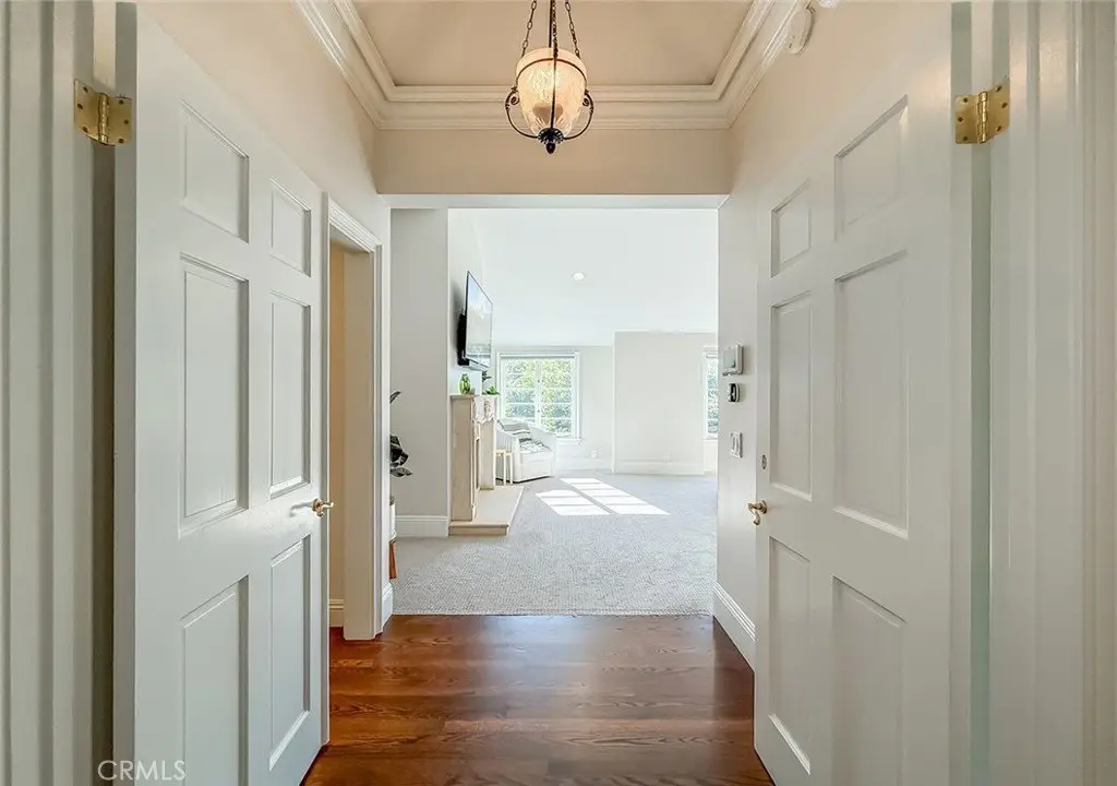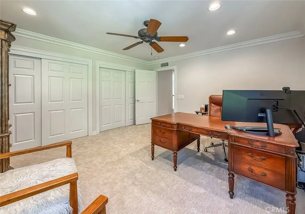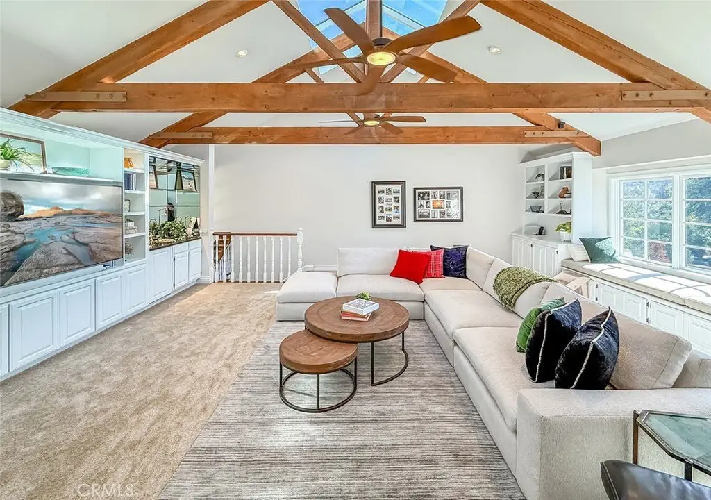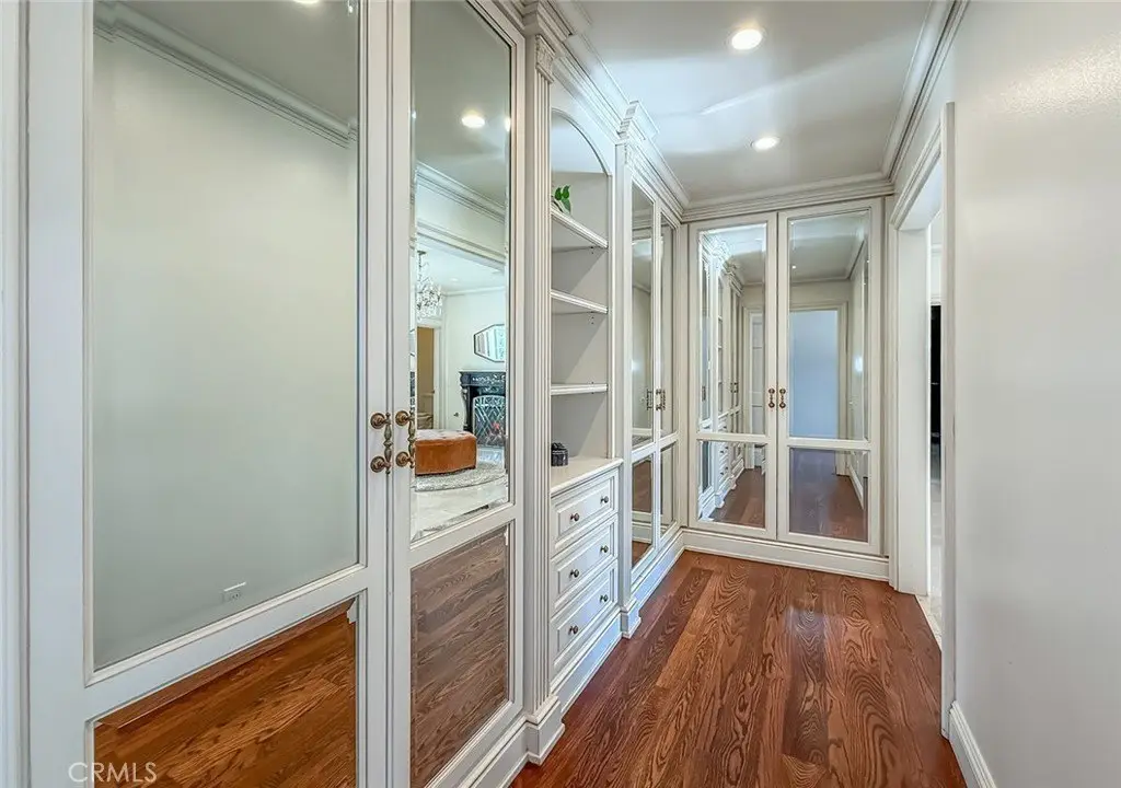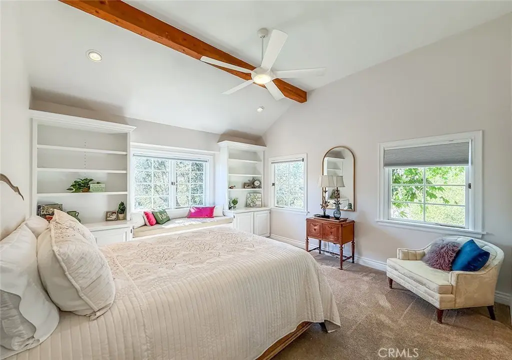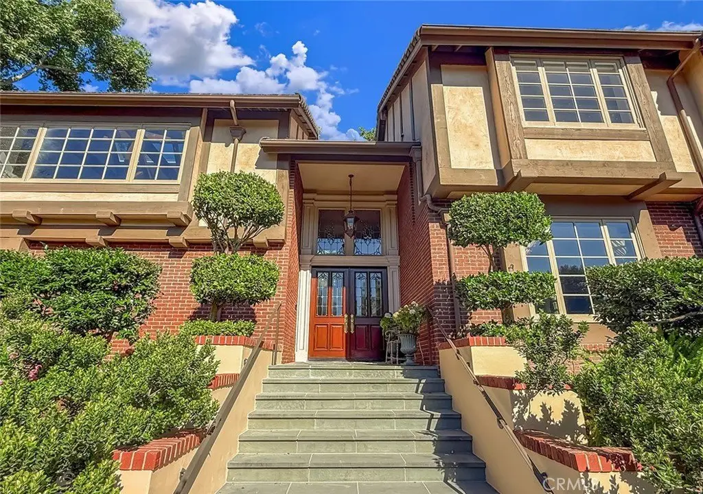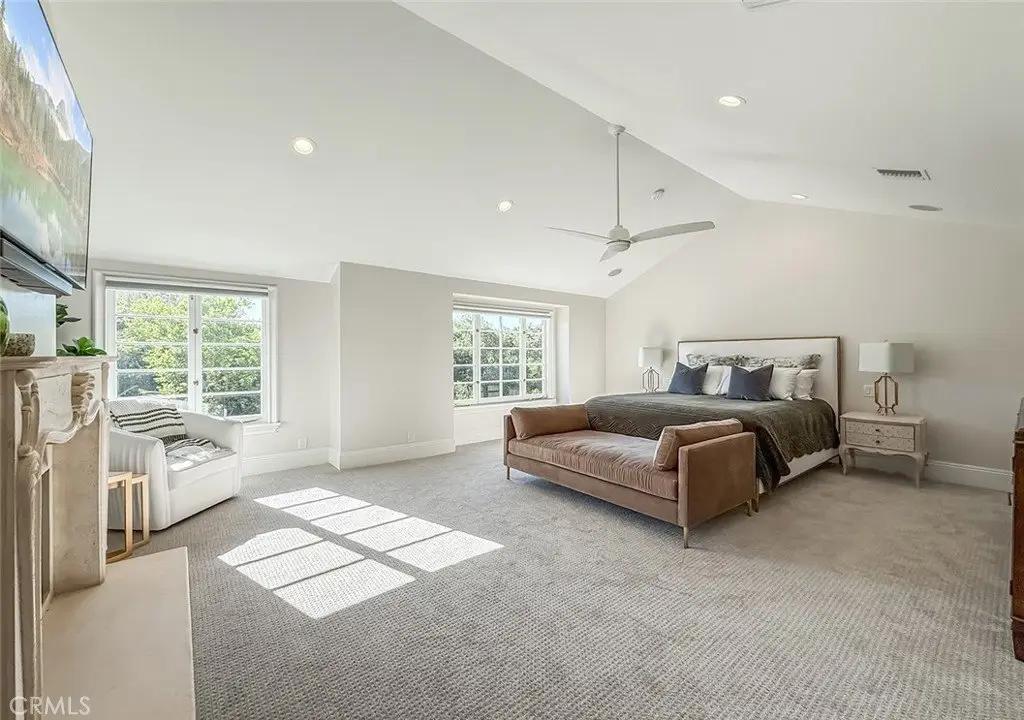 Tucked away on a pristine one-acre parcel in the prestigious enclave of North Ranch, this privately gated French Country estate is a truly singular offering—an architectural gem that embodies timeless elegance and masterful craftsmanship. Spanning approx. 6,800 square feet, this exceptional residence offers 6 bedrooms and 5.50 bathrooms, designed to accommodate both intimate living and grand-scale entertaining. From the moment you enter the stately foyer—with its soaring vaulted ceilings, intricate parquet flooring, and bespoke wood paneling—you are immersed in a home that exudes refinement at every turn. The formal entertaining spaces include a richly appointed billiard room and a gracious dining room adorned with a mirrored coffered ceiling. The formal living room is centered around a custom-carved Italian marble fireplace. Adjacent, the family room and private library flow seamlessly into an exclusive custom bar, crafted in fine wood and topped with Italian marble, featuring a lighted display and a generously scaled wine cellar ideal for the discerning collector. The fully renovated chef’s kitchen is both sophisticated and functional, offering honed quartzite countertops, Portuguese limestone floors, and a suite of top-tier appliances including a Wolf range, Sub-Zero refrigerator, Thermador baker’s oven, and Miele dishwasher for effortless entertaining. Step outdoors to discover a true al fresco sanctuary—complete with a Viking grill, wood-fired pizza oven, flagstone patio, and tranquil fountain. The recently resurfaced PebbleTech pool and spa are complemented by an outdoor fireplace, rainproof gazebo and built-in fire pit—a perfect setting for year-round enjoyment. A private office and a guest suite with en-suite bath are discreetly positioned behind the kitchen, offering convenience and privacy. Upstairs, the second-level family room features built-in media cabinetry, a striking stone fireplace, and an additional guest suite. The upper level hosts 4 more bedrooms, including the magnificent primary suite. This luxurious retreat boasts vaulted ceilings, a limestone fireplace, Clive Christian custom cabinetry, and an ensuite bath clad in exquisite St. Laurent marble, complete with its own fireplace and a 450-square-foot walk-in closet designed for the most discerning wardrobe. Throughout the estate, meticulous craftsmanship is on full display—from hand-carved moldings and coffered ceilings to leaded glass windows, wainscoting, and custom woodwork.