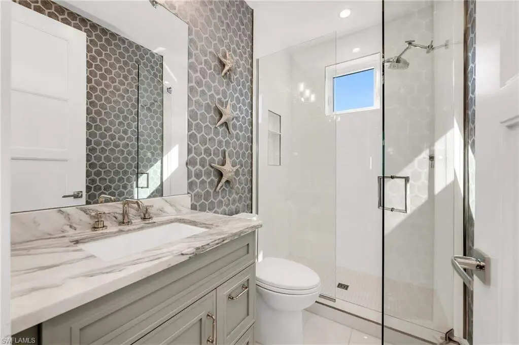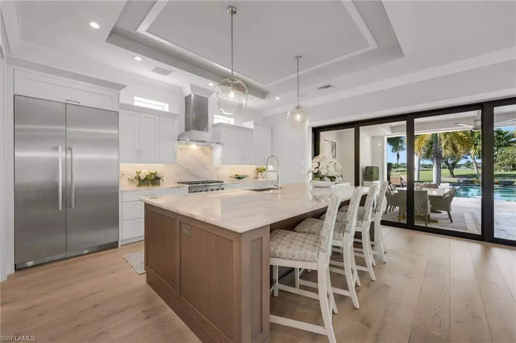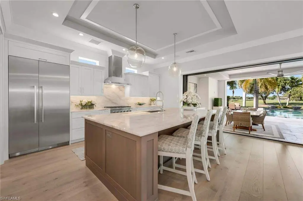 Resort-Style Luxury in The Landings at Bears Paw, Stunning- 4 Bedroom plus Den, 5 1/2 Bath, Custom Home with Gulf Access. Welcome to The Landings at Bears Paw, Naples hidden gem tucked between the Gordan River, Greenway Park, and the Jack Nicklaus Signature Bears Paw Golf Course. This stunning 2019-built custom two-story home by MHK Architect & Planning has impeccable finishes and details. Designed for entertaining and Florida living at its best, the home boasts a Gourmet Kitchen, with Thermador Appliances, Custom Cabinetry, Enlarge Island & Pantry. Three bedrooms are all-in suite, providing privacy and luxury for family and guests. The media room ia a showpiece with custom cabinetry, granite counters, and refrigator drawers-perfect for movie nights, or hosting friends. Step outside and enjoy your golf course views right from your expansive 1900 sf lanai, featuring a custom fireplace, fully equipped outdoor kitchen, resort-style pool with fire bowls and fire table, perfect for sunset cocktails or weekend gatherings. Plus, your private dock with boat slip offers direct access to the Gulf, for endless adventures. Every detail has been thoughtfully curated for both function and flair, from spacious living areas to light filled interiors and elegant finishes throughout. This home combines recreation, relaxation, and luxury into one perfect package.