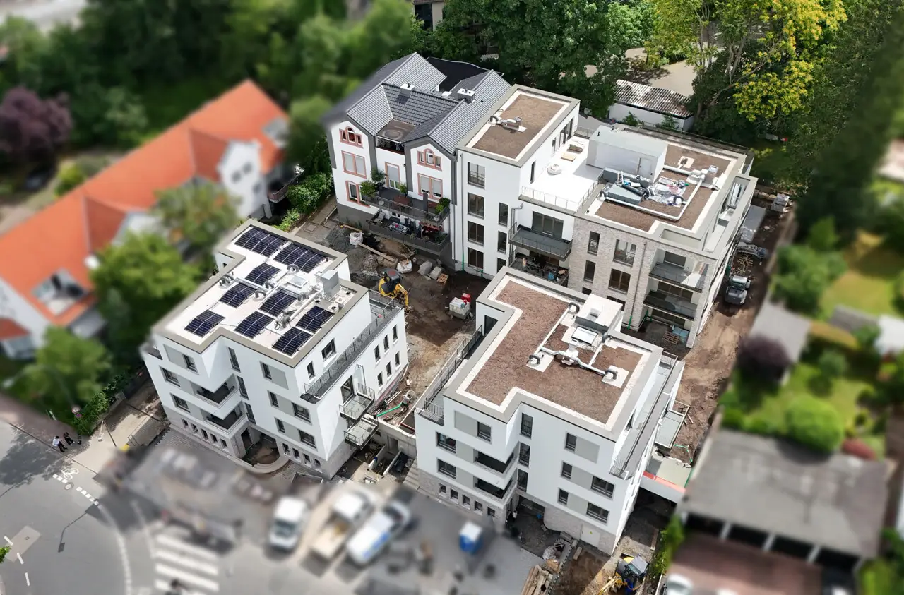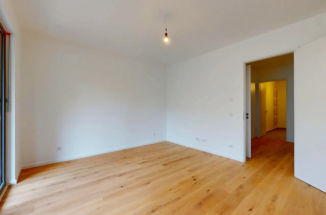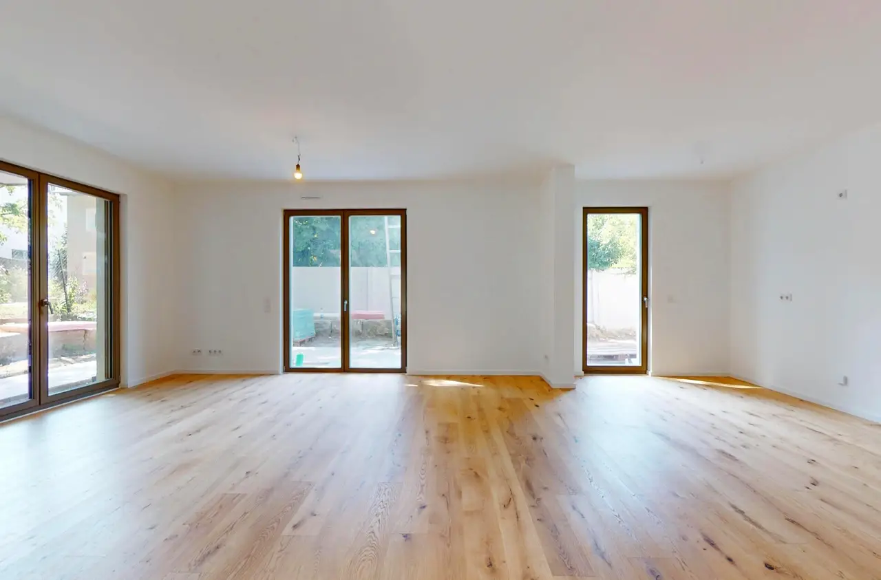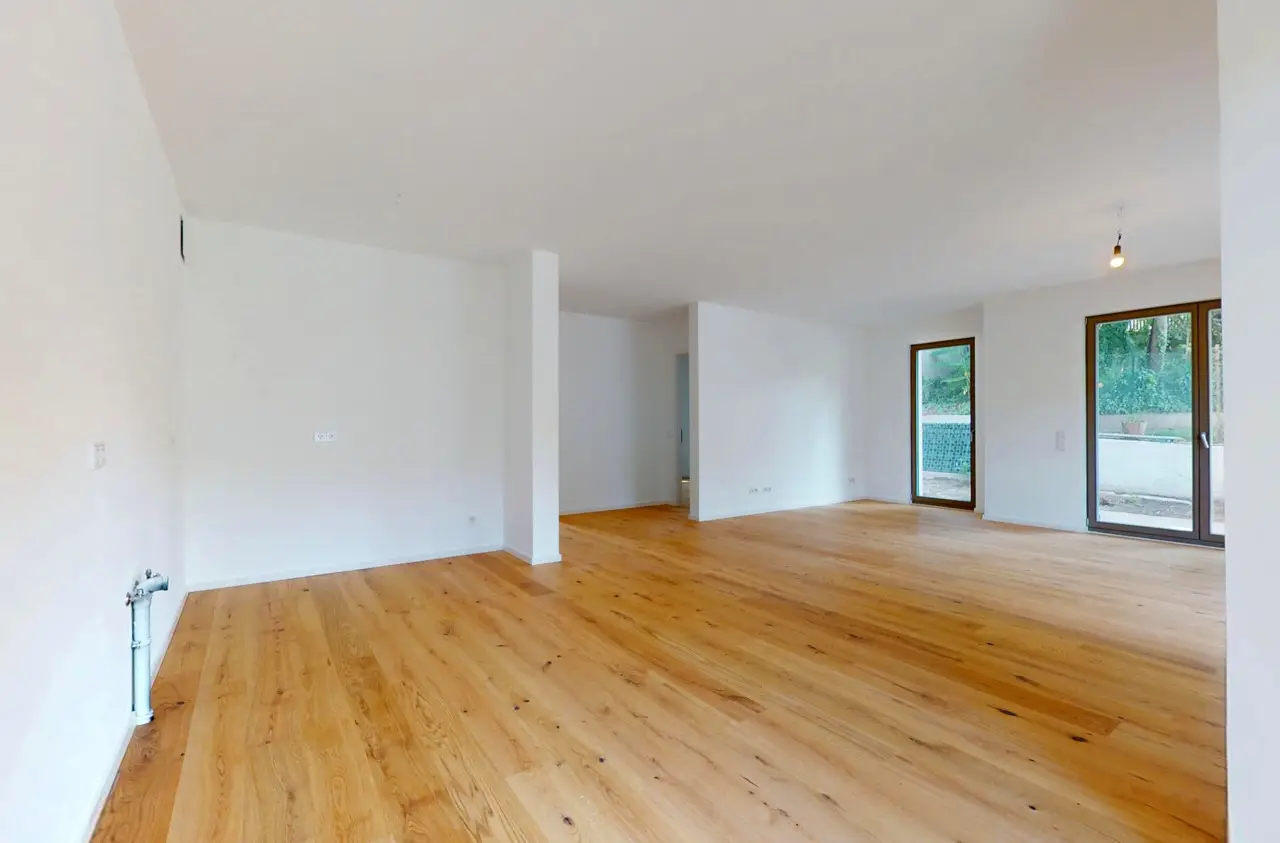 This exclusive first floor apartment combines contemporary living with high-quality comfort and a well thought-out floor plan. It is located in an architecturally appealing new building ensemble in a quiet, mature location in Alt-Eschersheim and offers you the special advantage of first-time occupancy. Access to the apartment is via a well-kept front garden, which emphasizes the private and inviting character of the building. As soon as you enter, you are greeted by a spacious entrance area from which all rooms are accessed. The hallway opens harmoniously into a spacious living, dining and cooking area, which forms the heart of the apartment. Floor-to-ceiling windows and the south-east orientation ensure light-flooded rooms and a bright, friendly living atmosphere. High-quality oak parquet flooring with a plank look creates a warm, stylish ambience, while large-format porcelain stoneware tiles in the two bathrooms exude timeless elegance. The bathrooms are equipped to a high standard with walk-in showers and bathtubs, elegant designer washbasins and branded fittings. A particular highlight of this apartment is the exclusive outdoor space: two terraces, an architecturally attractive sun deck and a lovingly designed garden area extend the living space into the open air. These areas are exclusively available to this unit and invite you to linger and relax in the greenery. The apartment is located in an energy-efficient KfW Efficiency House 55 and is equipped with a future-oriented hybrid heating system - consisting of an air heat pump and modern gas condensing technology - as well as photovoltaics. This property is ideal for discerning couples, families or senior citizens who place particular value on quality, peace and quiet and an apartment with a garden and terraces - without having to sacrifice proximity to Frankfurt city center. It is possible to purchase a two-room neighboring apartment (approx. 59 m²) to create a guest, office or au-pair apartment and extend the living space to approx. 192 m².