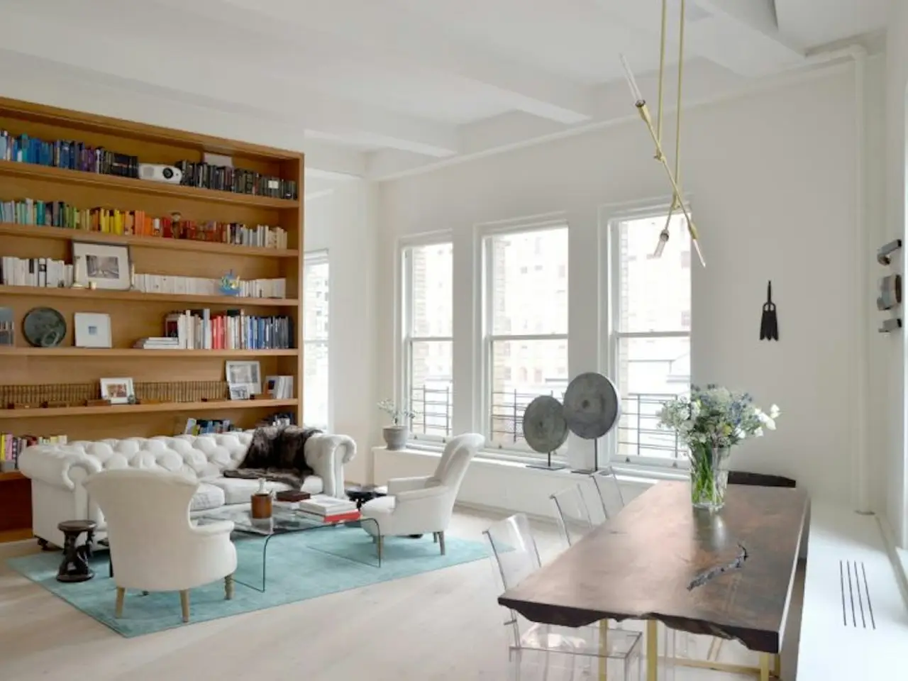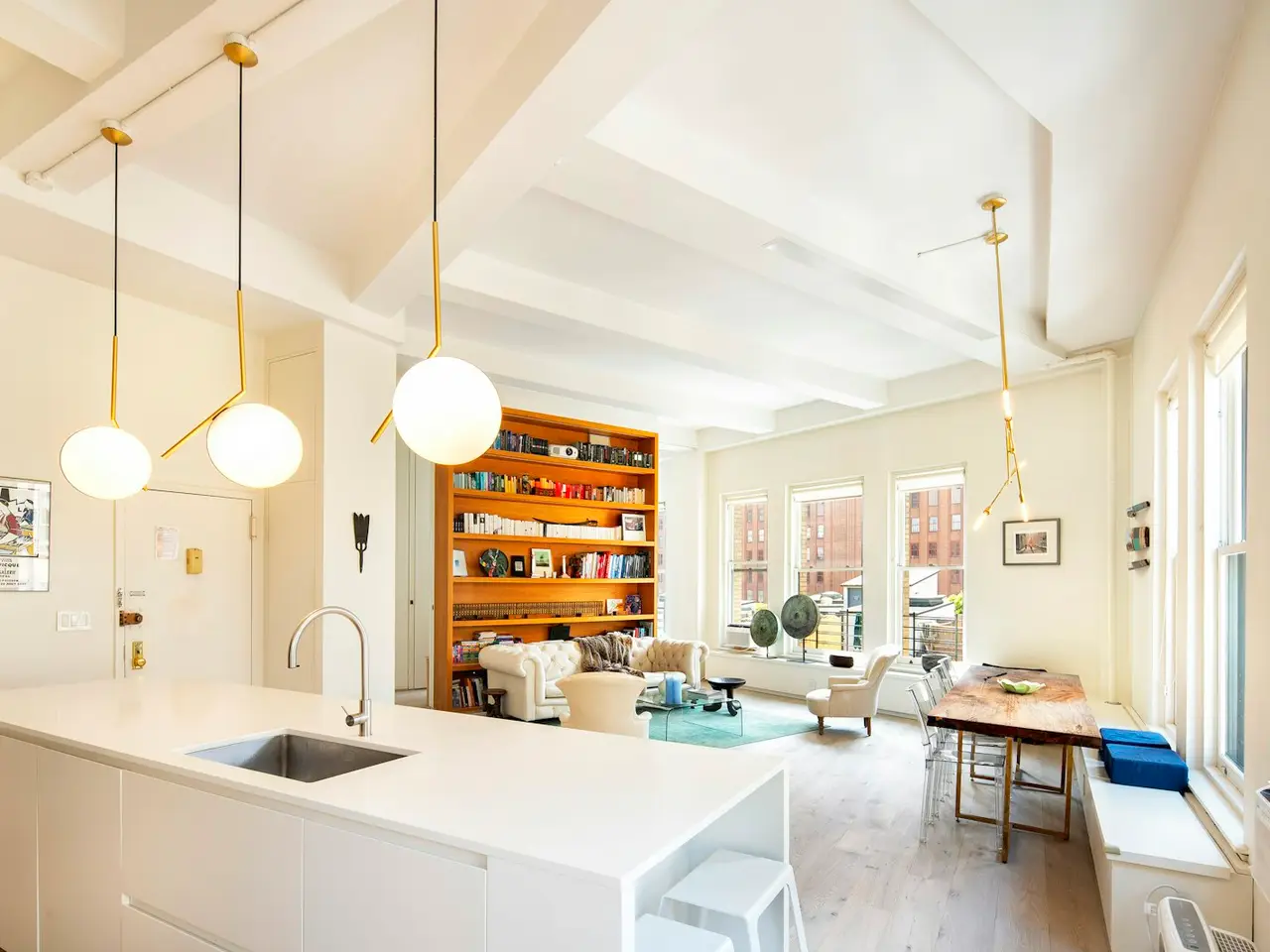 A rare opportunity to live in an EXCEPTIONAL TRIBECA LOFT!! Soaring 12 foot beamed ceilings throughout with dramatic floor-to-ceiling windows that flood every room with natural sunlight and showcase iconic open southern views of downtown Manhattan. From the moment you enter, a canvas unfolds, creating a harmonious tapestry of calm amid the energy and excitement of living perfectly positioned in the very heart of Tribeca, between Franklin and Leonard Streets. An artfully designed open-floor plan successfully integrates the living room, dining room and kitchen, all anchored by a 9.5 foot custom-designed, floor-to-ceiling oak bookcase. The ceiling in the living room cleverly conceals an electrically operated drop-down 93x39 Elite Screen for those stay-at-home immersive movie nights. The impeccably renovated open kitchen features a long center island with Corian countertops perfect for the master chef and for entertaining. Top-of-the-line appliances, include a Viking gas stove, Miele dishwasher and dryer, Gaggenau fridge and freezer, Wolf oven and range, U Line wine fridge, warming oven,pantry and an abundance of storage. An in-unit Miele washer-dryer of course! The adjacent dining area is as functional as it is beautiful, easily accommodating a 10-person table beneath striking designer lighting. It is ideal for intimate dinners or larger gatherings surrounded by picture postcard views of some of Tribeca's great architectural buildings. The primary bedroom is awash with its open southern exposure, accommodates a king-size bed and custom closets. The second bedroom enjoys the same radiant natural light and is perfect as a child's room, den, office or for your guest. The bathroom is nothing short of spa-worthy. Artfully designed to include double sinks and an oversized walk-in shower with dual large shower heads. This architect who created this beautiful apartment is Dieter Vander Velpen and was featured in the Belgian Financial Times as well as in the interior design book The Ultimate Guide to Apartments by Beta Plus. 100 Hudson Street is one of Tribeca's iconic boutique Loft buildings. With just a handful of residences, it offers quiet privacy, exceptional architectural character and a roof terrace with skyline views that stretch across the city. The very soul of TRIBECA is just outside your door cobblestone streets, Michelin-star dining, land-marked architecture, world-renown art galleries, and Hudson River park just a stone's throw away. Whether it's morning espresso at Bluestone Lane, brunch at Bubby's, dinner at Locanda Verde or a delightful stroll through Duane park, this is downtown living at its very best!! Offered furnished or unfurnished By Appointment. Welcome Home!!