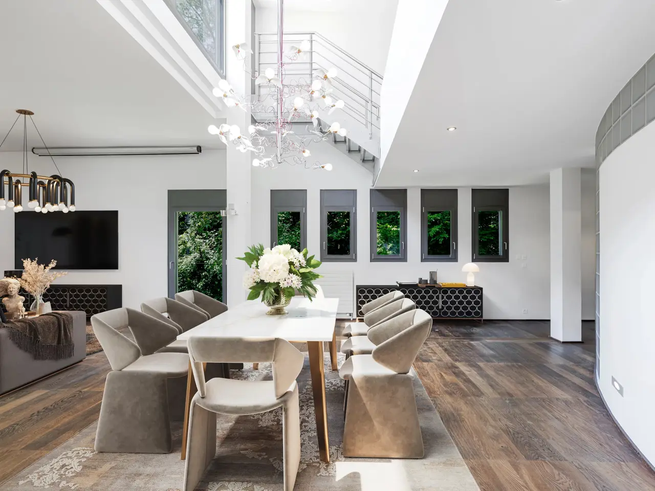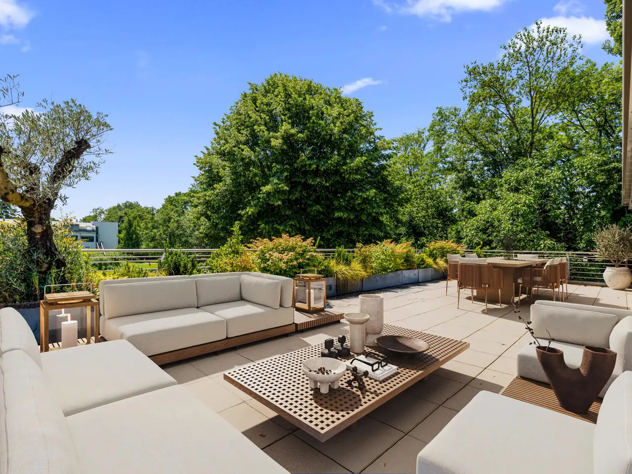 Discover this exclusive loft-style apartment, elegantly laid out over two levels and ideally located in Troinex, near the charming area of Vieux-Carouge. The first level offers an impressive open living space with a 7-meter-high ceiling, featuring a spacious living room adorned with a suspended fireplace and a dining area. This level also includes a high-end open kitchen with a central island, two bedrooms, an Italian-style shower room, guest toilets, and a laundry room. Upstairs, an elegant master suite awaits, with a complete bathroom (bathtub and shower) and a dressing room, accompanied by a second bedroom with an en-suite shower room. A small kitchen, conveniently situated for terrace access, makes it easy to enjoy the 85 m² terrace with breathtaking views over the residence’s park. This exceptional property stands out for its many advantages: a private end-of-building location with no overlooking neighbors, bright and open spaces, remarkable ceiling height, premium materials and finishes, a peaceful setting, and proximity to the charm of Vieux-Carouge. Two closed garages, an outdoor parking space, a cellar, and two wine cellars complete the offerings of this unique property.