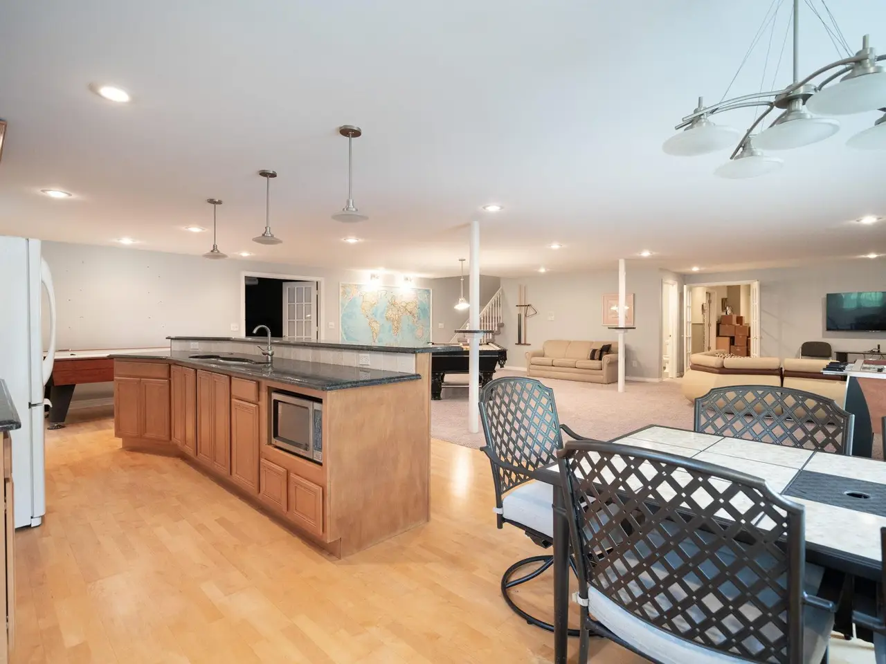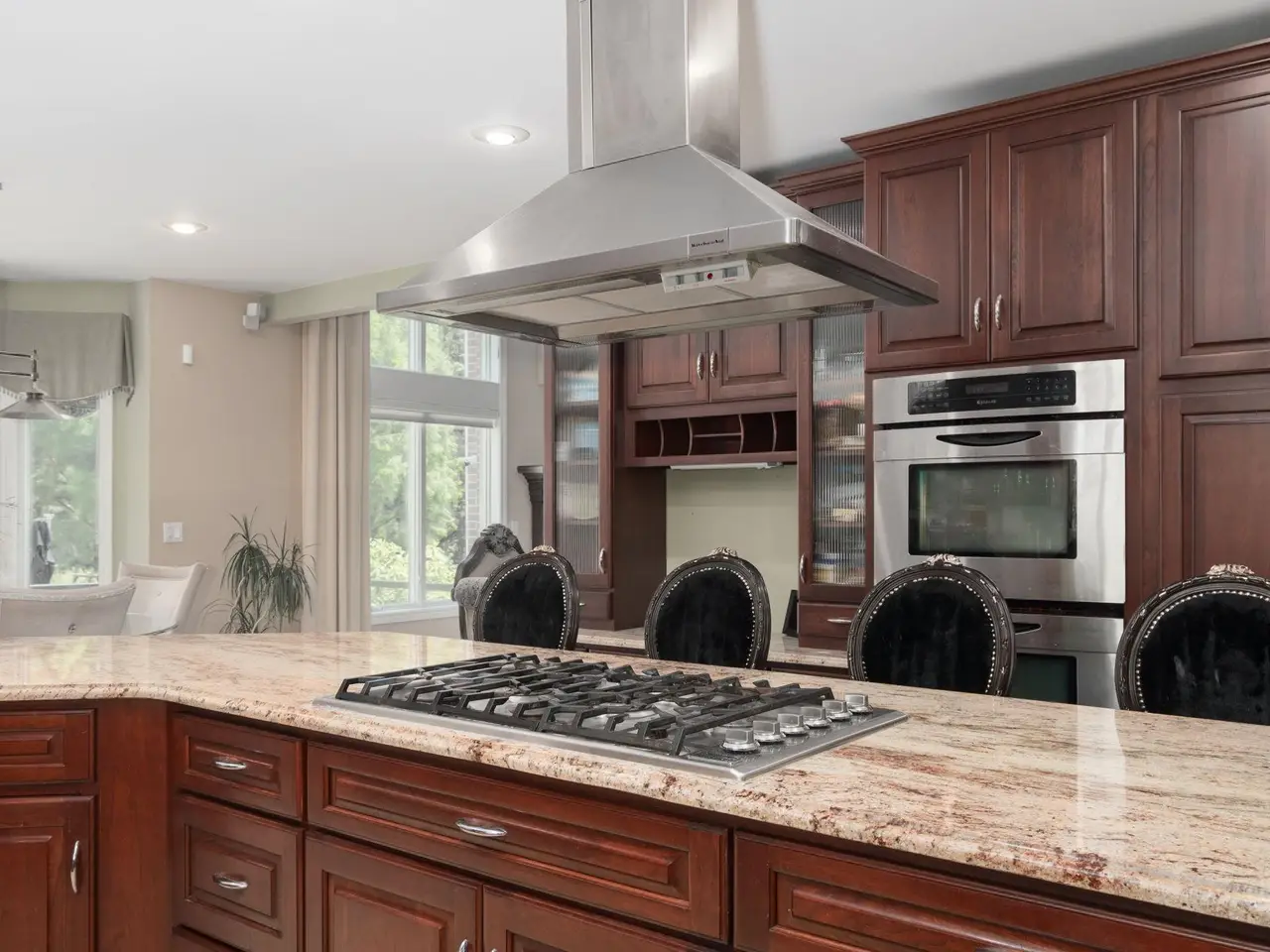 - Chef’s kitchen with cherry cabinetry and 12-ft island