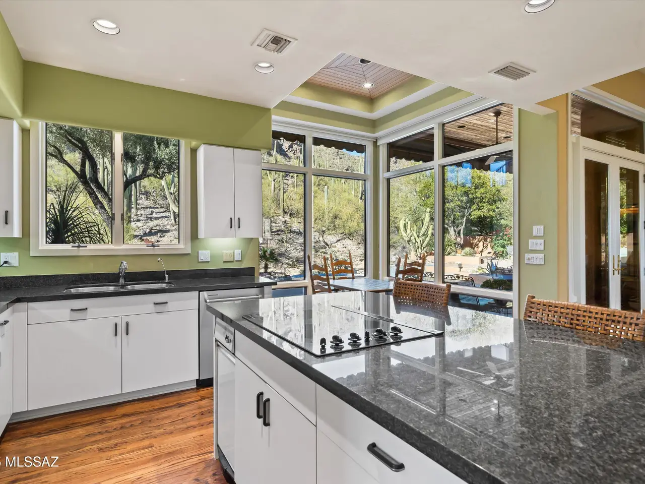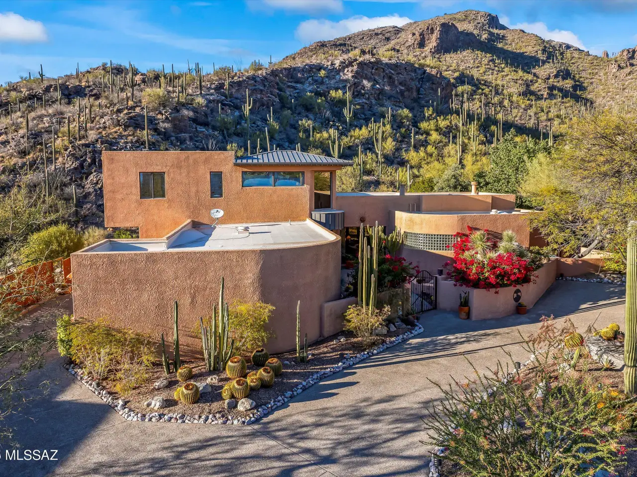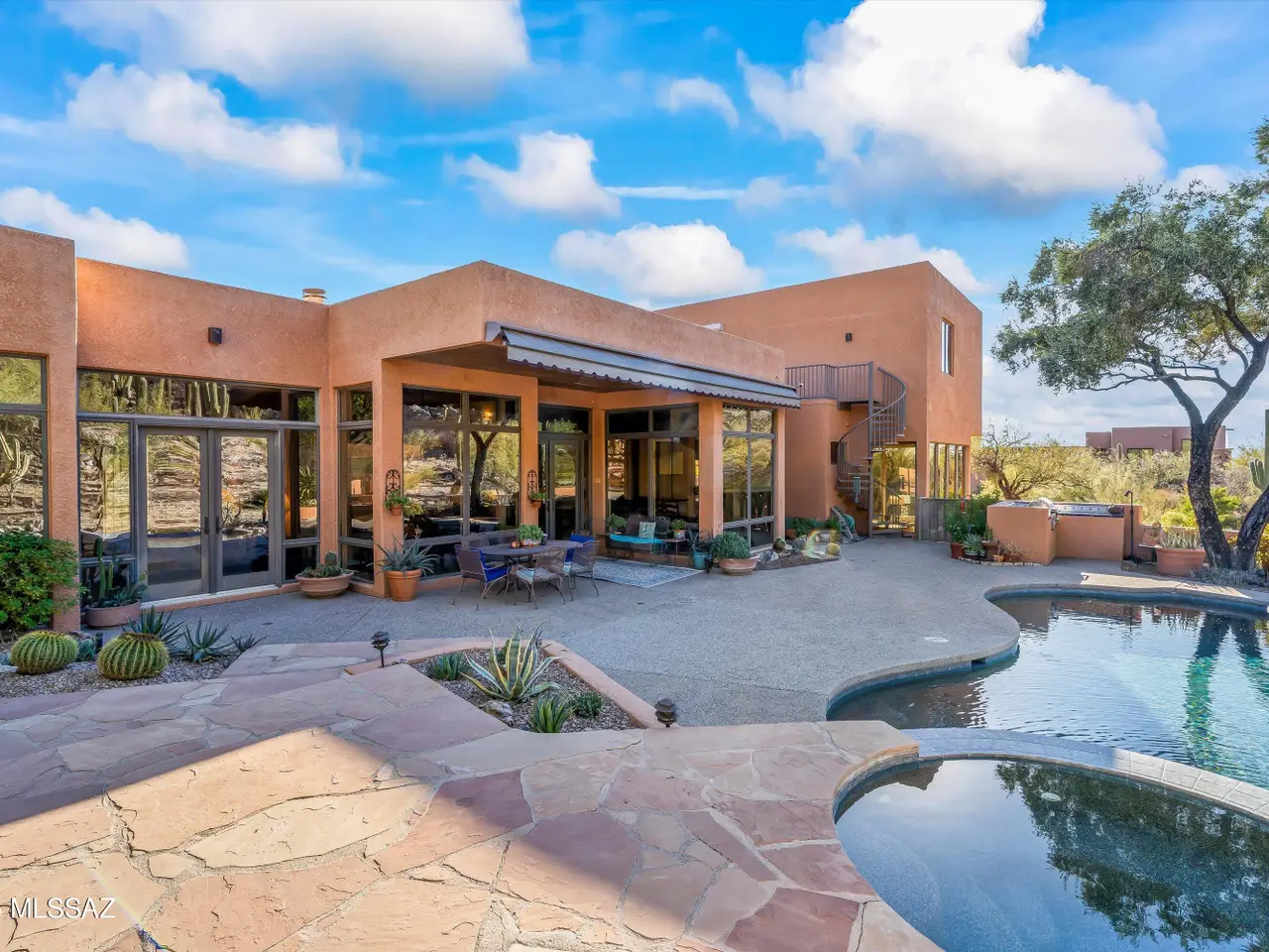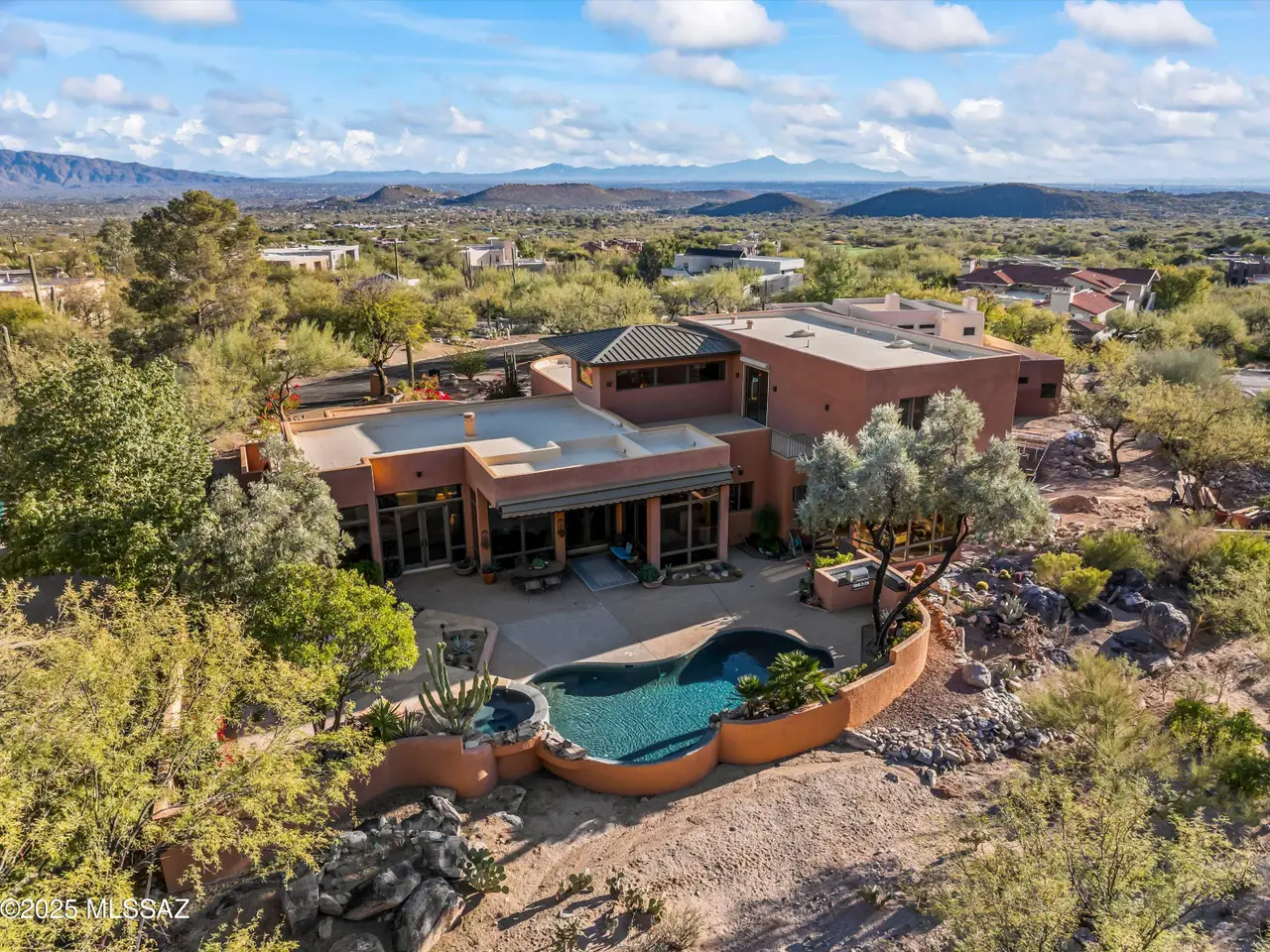 Ventana Canyon Desert Oasis in Esperero Canyon Estates! One of only 19 homes in this exclusive section of Ventana. Nestled within the gated Ventana Canyon community, this contemporary masterpiece designed and built by John Campisano offers a serene retreat. The property boasts saguaro-studded hillsides, lush natural desert and city lights providing a private mountain backdrop. Situated on a large lot in a quiet cul-de-sac, the home features a private pool and spa in a natural open backyard, complete with a built-in BBQ. The master bedroom is conveniently located on the main level, and the home includes an open kitchen and soaring ceilings. Upstairs has a large walkout View deck with a spiral staircase to the pool area. Enjoy the perfect blend of luxury and nature in this exquisite home.