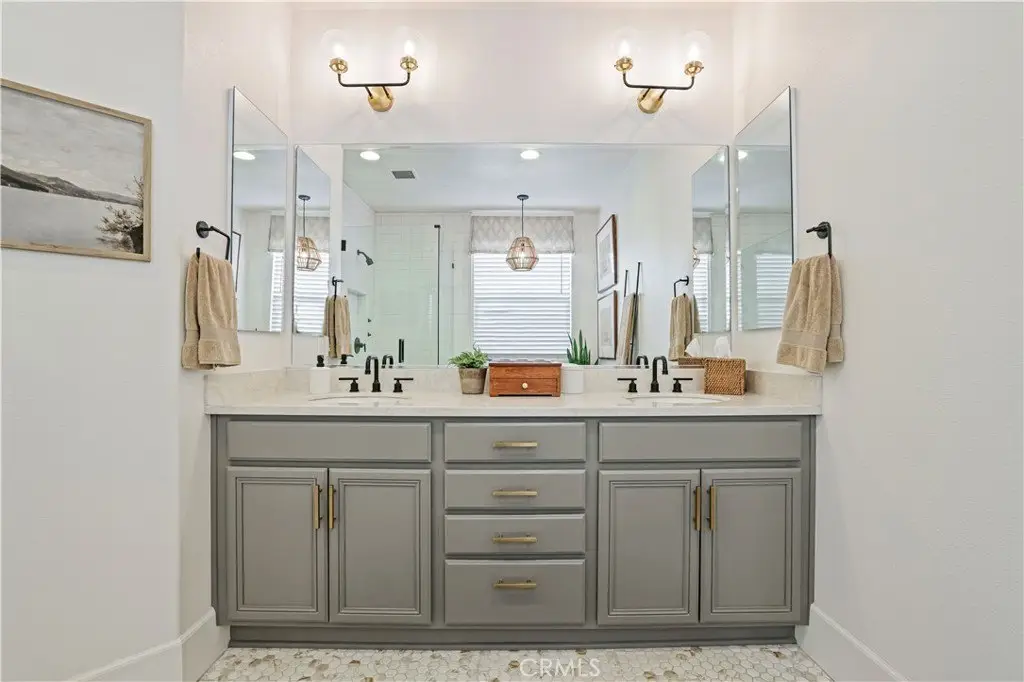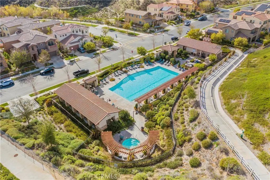 Welcome to one of Valencia's most prestigious gated communities! Enjoy luxury living behind the gates of West Hills! This home offers a wonderful balance of elegance and comfort, featuring A MAIN FLOOR PRIMARY SUITE. The recently updated primary bathroom features a free-standing soaker tub and separate walk-in shower with decorative hexagon porcelain floor tiles. In addition, there is a guest bedroom, bathroom, powder room and laundry room with sink, on the main level. The open concept floor plan creates a seamless flow between the kitchen, dining, and family room, perfect for gatherings. The stunning kitchen features a generous center island with seating, pendant lighting and gorgeous quartz countertops. Additional kitchen upgrades include stainless steel appliances and a stainless steel farmhouse sink with decorative faucet. On the second level, you'll find a spacious loft, 2 bedrooms with walk-in closets and a full bathroom. Relax in the recently upgraded backyard with lush greenery, various patio areas, seating walls, a fire pit, ambiance lighting , as well as a Smart Control irrigation system. This home features a solar power system to help reduce energy costs. Such an amazing location, close to all community amenities, schools, parks, shopping and many dining options!