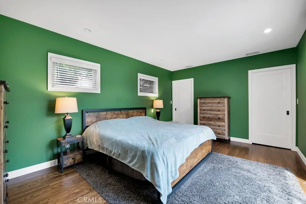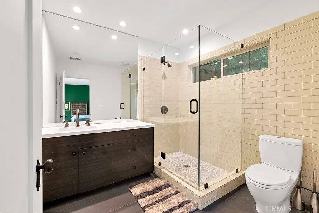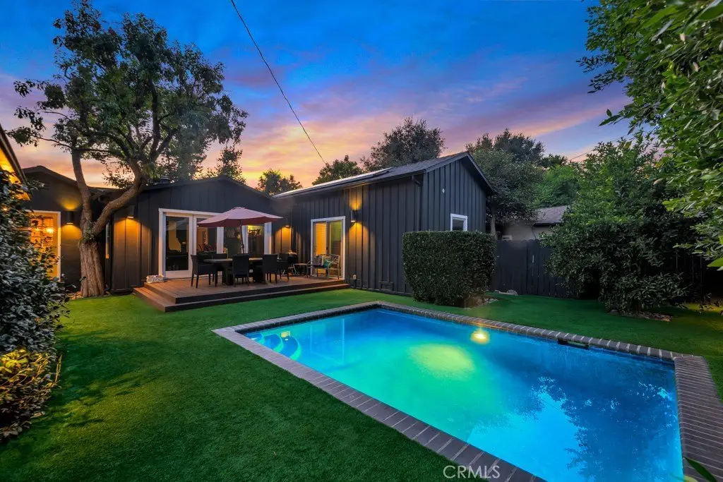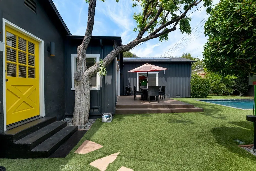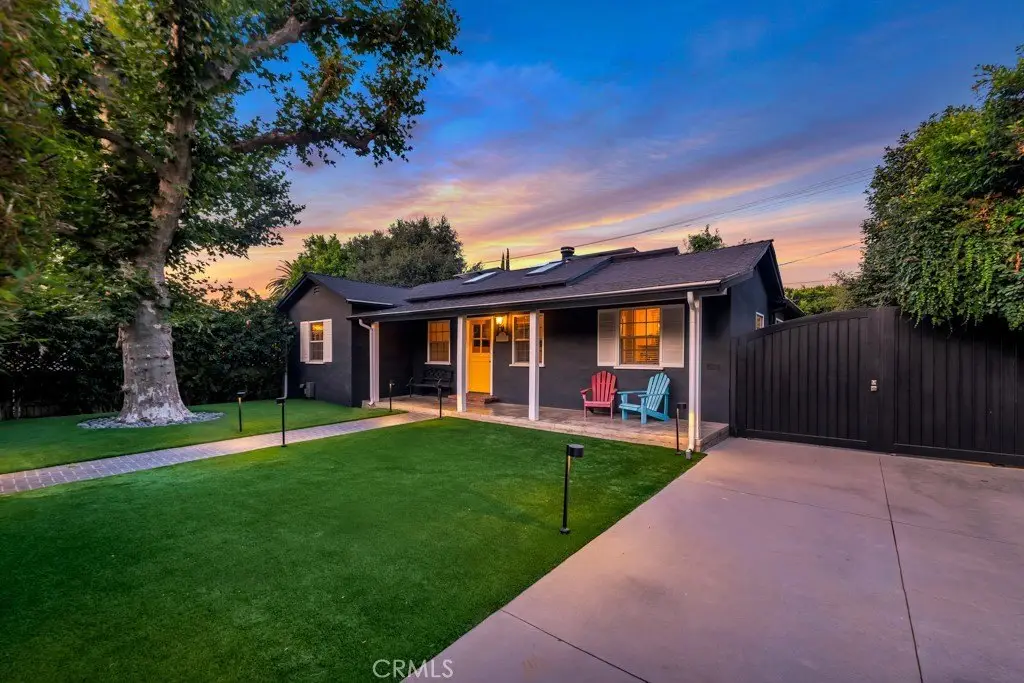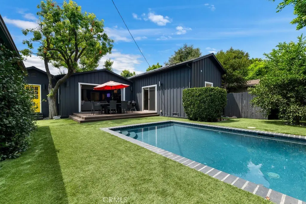 This stunningly renovated and expanded three bedroom, two bathroom home is a true masterpiece! With its soaring vaulted ceilings and open, airy layout, this residence showcases top-notch finishes and exceptional indoor/outdoor living. A charming Dutch door welcomes you into the cozy formal living room, featuring a sophisticated stone fireplace as its centerpiece. The seamless flow of the open-concept design leads you effortlessly into the dining area, which is beautifully highlighted by a striking architectural light fixture. The contemporary kitchen is a chef's dream, complete with custom cabinetry, quartz countertops, a Wolf range, and high-end stainless steel appliances. The newly designed master suite is a luxurious retreat, featuring a spacious walk-through closet and an ensuite bathroom adorned with premium finishes such as Waterworks tile, bespoke cabinetry, and elegant European fixtures. The airy great room is accentuated by large modern bi-fold doors that open up completely to reveal a brand-new deck and an exquisitely landscaped backyard. The outdoor space boasts a heated saltwater pool and a Studio ADU equipped with its own full kitchen. Additionally, the property is outfitted with fully paid-off Tesla solar panels and two Tesla batteries, enhancing its energy efficiency. This incredible opportunity is not to be missed!