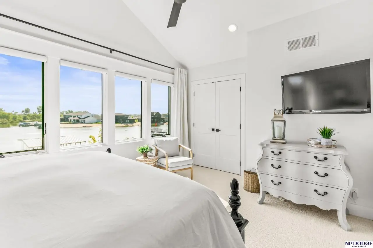 Experience the epitome of lakeside living in this former Street of Dreams custom home with sweeping views and timeless craftsmanship. A chef-inspired kitchen boasts an oversized island, hidden walk-in pantry with butcher block counter, custom hood, and coffee/wine bar with refrigerator. White oak floors, pine beams, vaulted ceilings, and a stone wall fireplace define the main living area, opening to a climate-controlled sunroom with fabulous views. The primary suite is a true retreat with lake access and a custom closet with laundry. A second main floor ensuite provides comfort and privacy for guests. Additional features include a second laundry, hidden storm shelter, outside lake bathroom, and heated garage. Outdoor living shines with a stamped patio, pergola with pull-down screens, stone fire pit landing, professional landscaping, and seawall. A Rhino Dock concrete deck and HydroHoist boat lift add seasonal enjoyment, while a gas generator provides peace of mind. AMA
