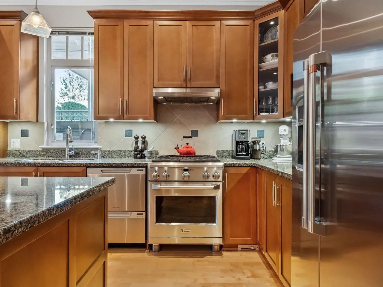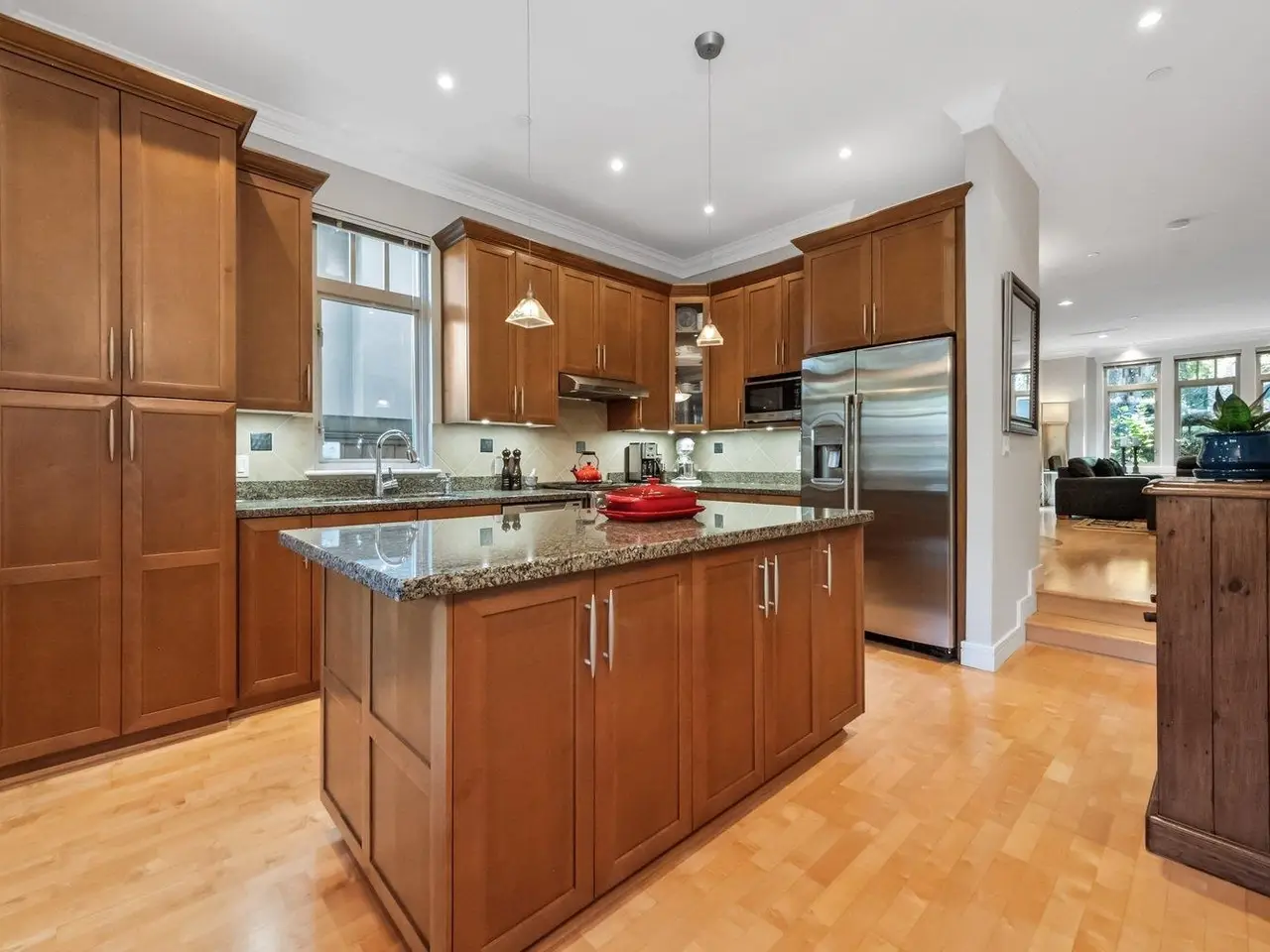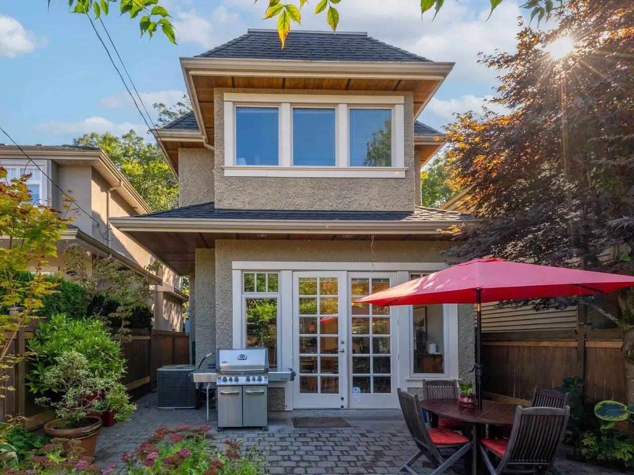 Perennial gardens lead to the front entry of this stately 4-bed, 4-bath, 3-storey Kerrisdale home. Open concept main w/ over-height ceilings, maple H/W floors, & architectural details throughout, including crown moulding, recessed bench seating in family rm, windows seat & gas F/P in living rm. Chef's kitchen w/ bespoke cabinets & island, granite counters, gas range, & S/S appliances. French doors lead to patio for seamless in/outdoor living. 2nd floor features: sprawling primary bed w/ ensuite, + 2 additional beds (one w/ vaulted ceiling), bath, & laundry. Potential 2nd primary suite on top floor w/ ensuite, W-I-C, skylight, & W-facing balcony. Serene backyard w/ professional hardscaping & custom pond. OPEN HOUSE: SATURDAY, NOVEMBER 1 @ 1-3pm