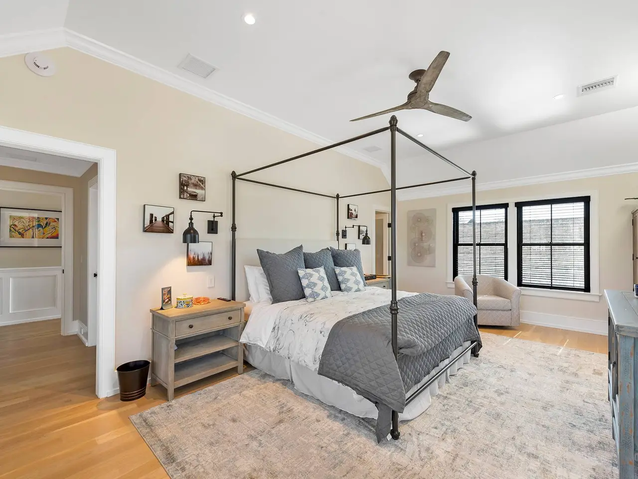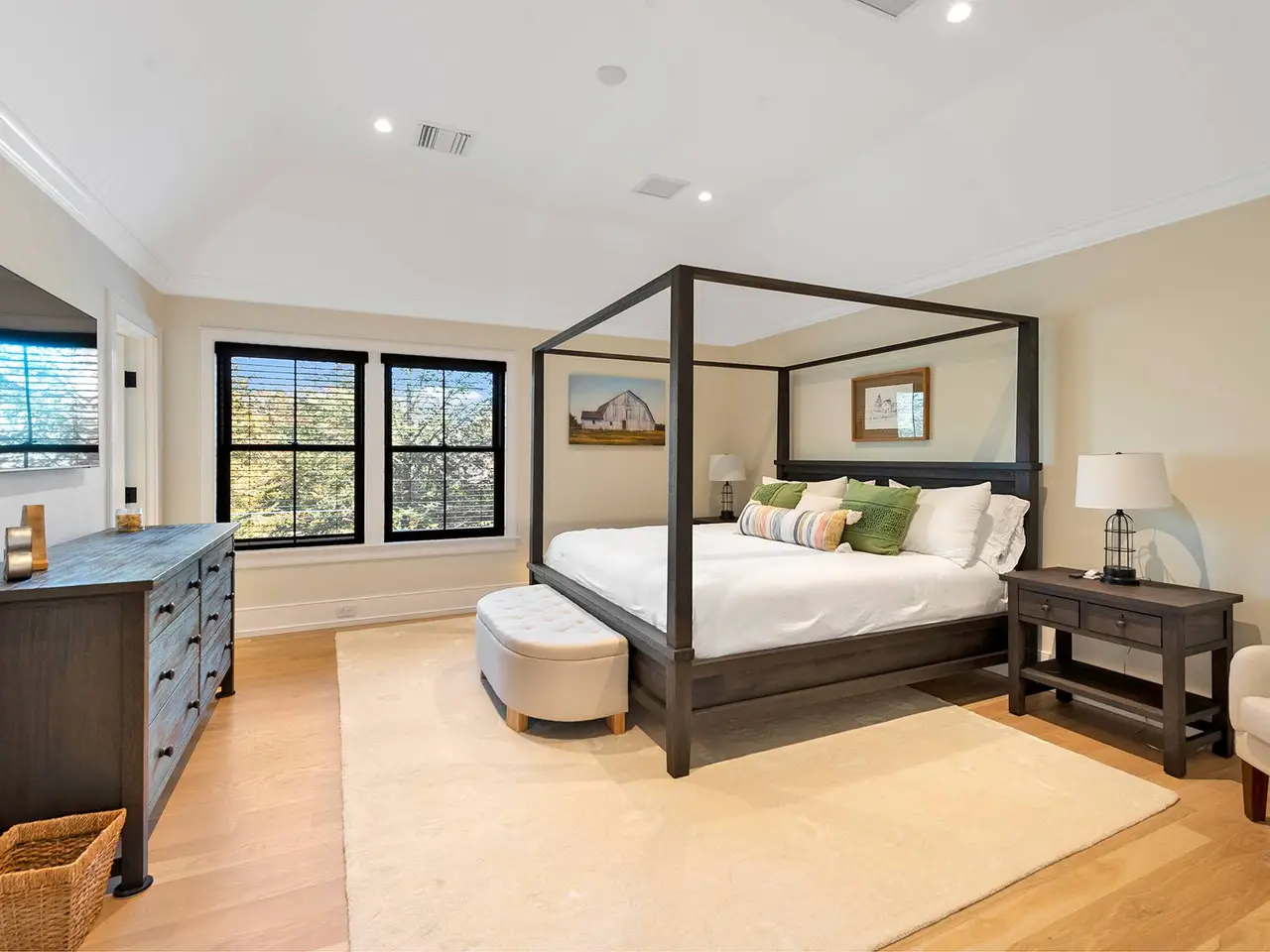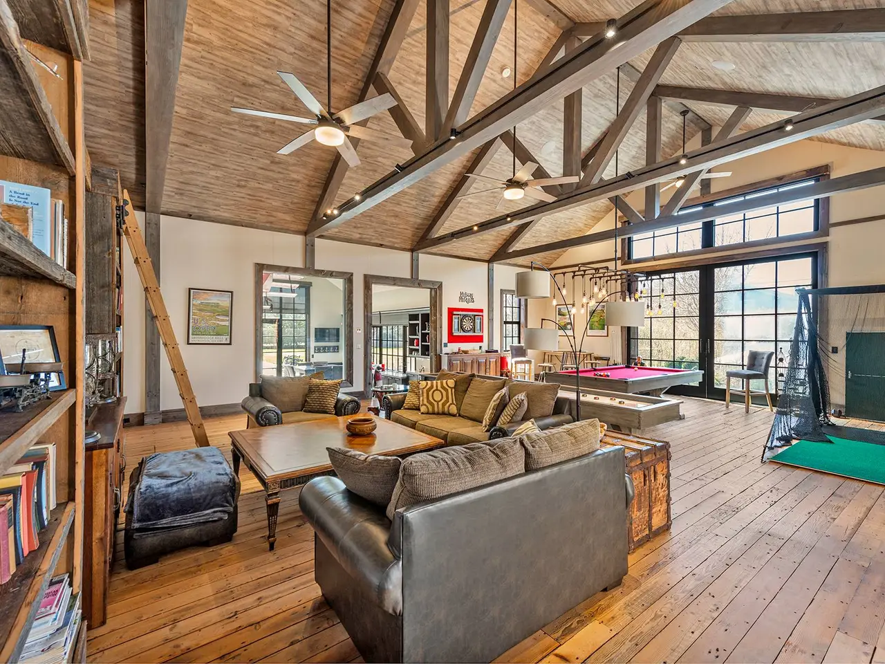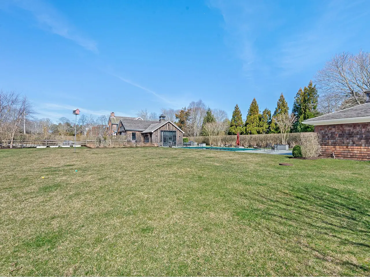 This exquisite Southampton Village rental, moments from Coopers and Halsey Neck Ocean beaches, seamlessly blends modern amenities with farmhouse charm, creating an inviting and luxurious living experience. Built in 2022, fully furnished (including a grand piano), and stunning. This modern farmhouse is sited on over an acre, features a pool, pool house, a fully equipped barn set up as an incredible entertainment area, and an intricately designed landscape creating a true oasis in the Village, near world-class Southampton Main Street amenities. The property offers 5 bedrooms and 6.5 baths in total, providing ample space for comfortable living, 7,500+/- square feet. Open interiors with rich hardwood flooring throughout, coffered ceilings, gorgeous wall paneling and simply faultless interior design. The great room includes a chef's kitchen, dining area, living room, and a charming breakfast nook with a wet bar. Smart home technology enhances convenience, with features like a Lutron lighting system, smart window blinds, Smart TVs, and an integrated sound system in nearly every room. Adjacent to the main living area is a separate entertainment complex. The space is stunning and cavernous, sliding barn doors open to reveal a media room, billiards, shuffleboard table, custom bar, gym, and kitchenette. Floor to ceiling sliding doors open out to both a private garden as well as the grounds that offer a heated gunite pool and pool house beyond. This Southampton Village rental is the epitome of a perfect Hamptons summer setting, combining luxury, comfort, and entertainment in one remarkable property.
