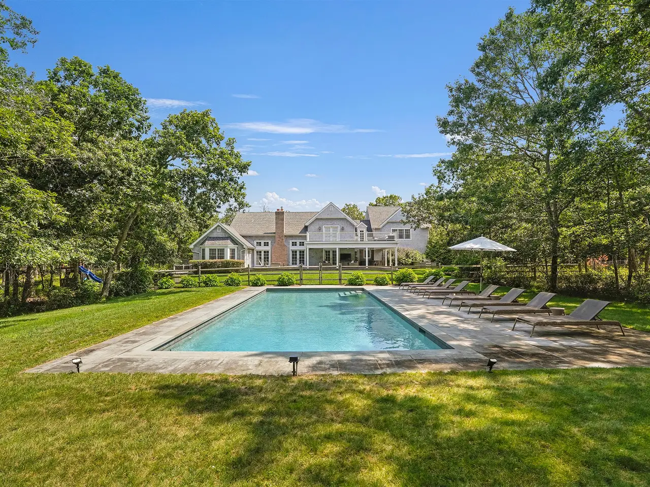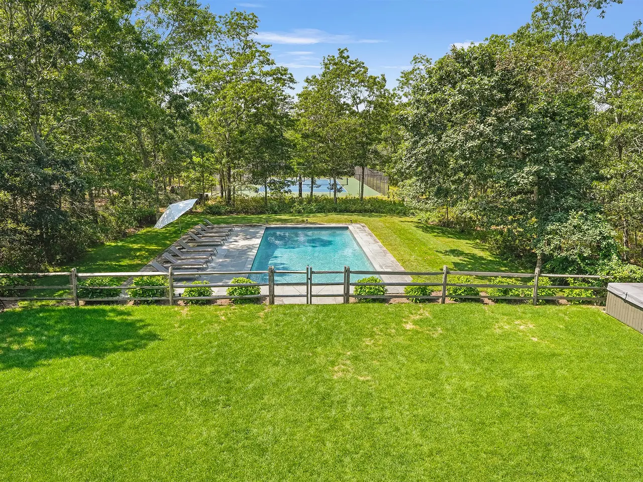 Privacy abounds in this beautifully renovated Wainscott traditional home. Sited on 5.5 acres with deco turf tennis/basketball this 4,500 square feet with 2,500 square foot lower level seven bed, 6.5 bath is the perfect summer rental. As you enter the grand open living areas, you are greeted with tons of natural light from a wall of French doors that open to expansive outdoor deck area. The living room flows into dining area and huge eat-in renovated chef's kitchen with island seating, marble counter tops, stainless steel appliances and breakfast area with window seating. Bedrooms and baths consist of a first floor primary suite with vaulted ceilings, access to the backyard and a renovated expansive en suite bathroom. There is another main floor bedroom as well. The second floor boast an additional primary bedroom with double granite vanity and soaking tub and access to a 2nd floor decked balcony. There are 3 other oversized en-suite guest bedrooms. The newly finished lower level consists of two more bedrooms, movie/media room and gym. The back deck has expansive covered seating and dining areas with outdoor kitchen with DCS grill that looks onto a beautifully landscaped yard and 20x40 heated gunite swimming pool. Beyond the pool lies the tennis court with basketball net that is perfect for all sports lovers. Other features include a new Jacuzzi, a two-car garage, and an outdoor shower. There's easy access to East Hampton and Sag Harbor villages! Prime location and close proximity to both bay and the ocean beaches.