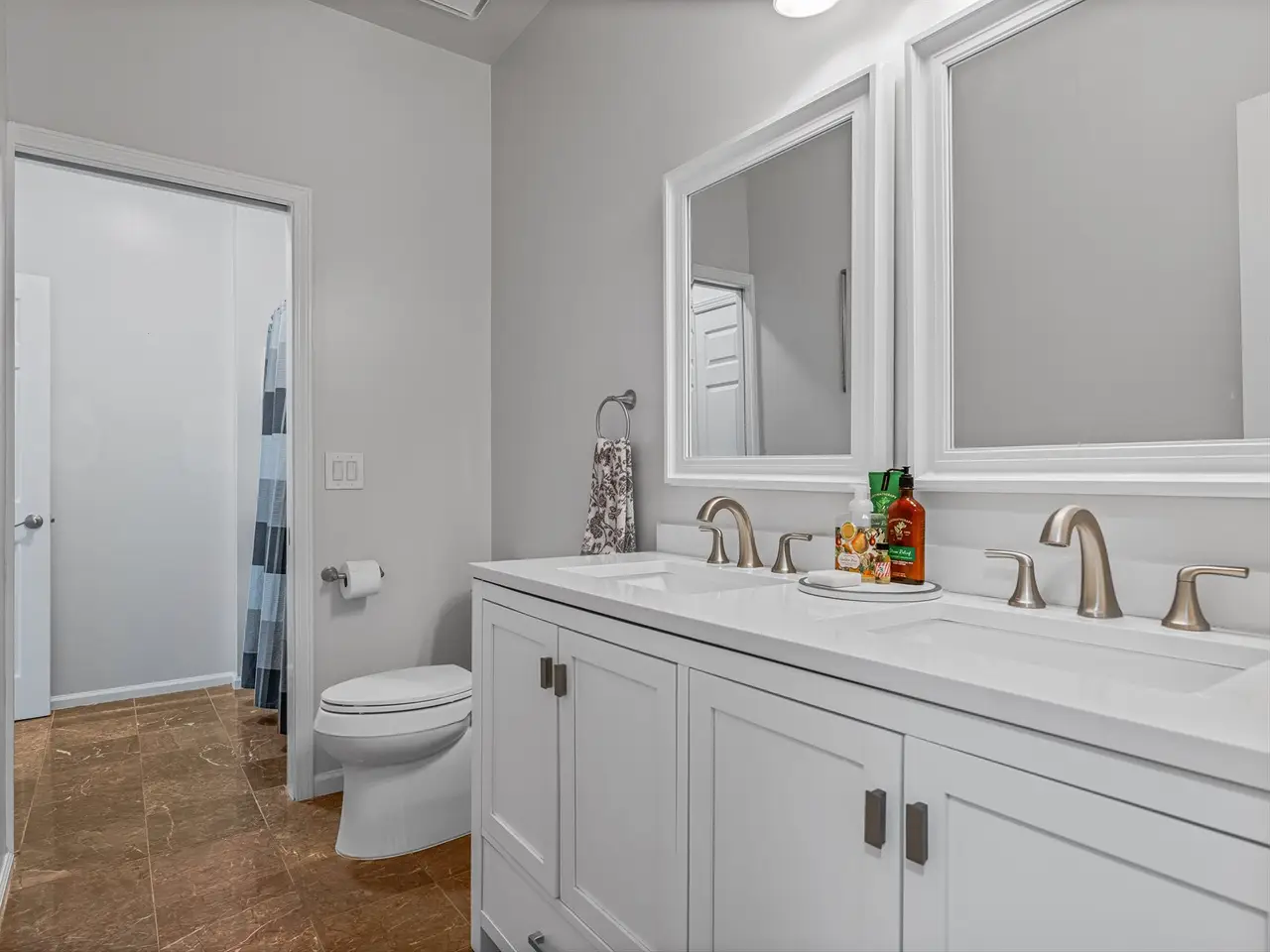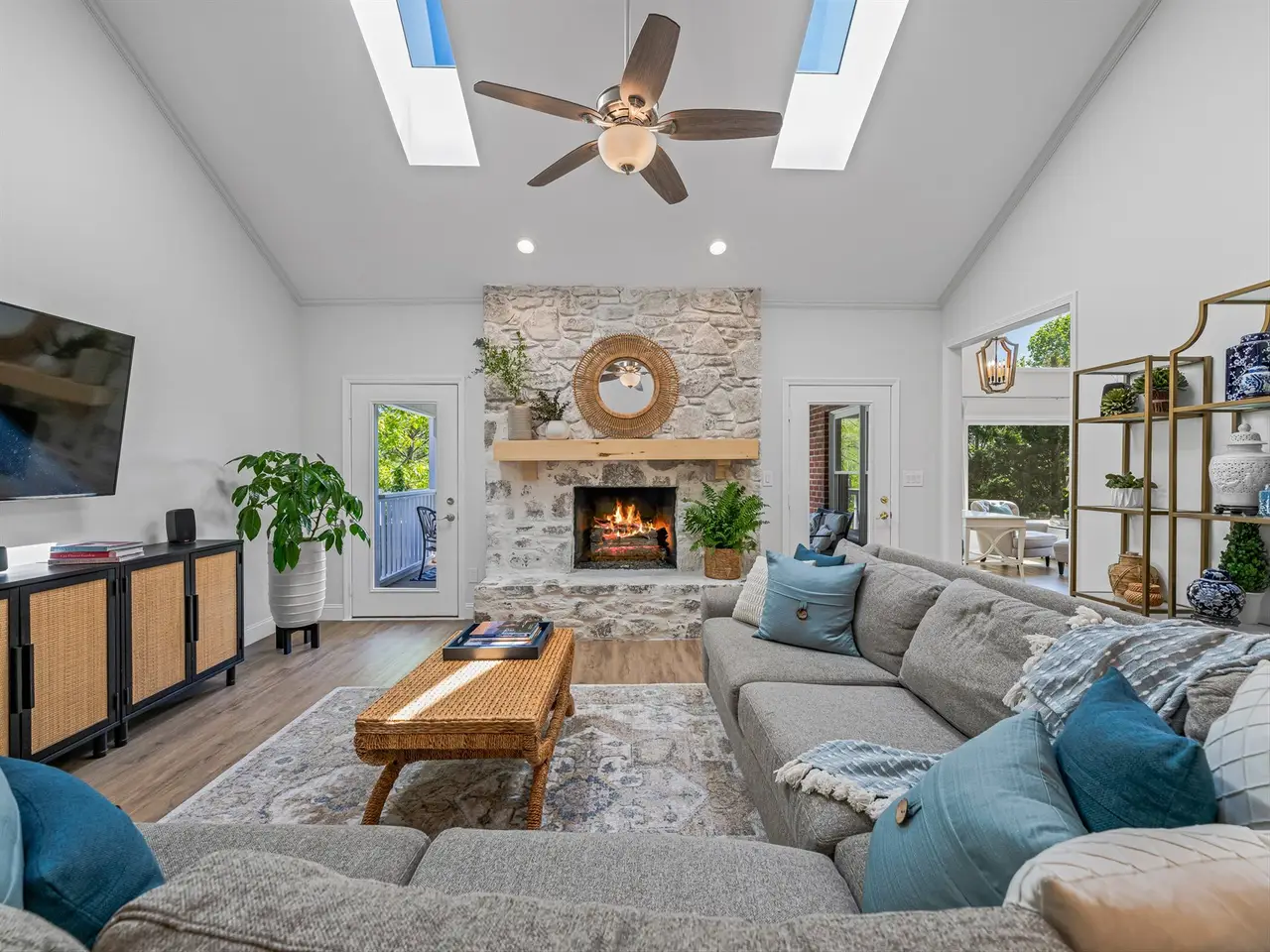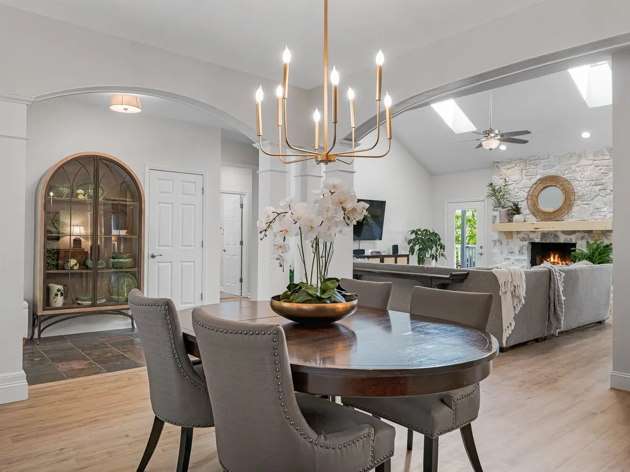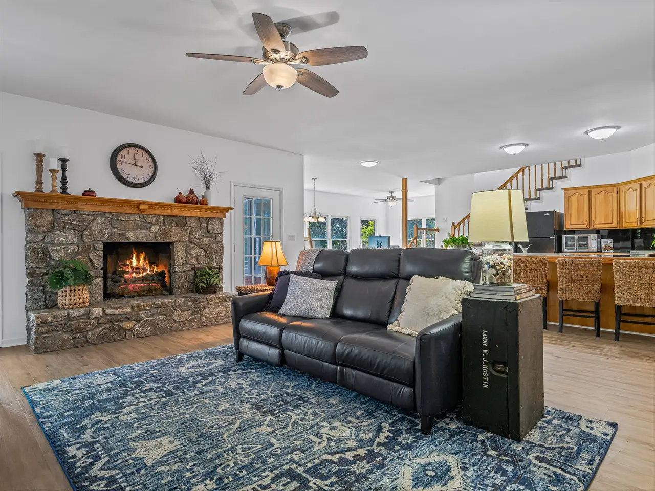 Elegant brick home in the coveted Reems Creek Golf Community, offering wonderful mountain views and showcasing an open, updated floor plan across two beautifully finished levels. Freshly painted and impeccably maintained, the main level features a vaulted great room with stone fireplace and German schmear finish, chef's kitchen with granite counters, black stainless appliances, and breakfast nook. The luxurious primary suite includes vaulted ceilings, spa bath with walk-in tiled shower, soaking tub, and custom closet. Two additional bedrooms, 1.5 baths, laundry, and oversized garage with workshop complete the main level, along with a covered porch and open deck. The lower level boasts a spacious second living quarters with great room, fireplace, second kitchen, second primary suite with ensuite bath and custom closet, fitness/game room, two storage rooms, and covered patio. Minutes to downtown Weaverville and Asheville. Optional golf and social memberships available at the clubhouse.