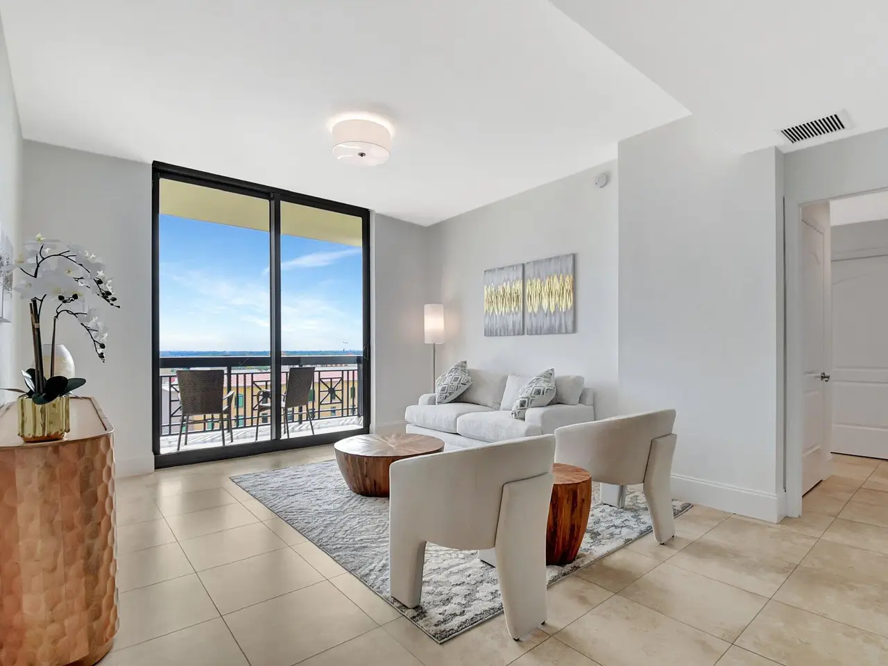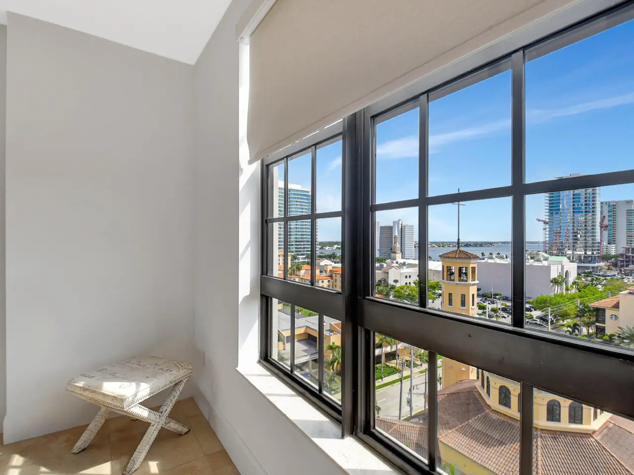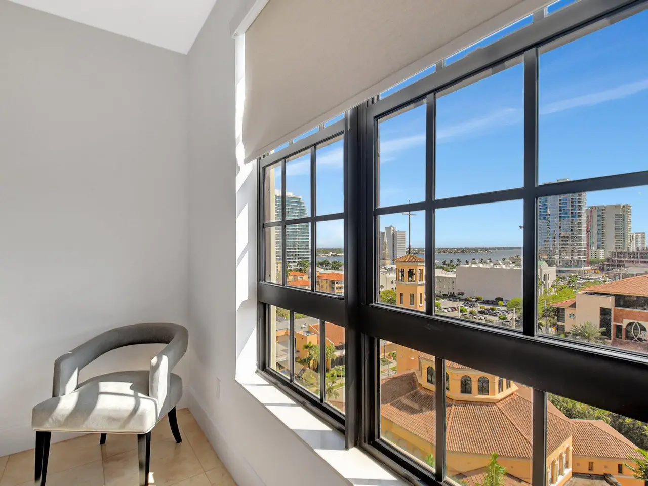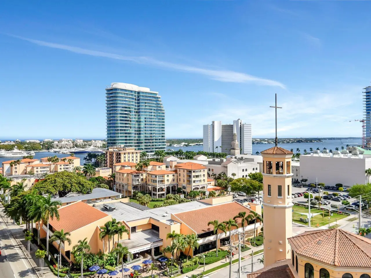 A must see! Recently staged with beautiful brand new furniture. Amazing SE water views from all windows. Stunning kitchen with dining island, stainless steel appliances. Primary bedroom has 3 California closets. Polished marble primary bath with 2 vanities separate shower and Roman soaking tub. Renovated 2nd bathroom. Upgrades throughout include all new electrical, high hats and lighting fixtures, bathroom mirrors, faucet and fixtures. 24/7 manned lobby, guest and valet parking, state-of-the-art fitness center, club room. Amazing Roof Top views of Palm Beach, ocean and the intracoastal where you can relax in the heated pool, steam room, sauna or BBQ and outdoor dine. Dog friendly building! 10 minutes to PBI airport. Walk to Clematis.