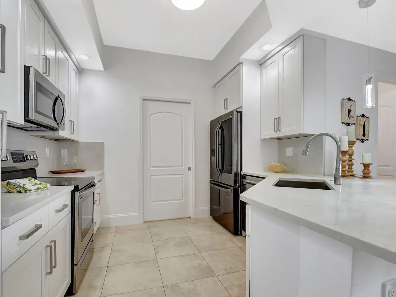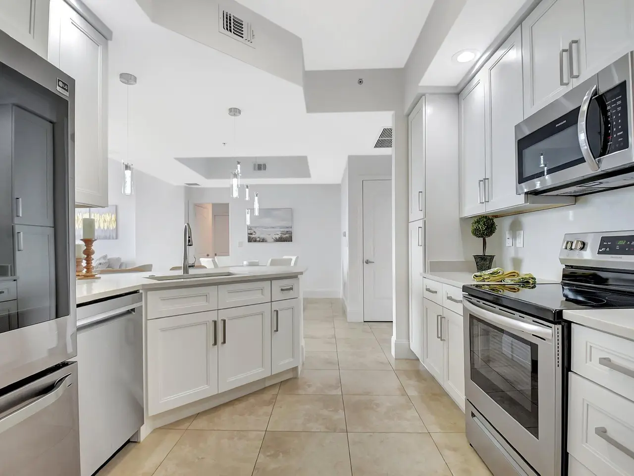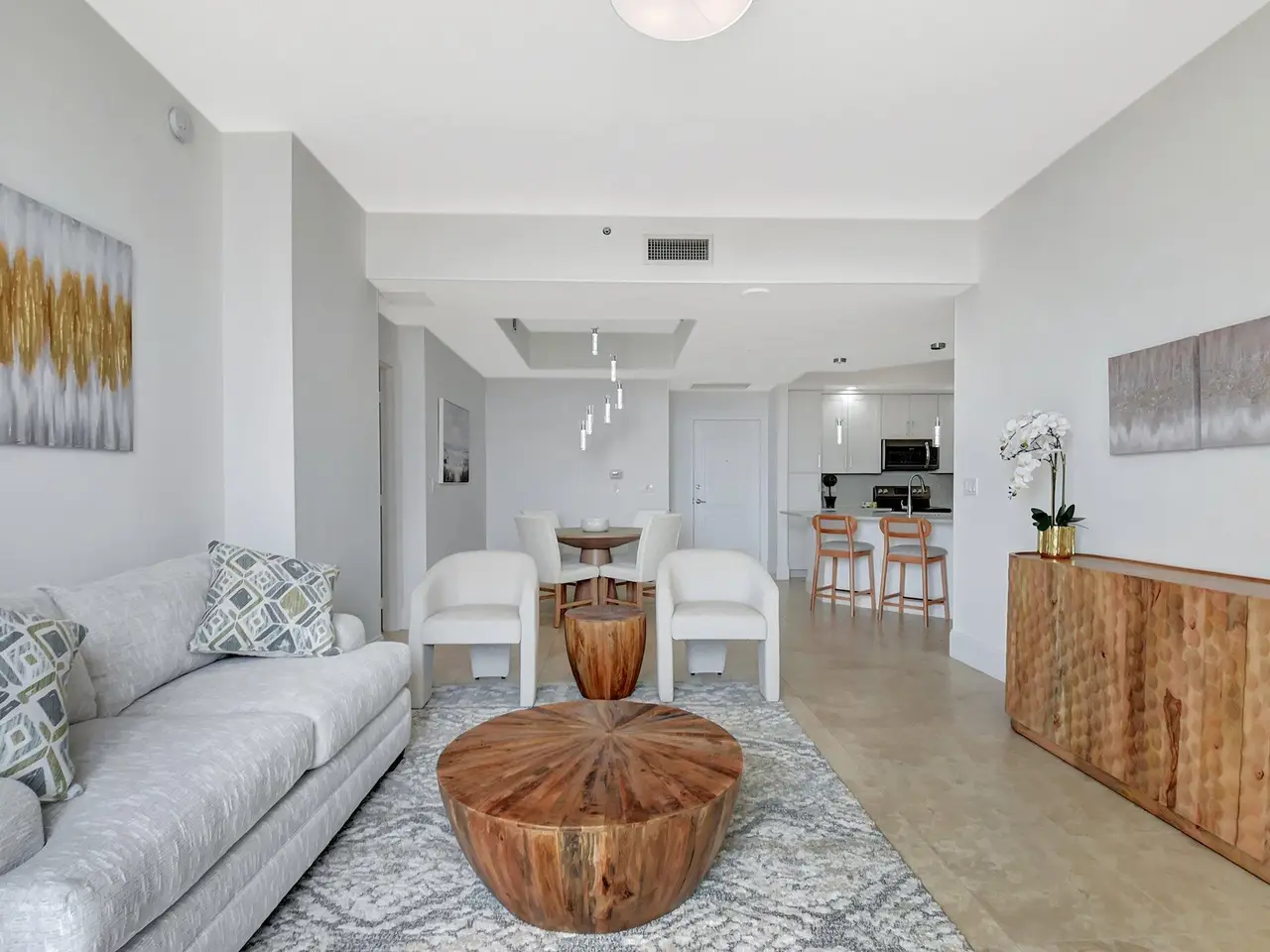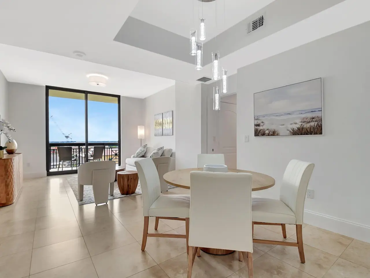 A must see! Recently staged with beautiful brand new furniture. Amazing SE water views from all windows. Stunning kitchen with dining island, stainless steel appliances. Primary bedroom has 3 California closets. Polished marble primary bath with 2 vanities separate shower and Roman soaking tub. Renovated 2nd bathroom. Upgrades throughout include all new electrical, high hats and lighting fixtures, bathroom mirrors, faucet and fixtures. 24/7 manned lobby, guest and valet parking, state-of-the-art fitness center, club room. Amazing Roof Top views of Palm Beach, ocean and the intracoastal where you can relax in the heated pool, steam room, sauna or BBQ and outdoor dine. Dog friendly building! 10 minutes to PBI airport. Walk to Clematis.