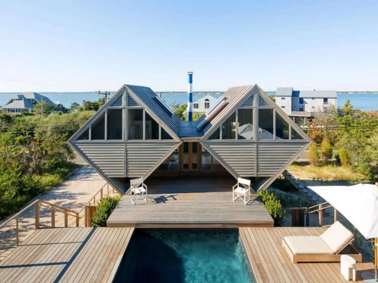 Rental Reg.#: RP200464 One of the premier builders in the Hamptons recently completed this magnificent modern home. Designed by the environmentally responsive firm, CookFox, with glass and wood details that provide open living space, ocean breezes and water views from every room. Amazing sunrise and sunsets can be yours. The home hosts an open living room with fireplace, custom designer kitchen from Henrybuilt of Soho, great room with dining and living area, separate media room, five bedrooms, four and one-half bathrooms and both a dry and a steam sauna. Expansive mahogany decking facing the ocean allows for entertaining and relaxing in the outdoor hot tub. There is also an outdoor dining area with spectacular ocean views. The state-of-the-art four zone heat and central air, and seven-zone sound system can be controlled by your phone or iPad. In addition to summering in the ultimate oceanfront home, experience a bit of history in the second structure on the property. The Double Diamond house, built in 1958 and designed by modernist architect, Andrew Geller, is considered one of the most iconic beach houses in the Hamptons. The house has been meticulously restored to the original beauty that landed it in dozens of newspapers and magazines. The Diamonds offer an additional 600 sq ft of entertaining space including a kitchen, bath, living room and several lounging spaces. A private walkway leads to the pristine ocean beach. A heated, gunite saltwater pool completes the retreat. Listing ID #737134