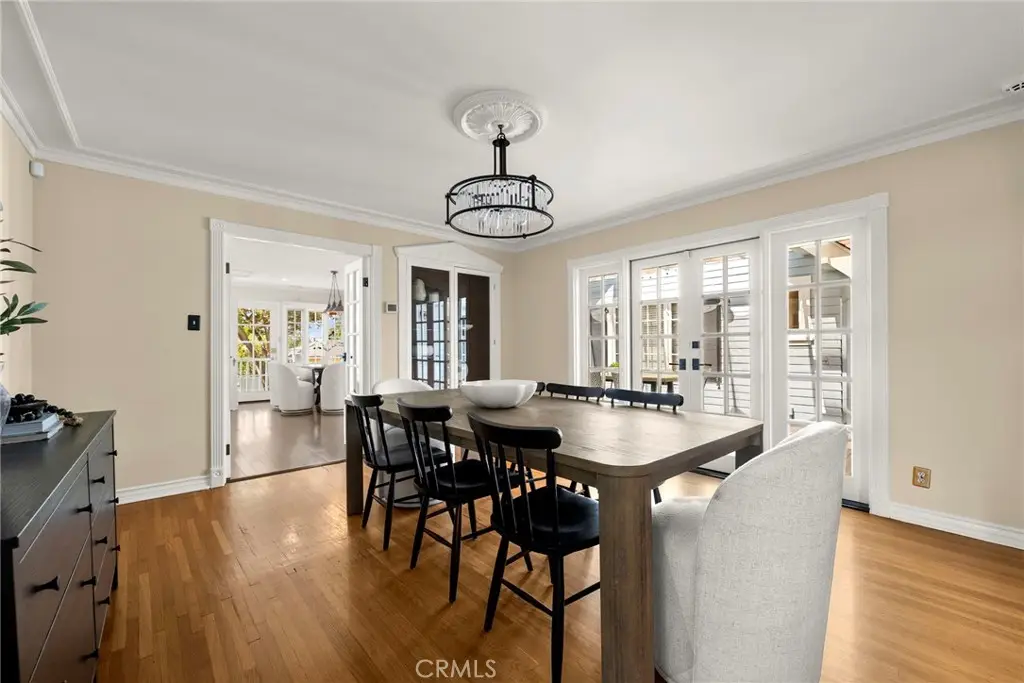 The unique U-shaped design allows nearly every room to open through French doors to a tranquil courtyard, perfect for indoor-outdoor living. The resort-style backyard features low-maintenance turf, a sparkling pool, and multiple entertaining spaces, while the deck offers breathtaking sunset views over the Whittier Hills. The front yard provides a generous grassy area, ideal for play, gardening, or simply enjoying the outdoors.