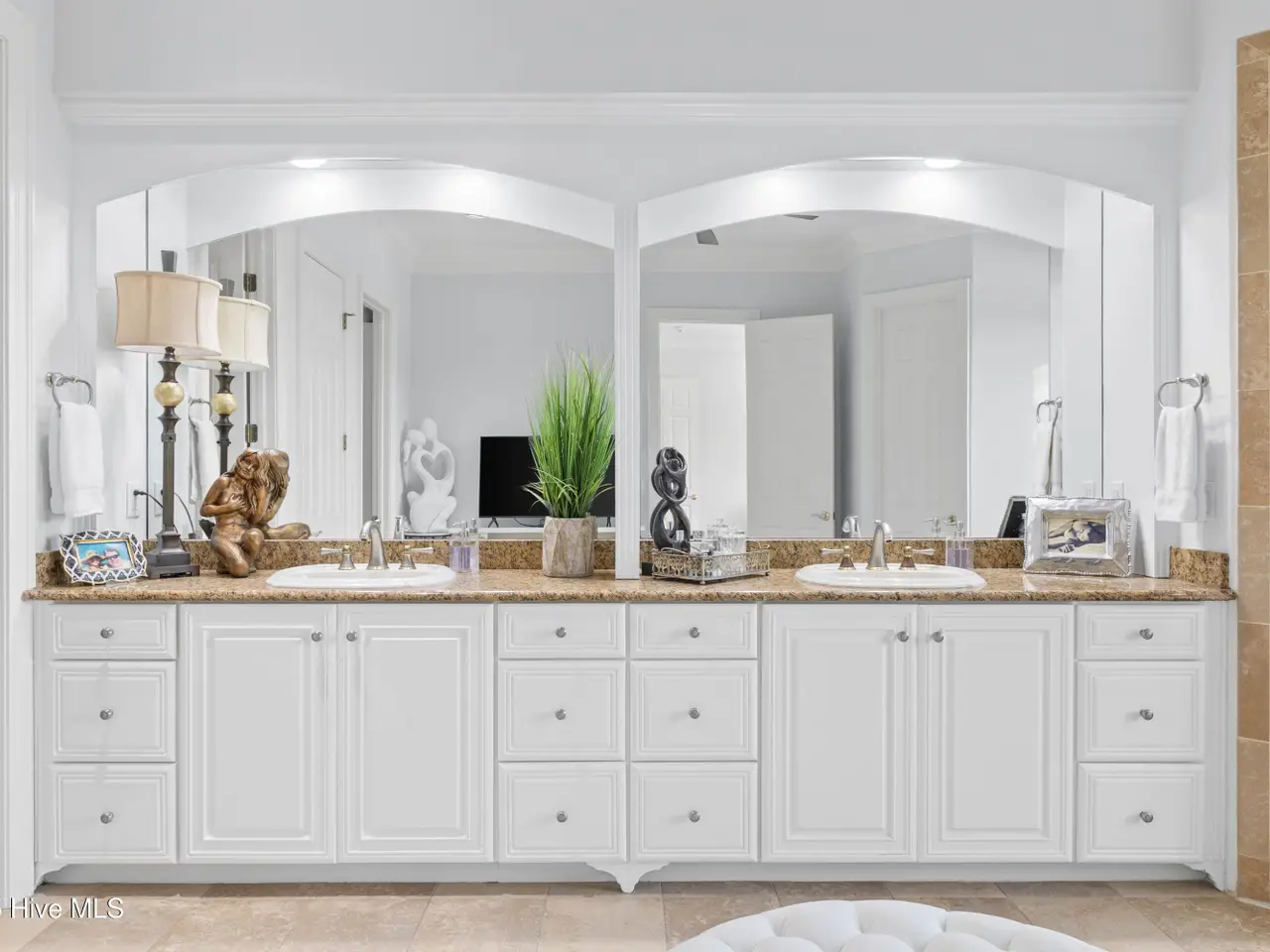 Welcome to 2220 Moreland Drive on the stunning Landfall Lake with breathtaking views. As you pull up to this stately home you will notice the great curb appeal, large driveway, and 3 car garage. As you step inside, your eyes will be drawn straight to the gorgeous view of the lake and even views of the Intracoastal waterway. The open foyer has a formal dining room to the right and a living room to the left complete with a gas fireplace. The family room is center in the house with a wet bar, gas fireplace, and leads to a lovely screened-in porch. The updated kitchen is light and bright with quartz countertops, ceiling-height cabinets, and a Wolfe range. There are two powder rooms downstairs plus a spacious laundry room. The master bedroom is also on the first floor positioned perfectly to wake up to heavenly views. Over the garage is a large bonus room that would be make a great fifth bedroom as it has a huge ensuite bathroom, the bonus room is currently being used as a home gym. There are 3 additional bedrooms upstairs plus a loft/flex space which would make a great playroom, media room, or office. One of the best features of this property is the high elevation of this almost one acre lot complete with a pool, spa, patio, and built-in grilling area just off the kitchen. You can start or end your day with a walk around the idyllic Landfall Lake which is right in your backyard. Whether you want to relax or entertain, this house checks all the boxes.
