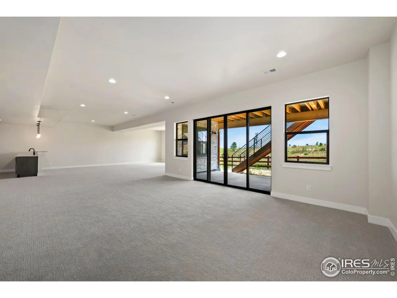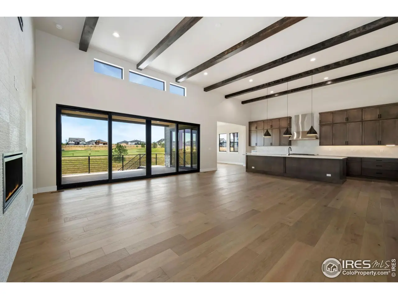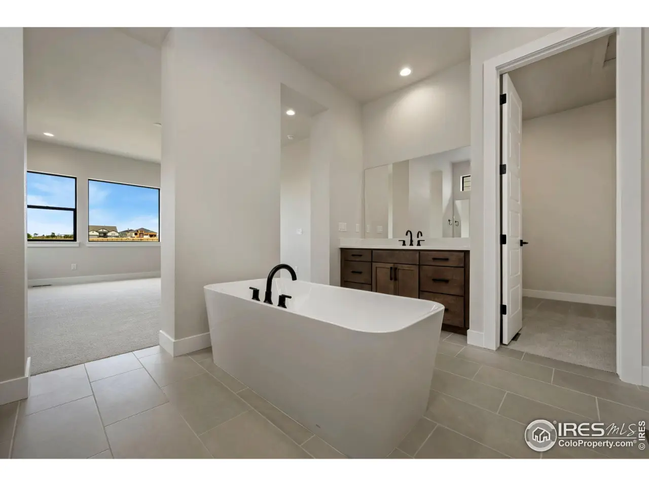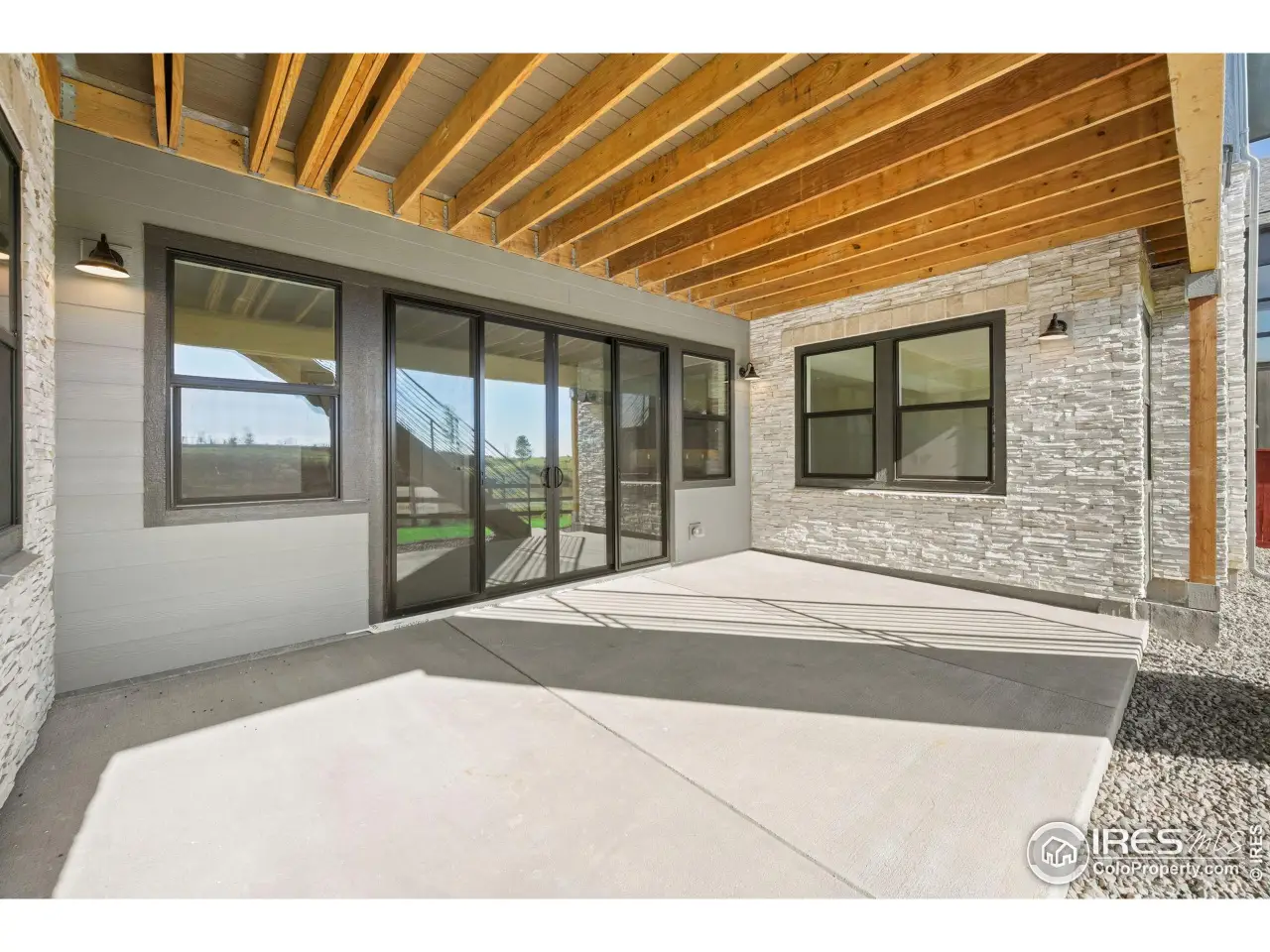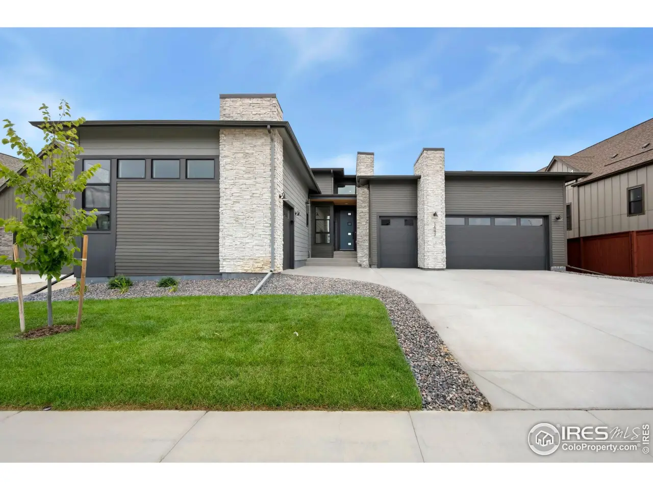 The stunning Modern Prairie Broadmoor at The Fairways in RainDance by Trumark Homes features an inviting porch. Beautiful single-story home offers 4,871 sq. ft. of finished space with 4 bedrooms and 4.5 baths. Past the entryway is a large great room and gourmet kitchen with a walk-in pantry and a prep island. Enjoy dusk-stained shaker-style cabinetry, Calacatta Laza countertops with tile backsplash, chef grade stainless steel appliance package, and decorative matte black fixtures. The great room, complete with stained ceiling beams and a modern linear gas fireplace, is filled with natural light and overlooks the covered outdoor deck to take in the stunning views of the high-plains links-style golf course at RainDance National. Down the hall you'll find a second sitting room, spacious laundry with sink, and two bedrooms both with ensuite baths. Off the great room is the office with glass wall and door and contemporary grand suite, including a luxurious bathroom with two sinks, walk-in shower, and an elegant freestanding tub. An expansive walk-in closet completes the primary suite. The home also comes with natural stained engineered hardwood flooring throughout the main floor with luxurious carpet in bedrooms, spacious 10-foot ceilings on the main floor and the partially finished walkout basement is complete with wet bar, bedroom, bath and large rec room for entertaining with a sliding glass door and oversized private concrete patio. Eight- foot interior doors, insulated steel garage doors, tankless water heater, AC, front yard landscaping, golf cart garage, and more! Neighborhood amenities; trails, orchards, non-potable water, trash, included in your metro district fees. Membership to the Raindance pool is optional/currently $510/year; other options combining amenities in Raindance and Water Valley - "WaterDance"!