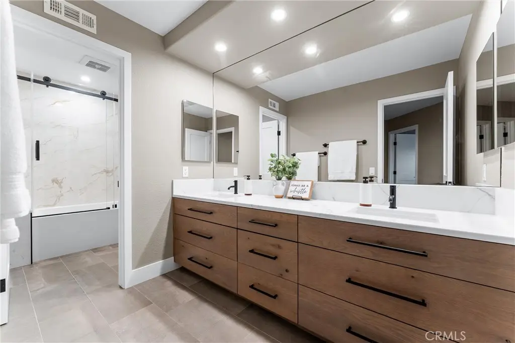 Welcome to Fairmont Terrace, a highly sought-after gated community in Yorba Linda. This beautifully remodeled two-story home blends modern design, smart upgrades, and comfortable living in one seamless package. Step inside and you'll be greeted by high ceilings, a brand-new custom staircase, and a fireplace featuring a statement marble mosaic design. Every detail in this home has been upgraded, including solid wood doors, elegant casings, recessed lighting throughout, and custom closet organizers in all bedrooms. The heart of the home is the chef's kitchen, redesigned for both entertaining and everyday living. Quartzite countertops and a marble backsplash pair beautifully with high-end appliances, including a Wolf range and hood, Wolf M Series double ovens, and a Bosch dishwasher. The kitchen features a spacious island and cabinetry with endless storage, as well as custom solid oak shelving in the generous pantry. Retreat upstairs to a primary suite designed to feel like a luxury spa. High ceilings and a stunning bath create a true escape, with custom cabinetry and quartz countertops, a high-end Japanese soaking tub, pebble-stone shower floor, marble mosaic flooring throughout, and a separate space with a remote-controlled Toto toilet. Two additional upstairs bedrooms share a hall bath that has also been fully redesigned, with quartz counters, a custom tub and shower, and a Toto toilet. The downstairs bedroom and full bath have likewise been fully remodeled, providing comfort and flexibility for guests or multi-generational living. Efficiency and convenience are built in with paid-off solar panels, a Tesla Powerwall, whole-home water filtration, reverse osmosis in the kitchen, dual-zoned HVAC with new ducting, and a whole-house fan. The exterior is also newly painted. Step outside to a spacious backyard with a patio and fruit trees, perfect for gatherings or quiet evenings at home. The back slider also features a convenient remote-controlled shade. This home is more than move-in ready -- it's a rare opportunity to own a highly upgraded, energy-smart property in one of Yorba Linda's most desirable communities, close to top-rated schools, shopping, and dining. Don't miss this incredible opportunity!