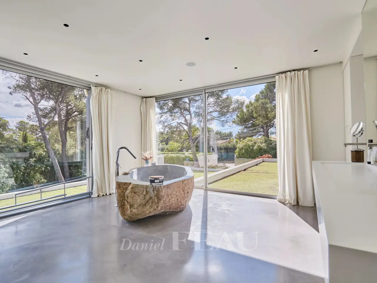 This resolutely contemporary 400 sqm property dating from 2011 is in a peaceful location 10 minutes from Cours Mirabeau and the centre of Aix, 15 minutes from the TGV station, 25 minutes from the airport and near the autoroutes. Set in 4000 sqm of grounds and commanding an exceptional view of the iconic Sainte Victoire Mountain, it includes a 180 sqm reception area, a 70 sqm home cinema, five bedrooms and a study. With a heated 15 x 5 metre mirror swimming pool, a jacuzzi and a carport.
