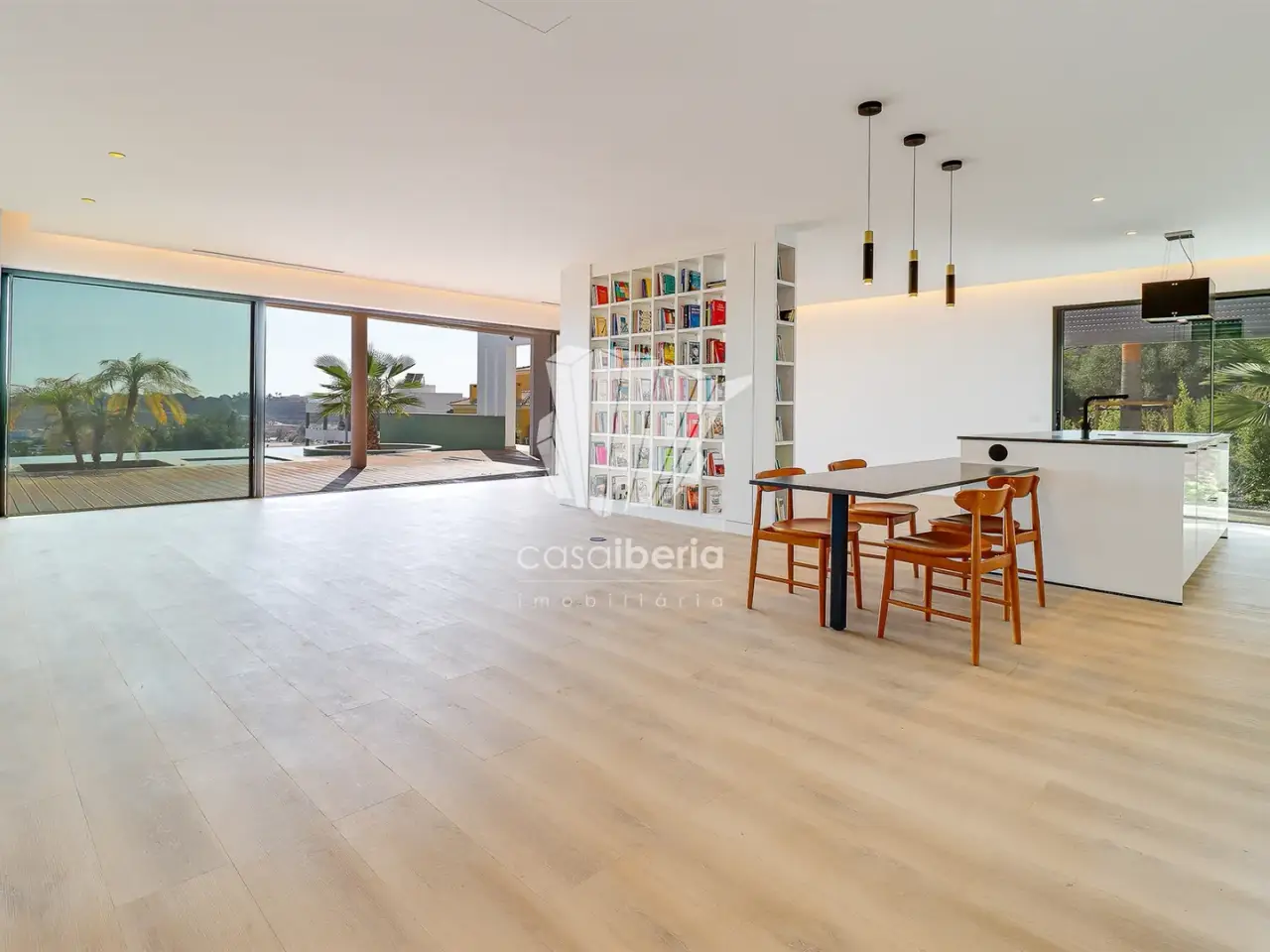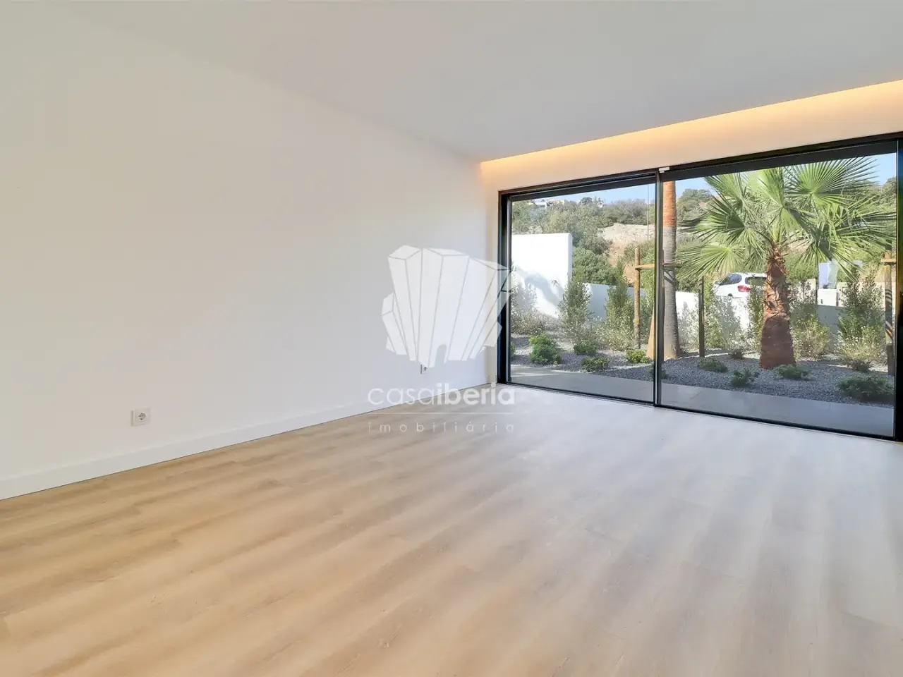 It has an imposing entrance to the social area, with a living and dining room and kitchen equipped with an open-plan island, very spacious, with natural light thanks to the glass windows that extend from floor to ceiling, thus offering a panoramic view over the sea and the tropical garden, eliminating any barrier between the interior and the exterior. This perfect fusion between the spaces allows for a continuous experience, where the huge terrace, the pool and the jacuzzi become a natural extension of the interior area of the house.