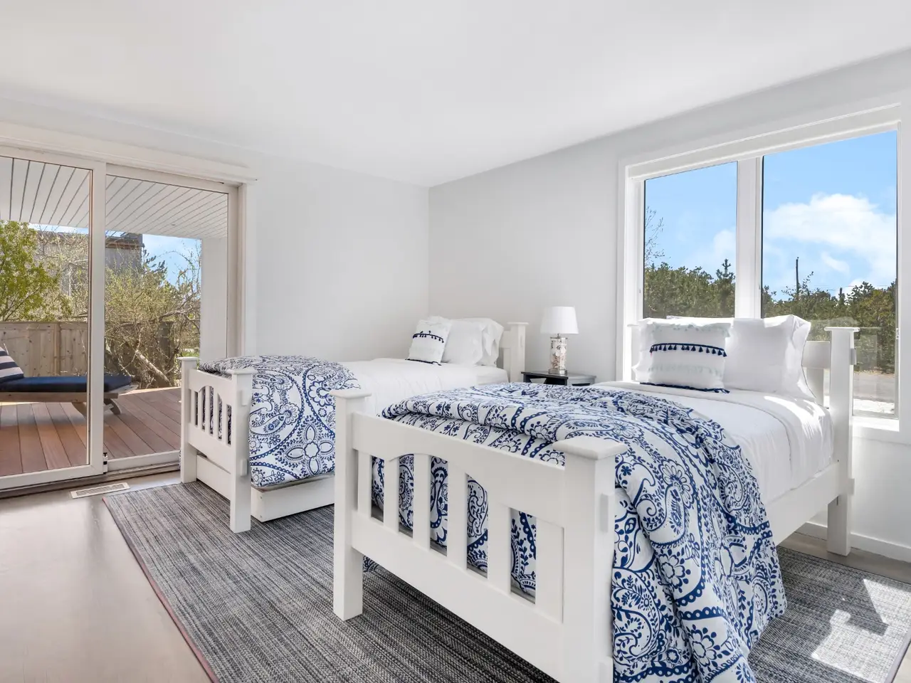 This wonderfully decorated contemporary home, located just two blocks from the prime Atlantic Ocean beaches in the Amagansett Dunes, is a super chic four-bedroom, two-and-a-half bathroom home. The two-story home has an upside-down configuration affording wonderful views of the unobstructed natural dunes from the main entertaining areas. The upper level open-style great room is complimented with stylish cathedral beamed ceilings and features a brand-new kitchen, large island, separate dining area, comfortable living room with fireplace and a half bath. An expansive outdoor deck extends the living space beautifully with a large sectional sofa, sunken hot tub, built-in grilling station and outdoor dining table. The upper floor primary bedroom suite, also with high ceilings, contains a large marble bathroom, walk-in closet, gas fireplace and private balcony. The main floor opens with a welcoming entry foyer, three spacious bedrooms each with sliding doors allowing direct access to the outdoor gardens, lounging areas and convenient outdoor showers. Completing the main floor is a great bonus room featuring a well-equipped butler's pantry with storage, a wine refrigerator and laundry facilities as well as a separate full bath. Extensive landscaping with mature natural specimen trees wraps you up in this private summer oasis. Exclusive rental.