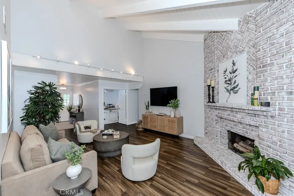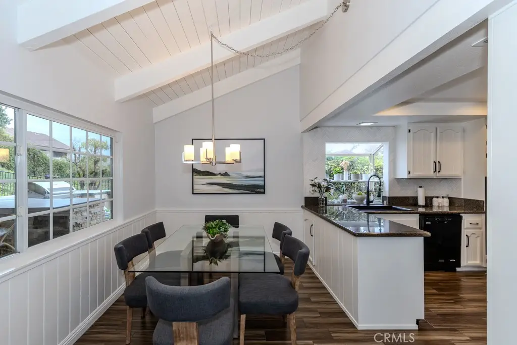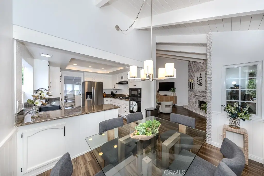 Single-story 3-bedroom 2-bath view home at 581 S Paseo Carmel in Anaheim Hills offers city lights and mountain vistas along with a spacious primary suite and a backyard retreat built for entertaining. The property begins with great curb appeal, wood siding with brick accents, and a landscaped approach. A covered entry functions as a front patio seating area and sets a welcoming tone. Inside, wood-look tile flooring runs throughout with no interior steps. The main living area opens under vaulted wood beam ceilings with abundant natural light, creating a bright and open feel that blends into the dining area. A hallway with a double-door storage closet leads toward the family room, where vaulted ceilings continue above a tall whitewashed brick fireplace wall. The family room flows into a kitchen nook finished with wainscoting and wood accents, positioned beside large windows for natural light. The kitchen is anchored by a peninsula counter and finished with granite countertops, a herringbone marble mosaic backsplash, recessed lighting, and a deep sink. A garden bay window offers extra display space. Appliances include a gas cooktop, oven, dishwasher, and trash compactor. Pull-out drawers add convenience, and the adjacent dining space accommodates a full table. The primary suite features double door entry, vaulted ceilings with a ceiling fan, dual mirrored wardrobes, and French doors with operable side windows. Its en suite bath offers dual granite vanities, a walk-in shower with seating bench, a private water closet, and large travertine tile finishes. The second bedroom, also with double-door entry, is used as an office with ceiling fan and mirrored closet, while the third bedroom includes the same. The guest bath is a full bath with granite vanity and large travertine tile shower surround. The laundry room is inside with overhead cabinetry. The attached two-car garage provides direct access, storage cabinets, and overhead racks. The backyard is designed as an entertainer's retreat, featuring a large Luminwood patio cover with recessed lighting and dual ceiling fans, paver hardscape, built-in barbecue with bar seating, a decorative glass gas fireplace, turf, and a putting green. Mature trees along the rear add privacy while framing the city lights and mountain views. Located minutes from shopping, dining, and parks with nearby access to freeways and award-winning schools, this property offers a single-level lifestyle with outdoor amenities and relaxing views