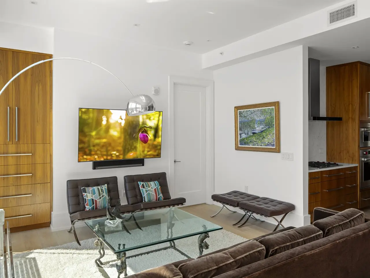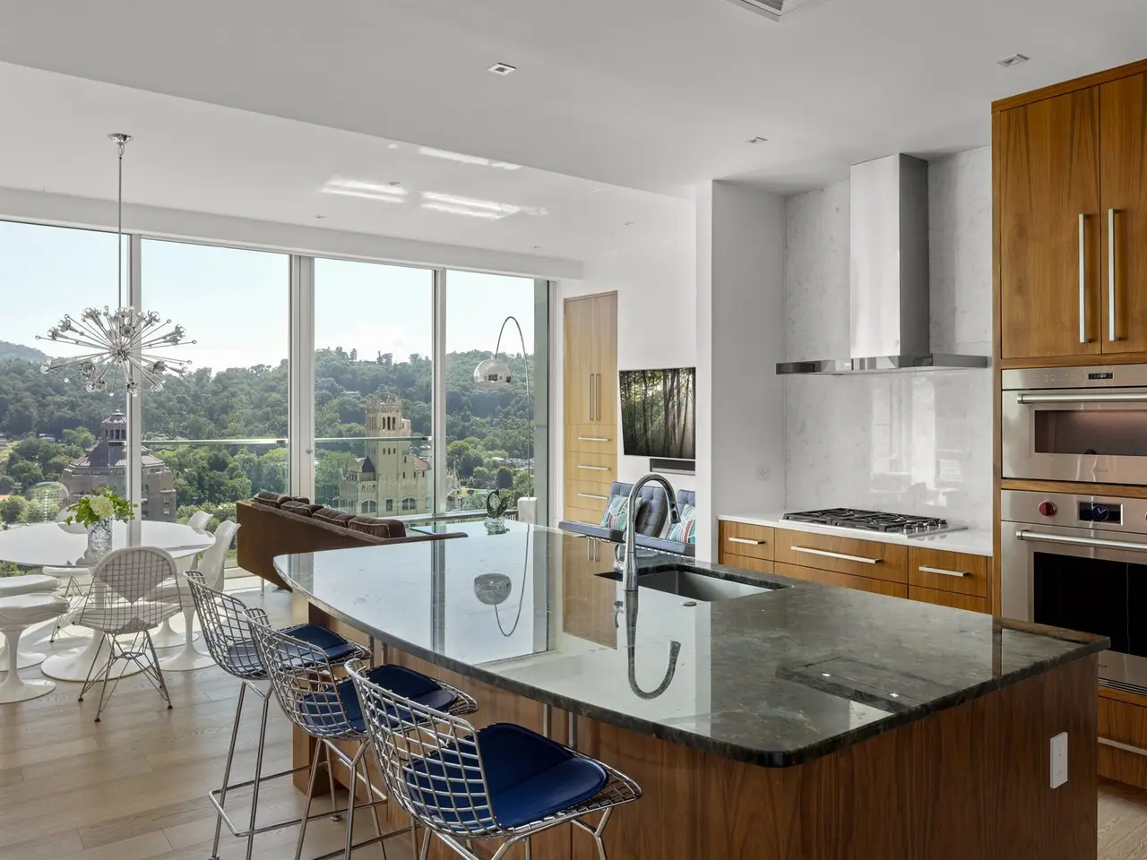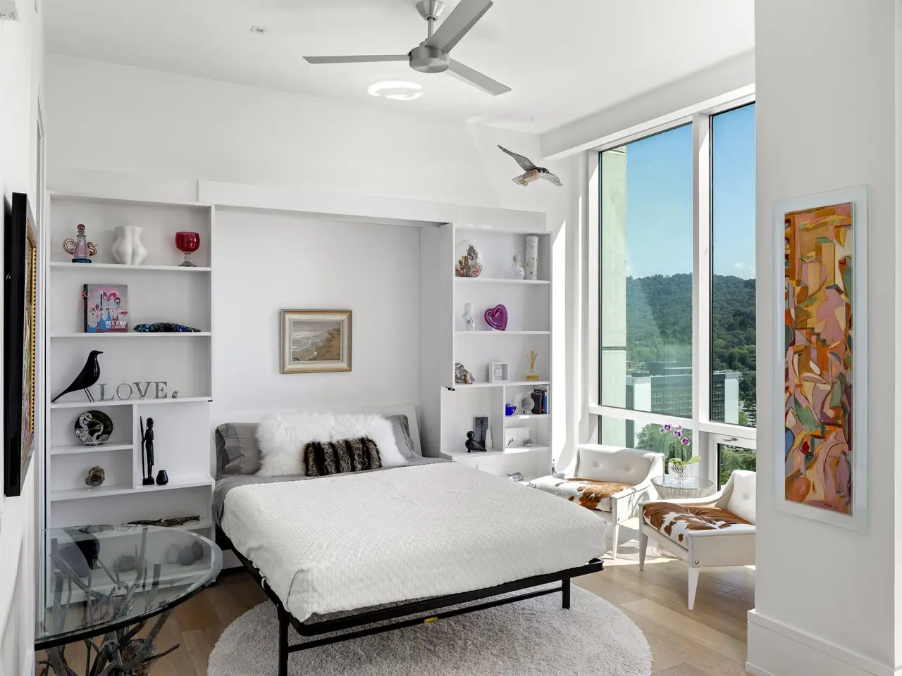 This fully customized contemporary residence in the prestigious Arras atop the Kimpton Hotel offers refined design and sweeping city and mountain views. Every inch of this residence has been thoughtfully designed with custom details. The kitchen showcases a Labradorite island and custom Walnut cabinetry by Flores Woodworking. A striking Robert Abbey Sputnik chandelier adds a modern glow, while integrated color-changing lights create the perfect ambiance at the touch of a wall-mounted control. Whether entertaining or unwinding, this home is a sophisticated sanctuary high above Asheville's vibrant streetscape. Arras residents enjoy an unmatched amenity package, including fine dining in the Arras Wine Cellar, Bargello's Mediterranean fare and more. Additional building features include a 24-hour fitness center and private massage room. Excellent security with multiple keyed access points, room service availability, and a pet-friendly policy make life here as convenient as it is luxurious.